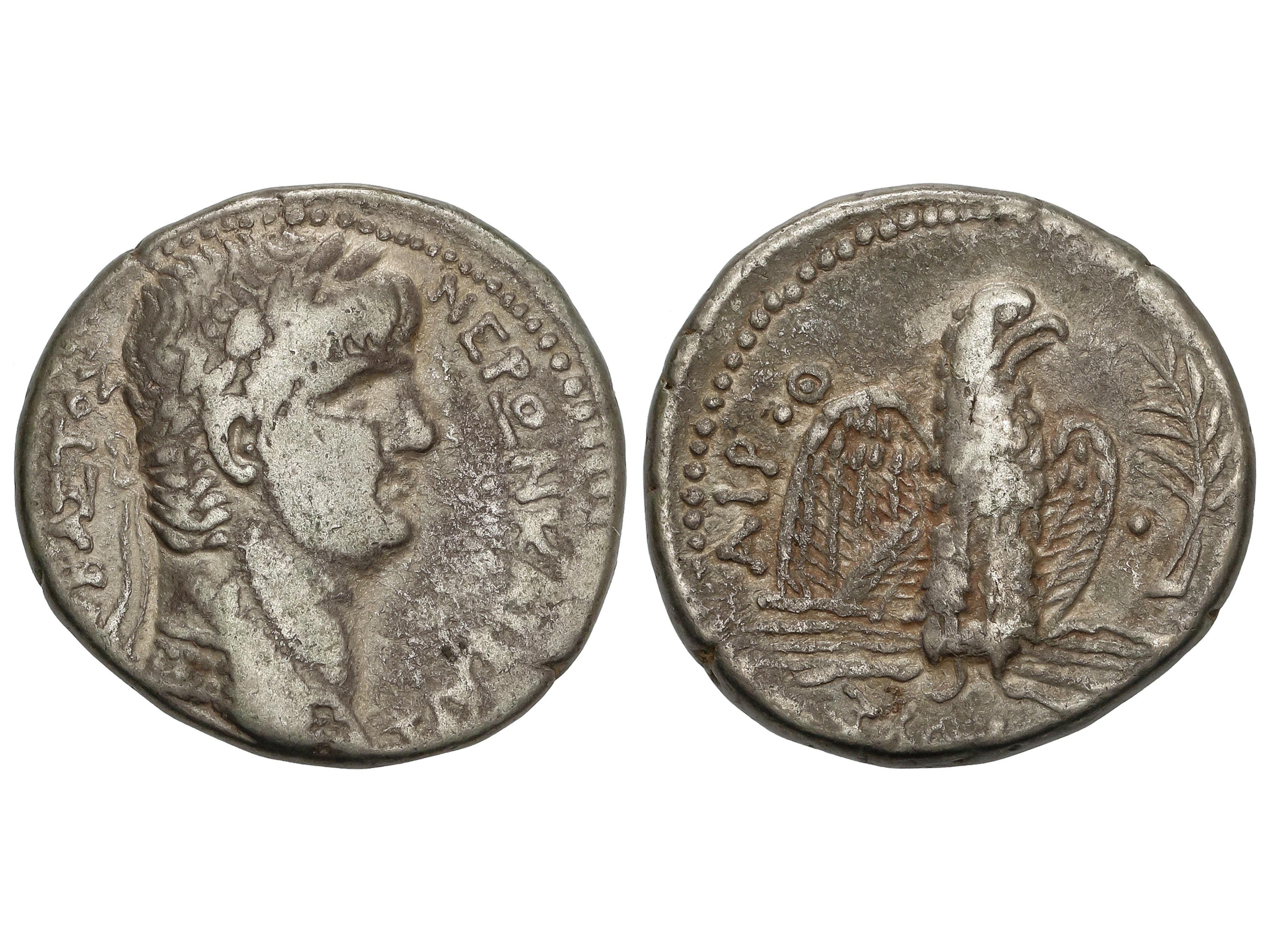Tetradracma. 54-68 d.C. NERÓN. ANTIOQUÍA (SIRIA). Anv.: Busto de Nerón laureado a derecha, alrededor leyenda. Rev.: Águila en pie a derecha sobre rayo, alrededor leyenda. 14,27 grs. AR. GIC-618. MBC. (Image1)