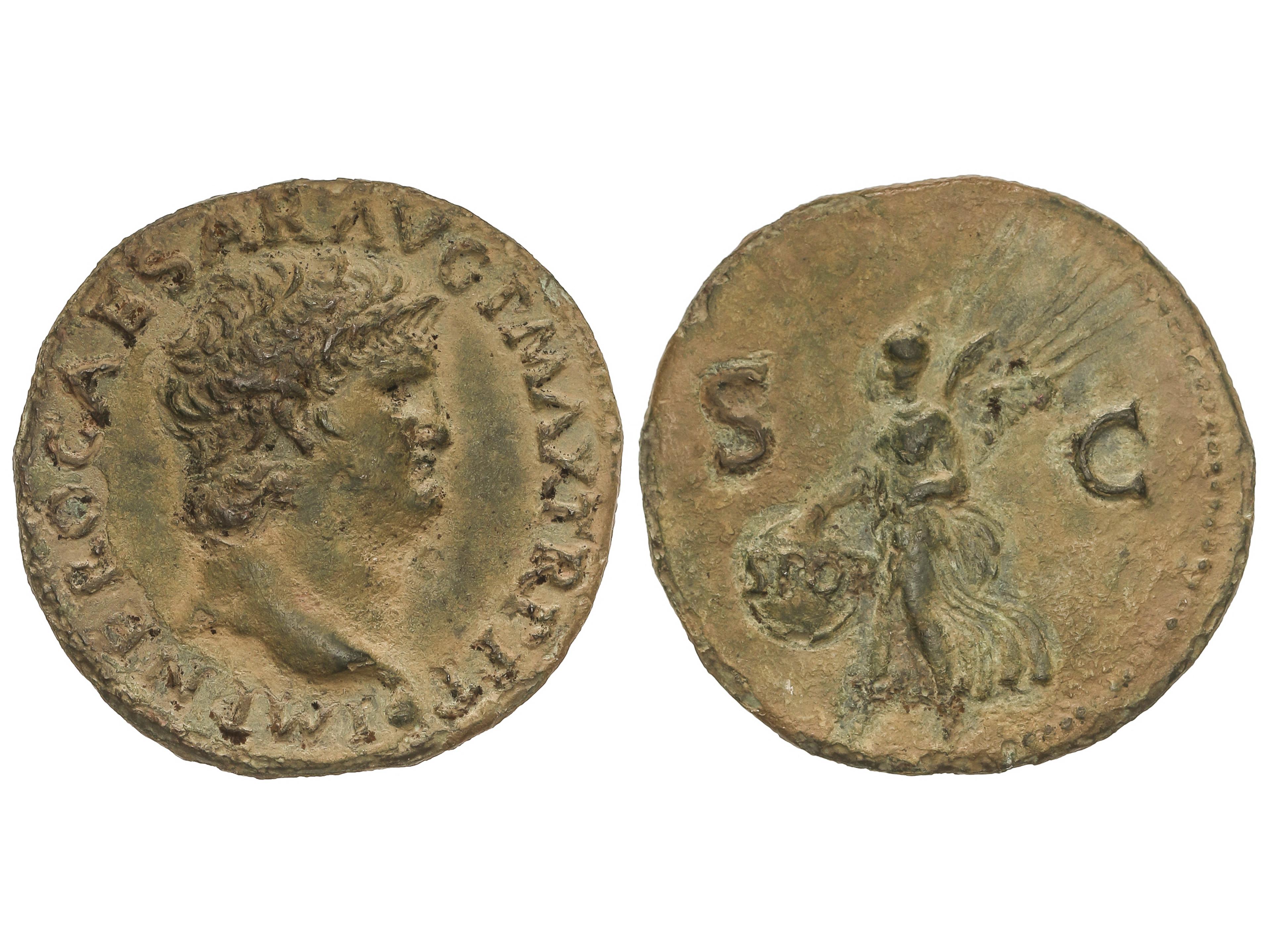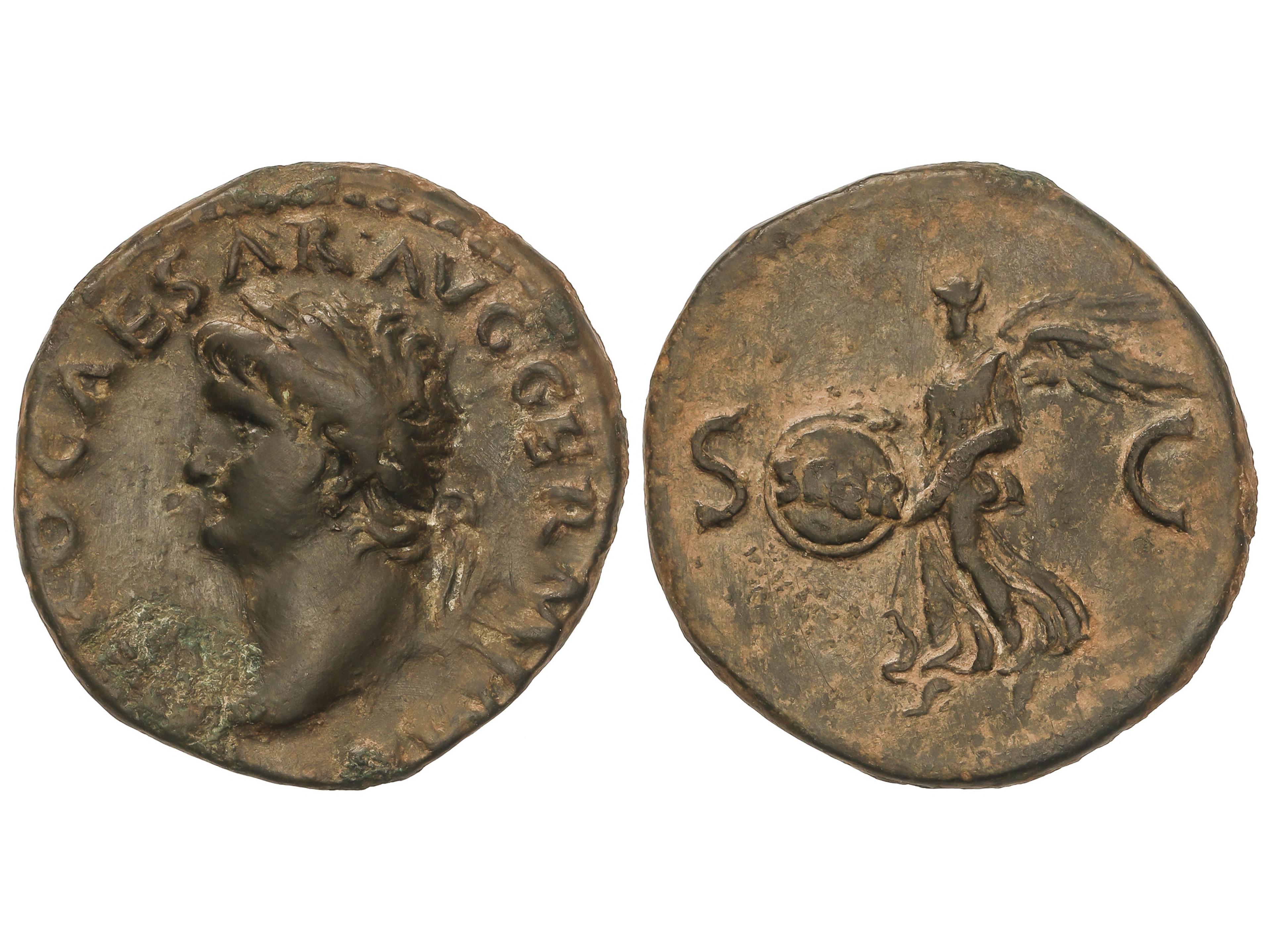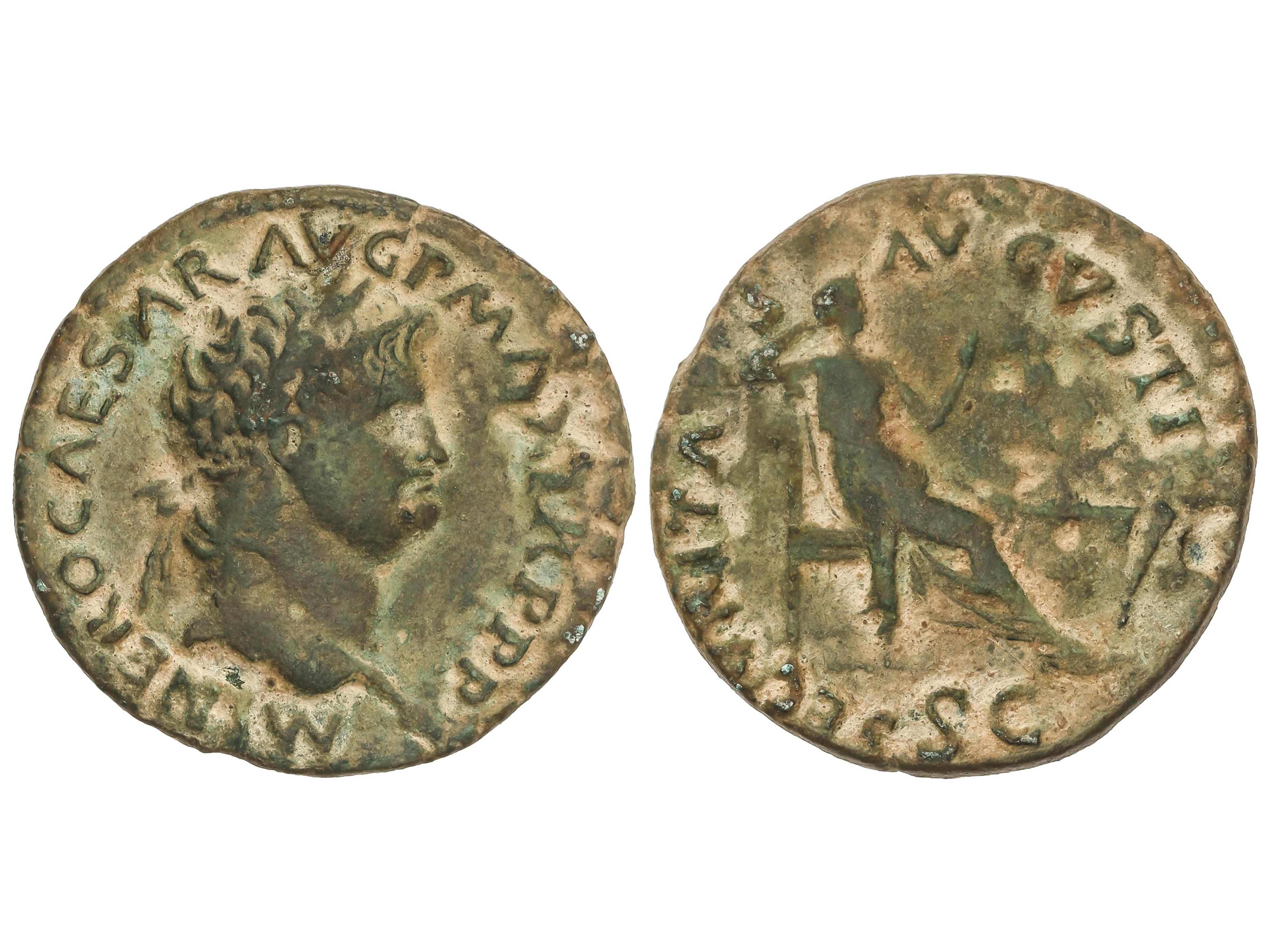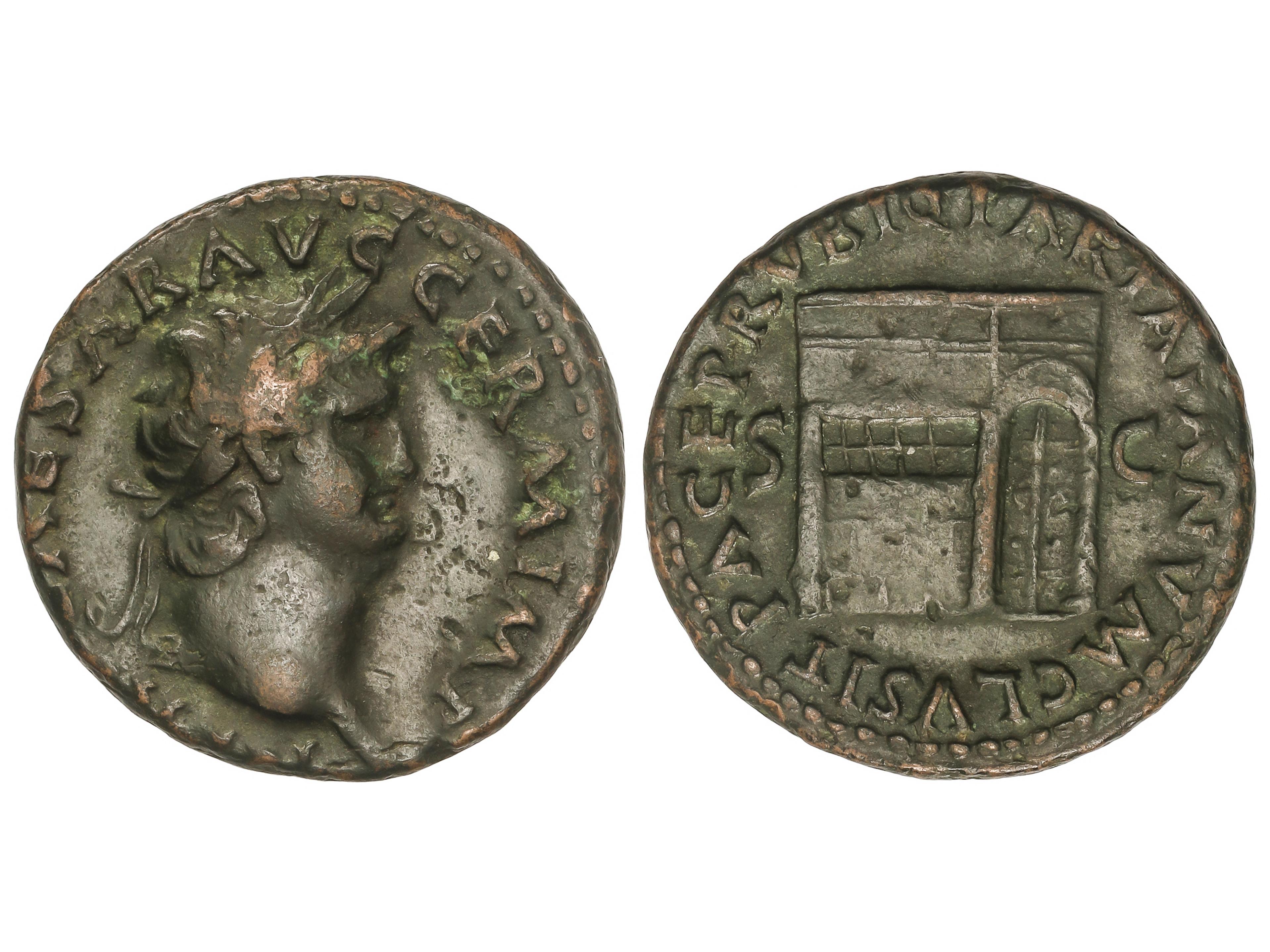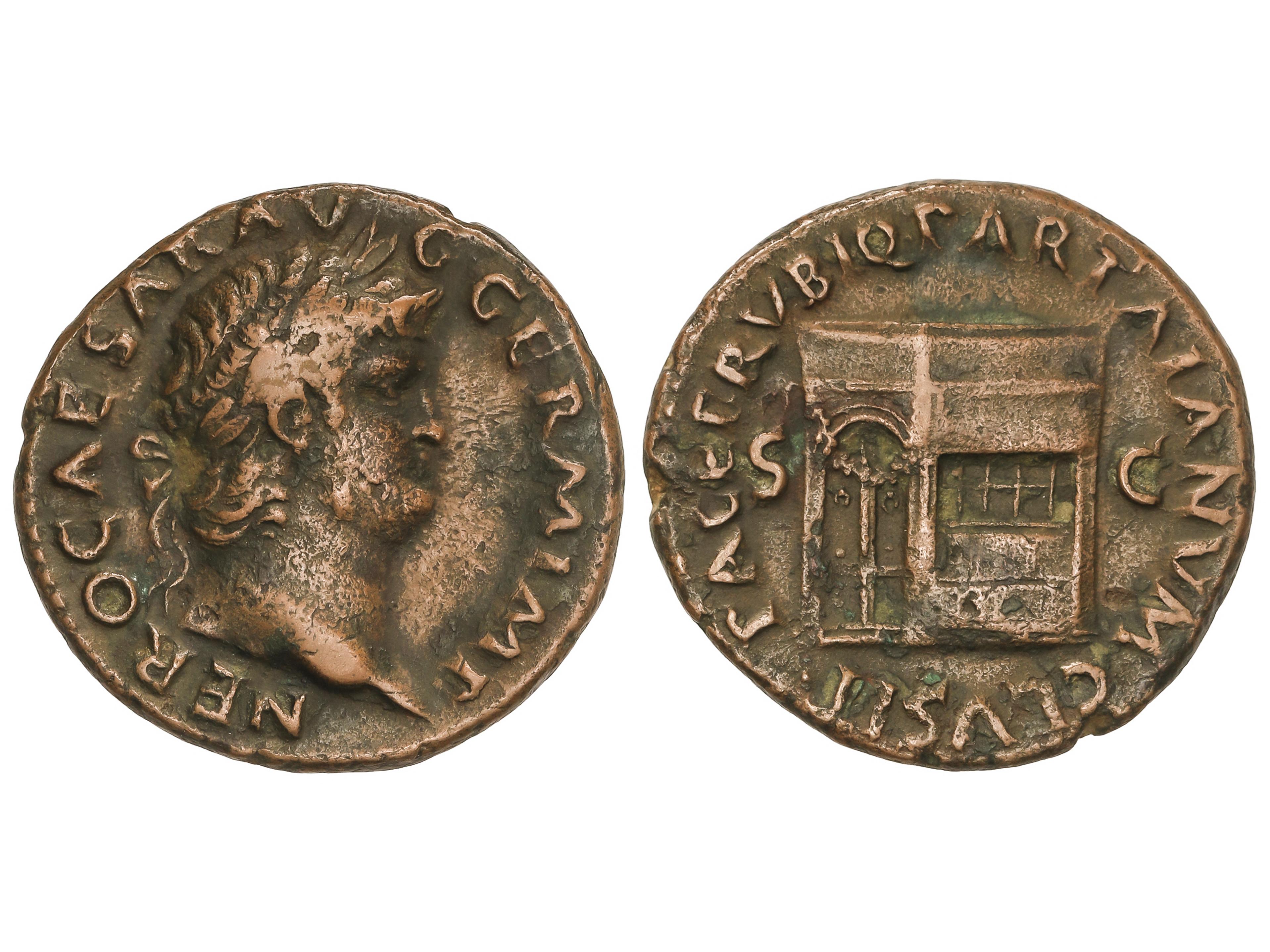 As. 54-55 d.C. NERÓN. Anv.: NERO CAESAR AVG. GERM. IMP. Cabeza laureada a derecha. Rev.: PACE P. R. VBIG. PARTA IANVM CLVSIT S. C. Templo de Jano cerrado con la puerta a derecha. 10,69 grs. AE. Pátina verde. C-171.