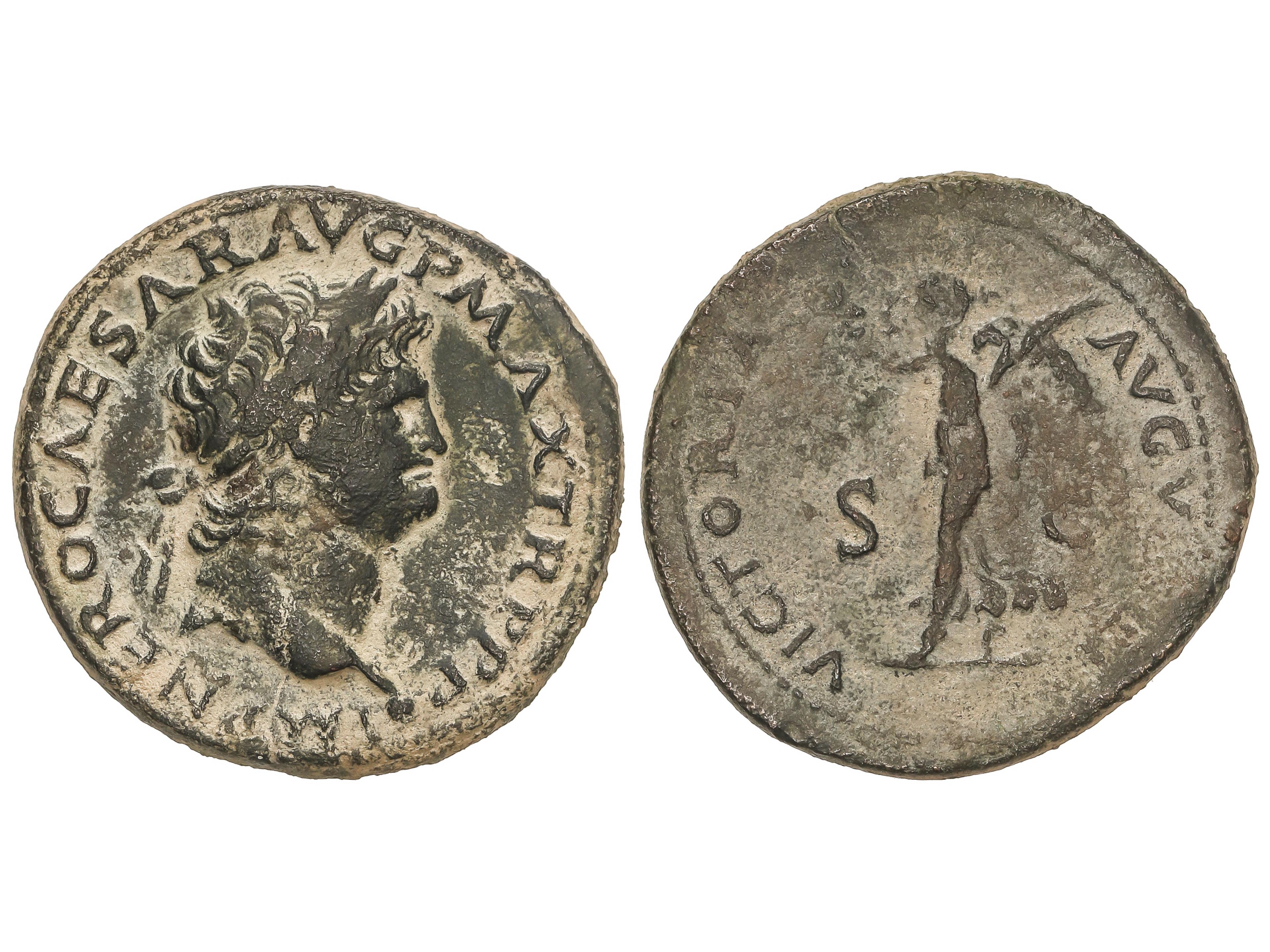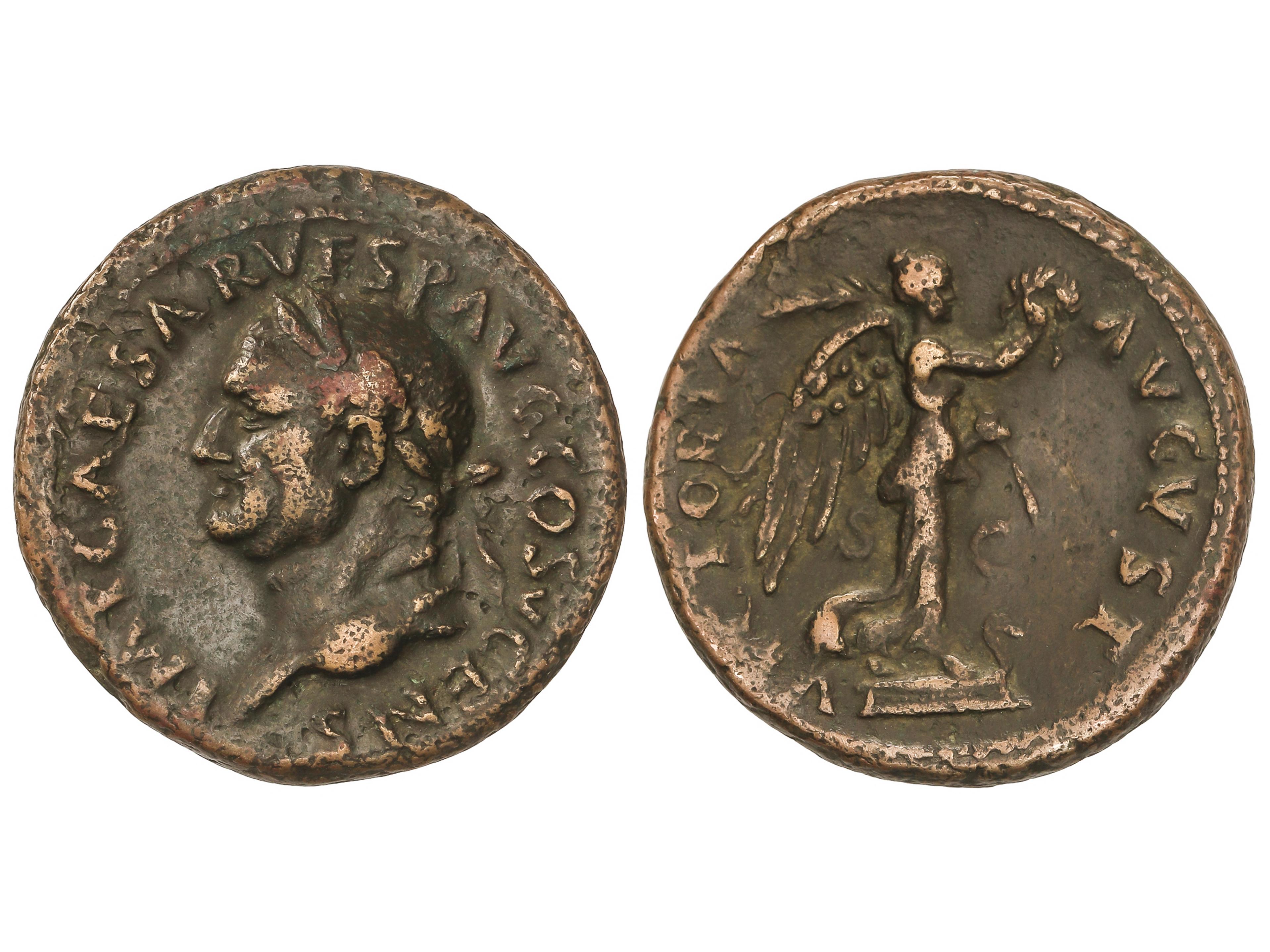 As. 74 d.C. VESPASIANO. Anv.: IMP. CAESAR VESP. AVG. COS.V. CENS. Cabeza laureada a izquierda. Rev.: VICTORIA AVGUST S.C. Victoria sobre proa a derecha con palma y corona de laurel. 10,88 grs. AE. Pátina. C-603;