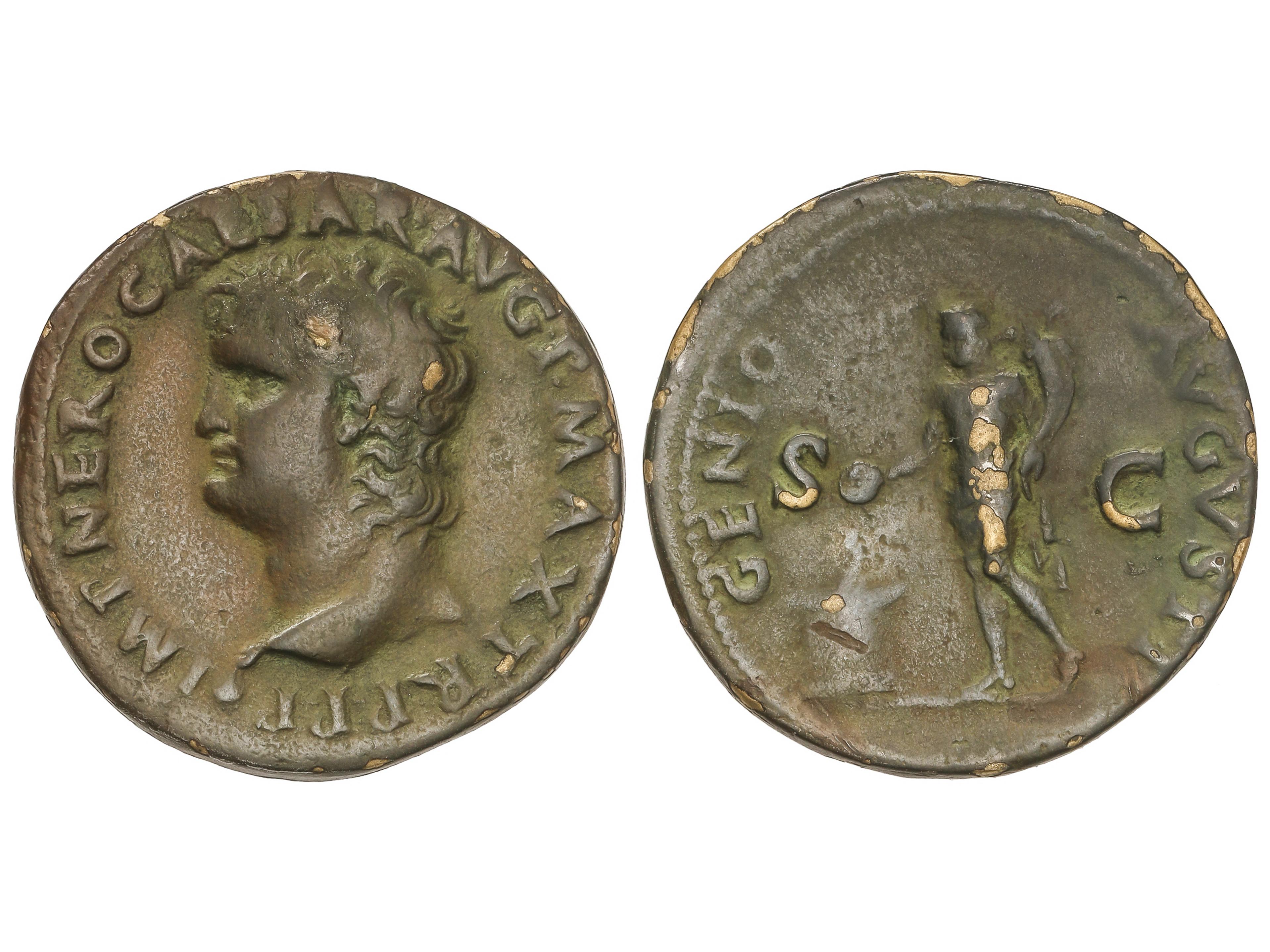 As. 54-55 d.C. NERON. Anv.: IMP. NERO CAESAR AVG. P. MAX. TR. P. P. P. Cabeza descubierta a izquierda. Rev.: GENIO AVGVSTI S. C. Genio en pie a izquierda con pátera y cornucopia, altar a sus pies. 11,05 grs. AE.