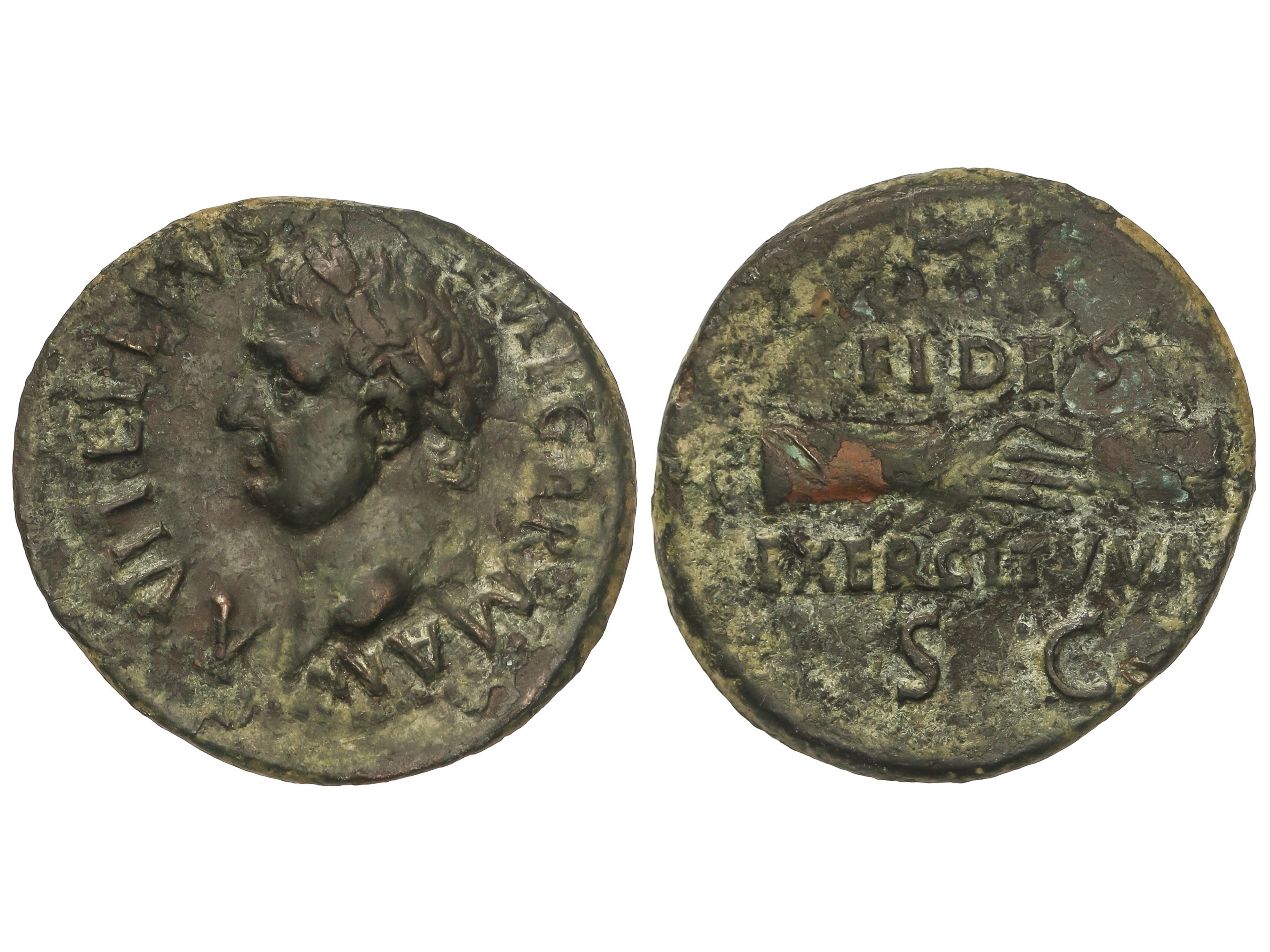 As. 69 d.C. VITELIO. TARRACO. Anv.: VITELLIVS IMP. GERMAN. Cabeza laureada a izquierda. Rev.: FIDES EXERCITVM. Manos unidas. 9,70 grs. AE. (Oxidaciones). Pátina verde. C-34. MBC. (Image1)