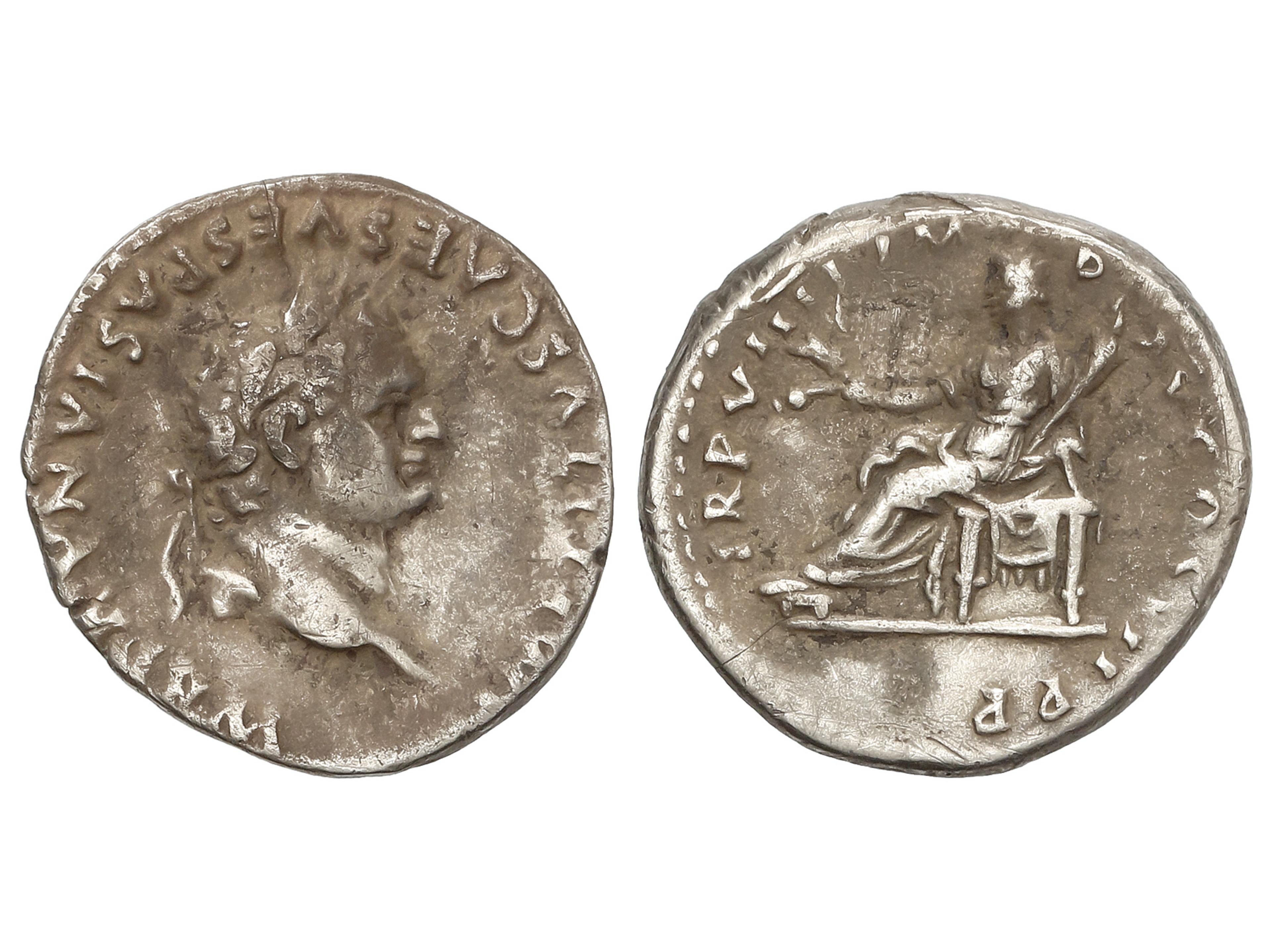 Denario. 79-81 d.C. TITO. Anv.: IMP TITVS CAES VESPASIAN AVG P M. Busto laureado a derecha. Rev.: TR P VIIII COS XIIII COS VII P P. Ceres sentada a izquierda, sosteniendo espigas y antorcha. 2,87 grs. AR. BMC-225;