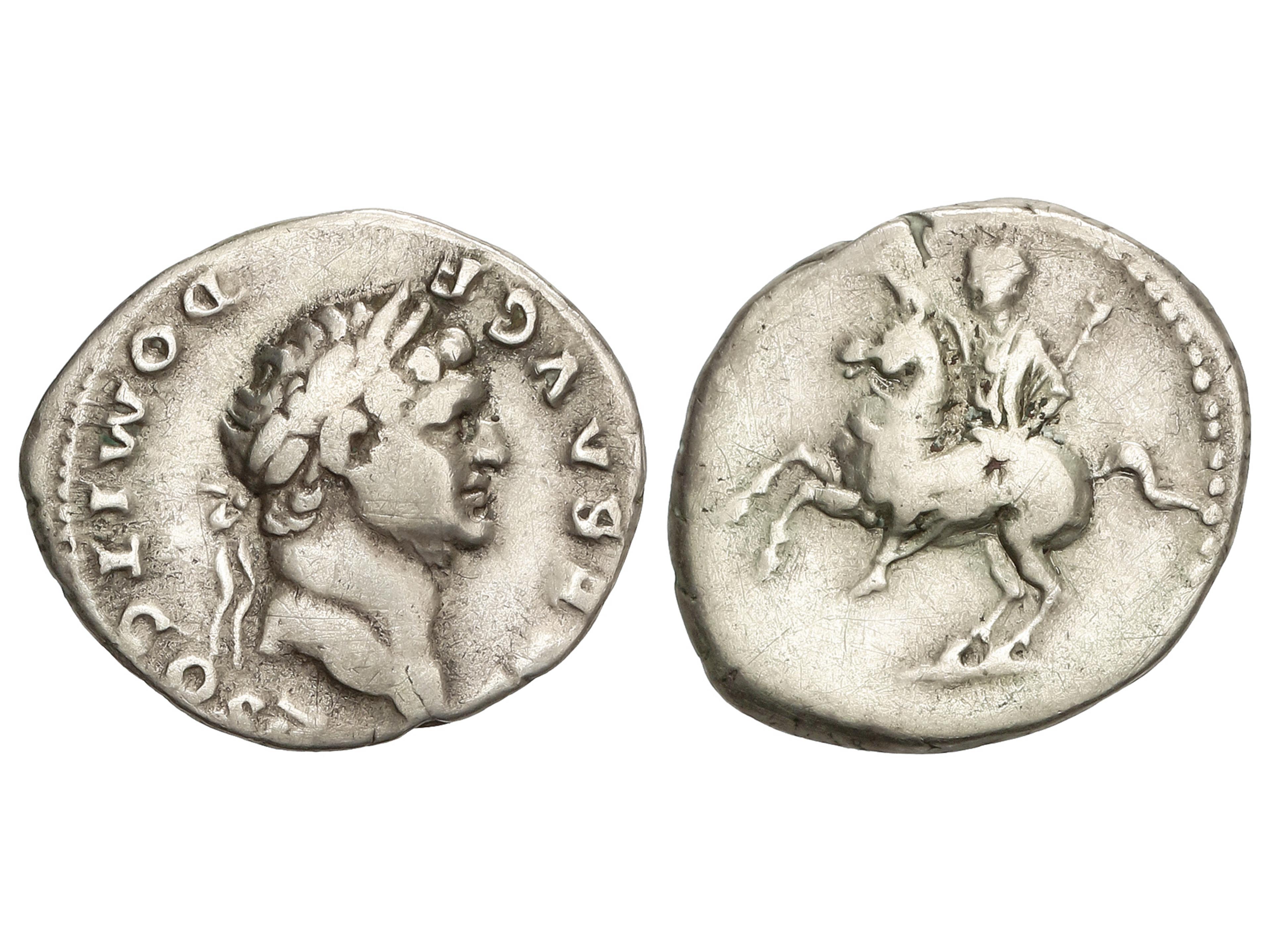 Denario. 73-75 d.C. DOMICIANO. Anv.: CAES AVG F DOMIT COS II. Cabeza laureada a derecha. Rev.: Domiciano a caballo a izquierda, levantando la mano derecha en señal de saludo y sosteniendo cetro. 3,27 grs. AR. C-664;