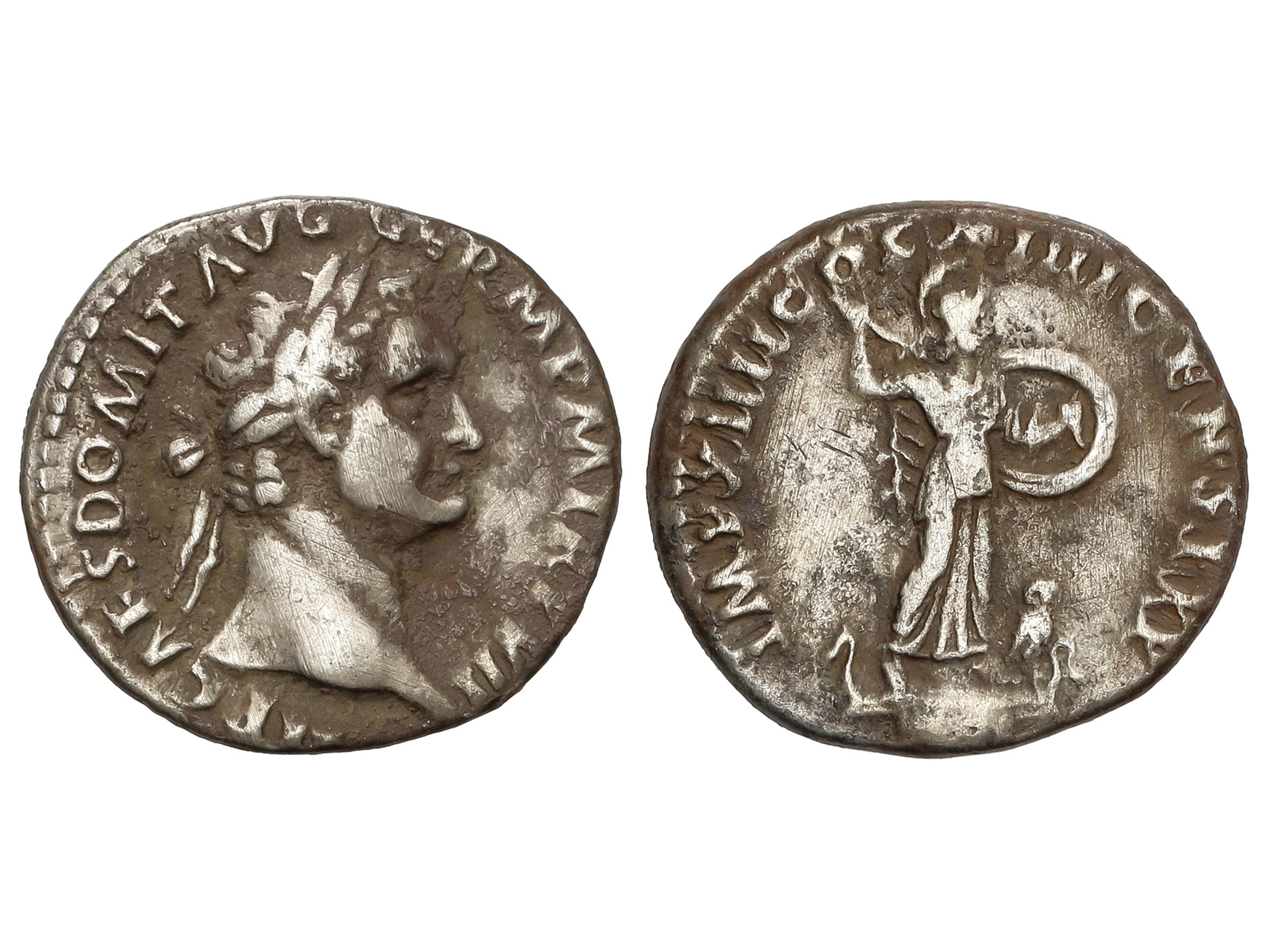 Denario. 88 d.C. DOMICIANO. Anv.: IMP. CAES. DOMIT. AVG GERM. P. M. TR. P. VII. Cabeza laureada a derecha. Rev.: IMP. XIIII COS. XIIII CENS. P. P. P. Minerva a derecha blandiendo lanza sobre proa, a los pies buho.