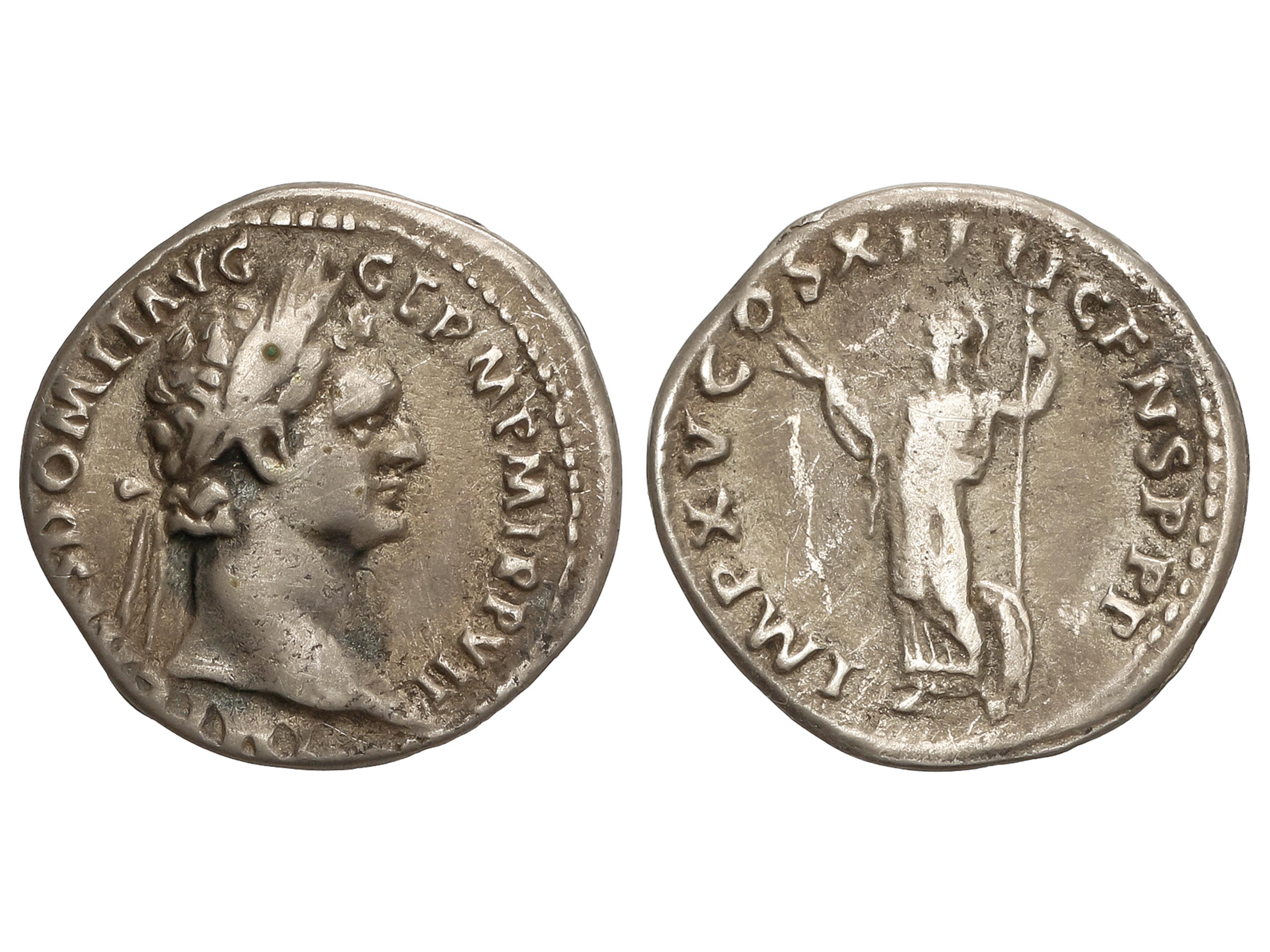 Denario. 88-89 d.C. DOMICIANO. Anv.: IMP. CAES. DOMIT. AVG. GERM. P. M. TR. P. VII. Cabeza laureada a derecha. Rev.: IMP. XV. COS. XIIII. CENS. P. P. P. Minerva en pie a izquierda sosteniendo rayo y lanza. 2,51 grs.