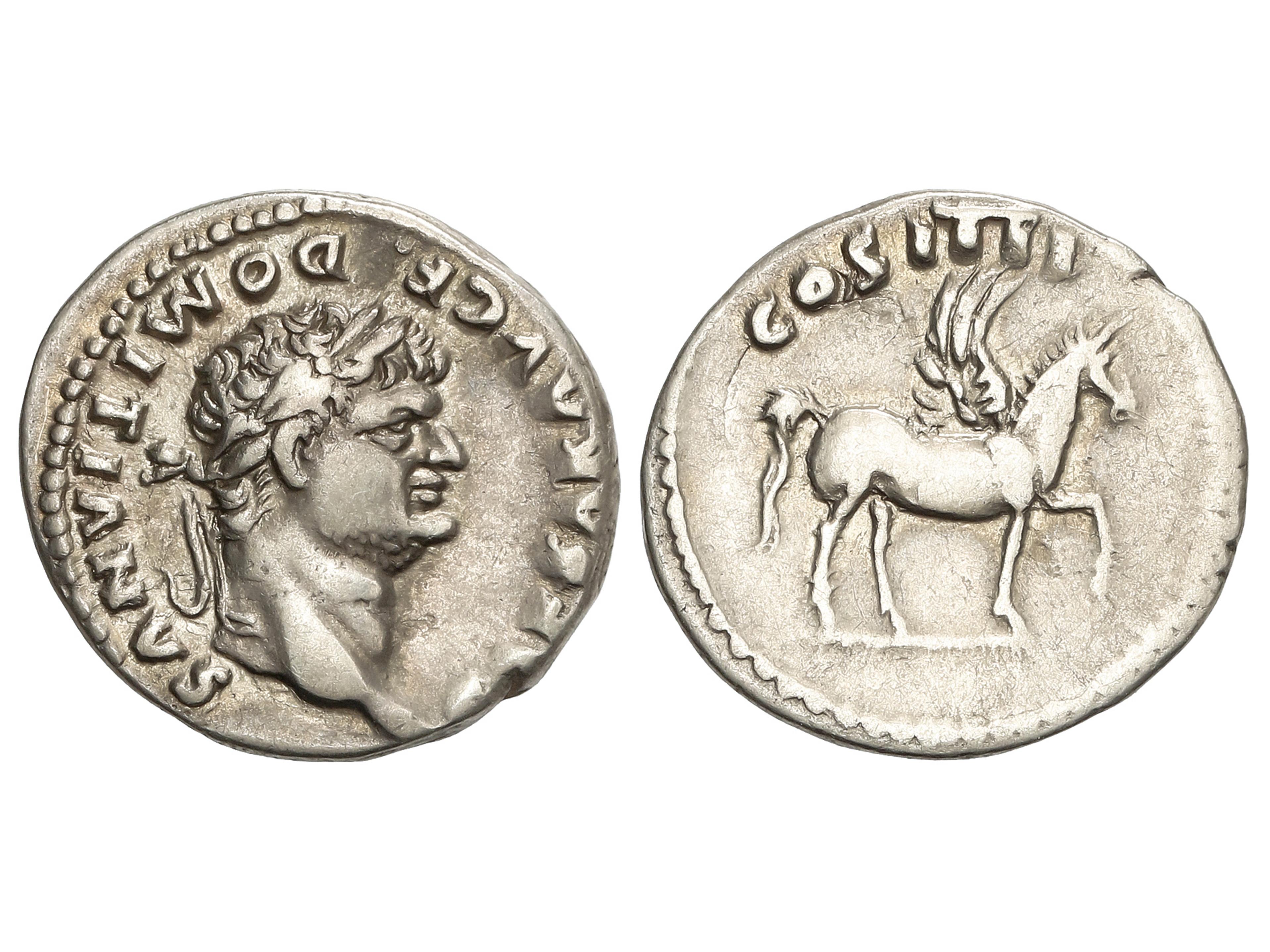 Denario. 76-80 d.C. DOMICIANO. Anv.: CAESAR AVG. F. DOMITIANVS. Cabeza laureada a derecha. Rev.: COS. IIII. Pegaso a derecha. 3,39 grs. AR. BMC-V193; C-47; RIC-V238. MBC. (Image1)