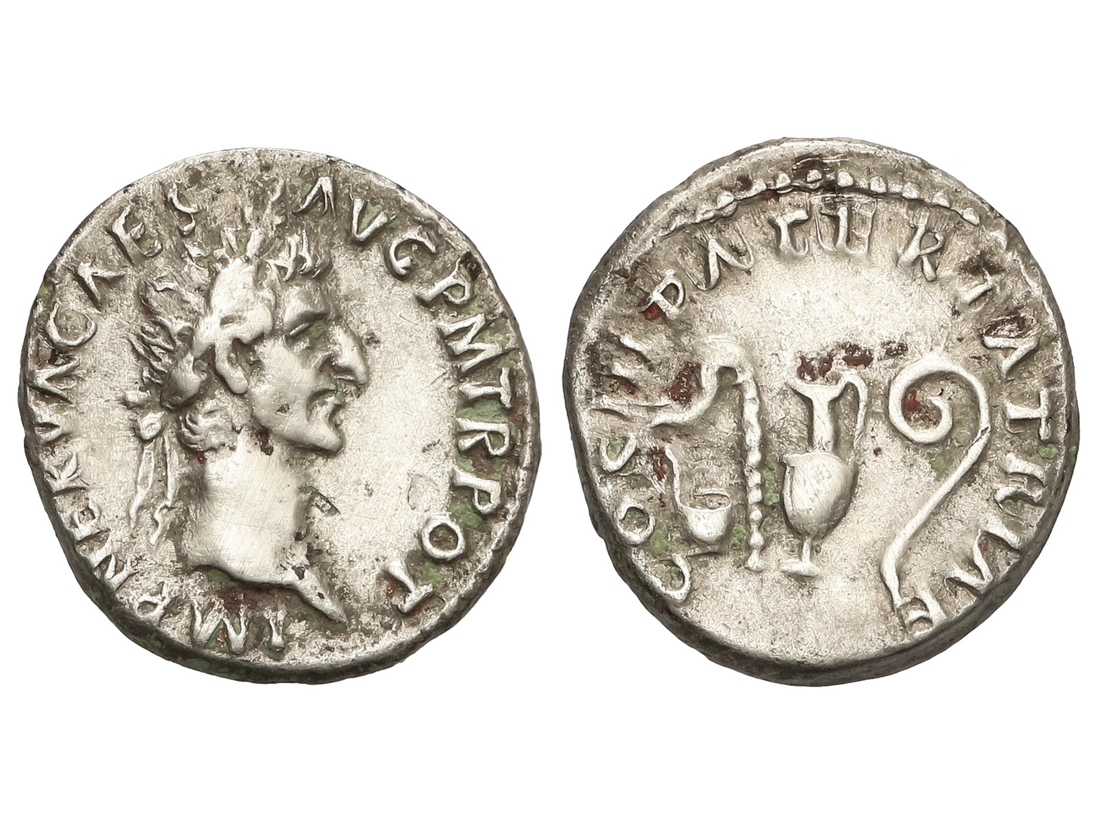 Denario. 97 d.C. NERVA. Anv.: IMP. NERVA CAES. AVG. P. M. TR. POT. Cabeza laureada a derecha. Rev.: COS. III. PATER PATRIAE. Símpulo, aspersorio, vaso de sacrificio y bastón de augur. 3,10 grs. AR. (Oxidaciones
