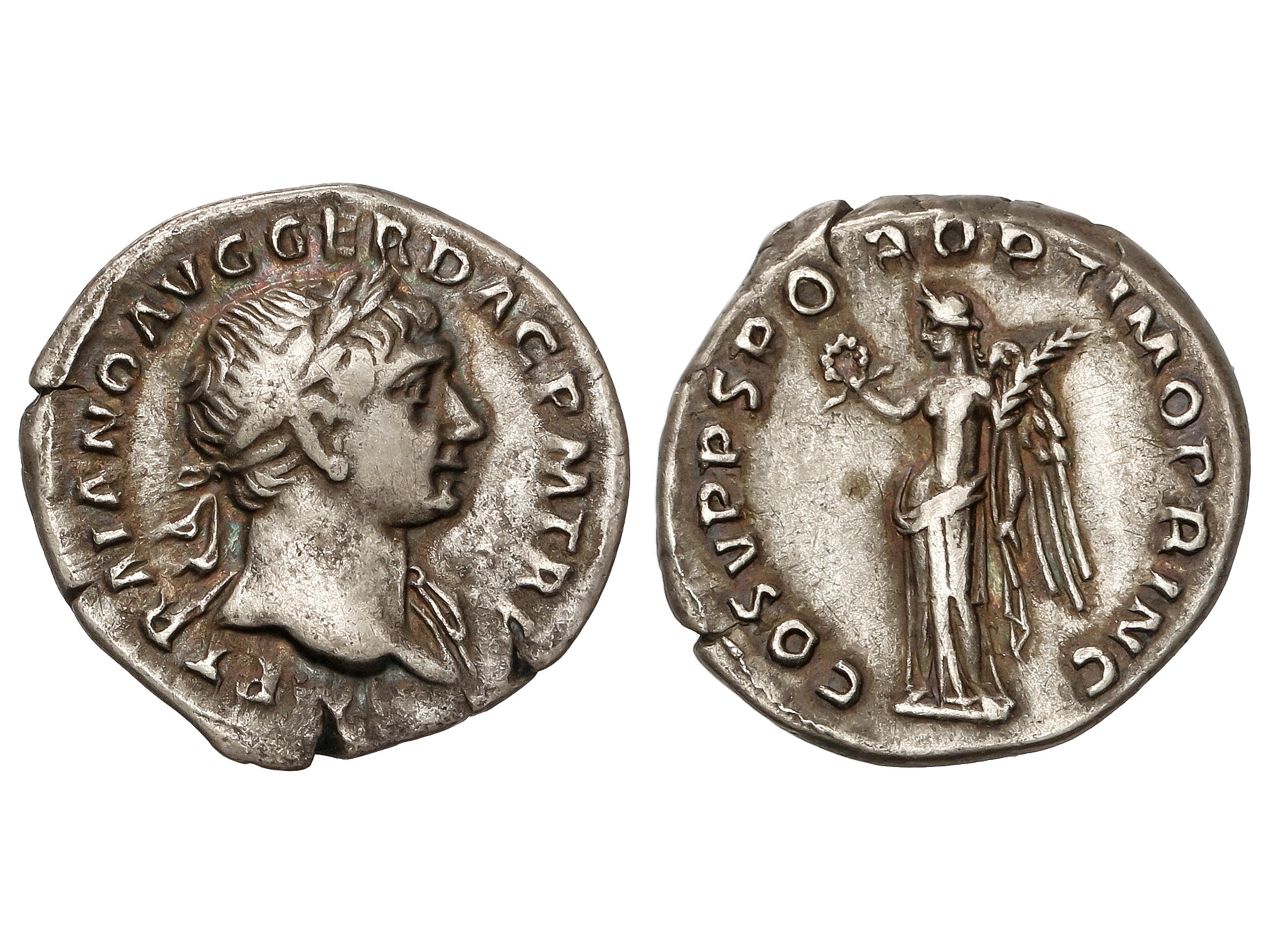 Denario. 107 d.C. TRAJANO. Anv.: IMP TRAIANO AVG GER DAC P M TR P. Cabeza laureada a derecha. Rev.: COS V PP SPQR OPTIMO PRINC. Victoria a izquierda portando corona y palma. 3,30 grs. AR. Pátina. C-75; RIC-128.