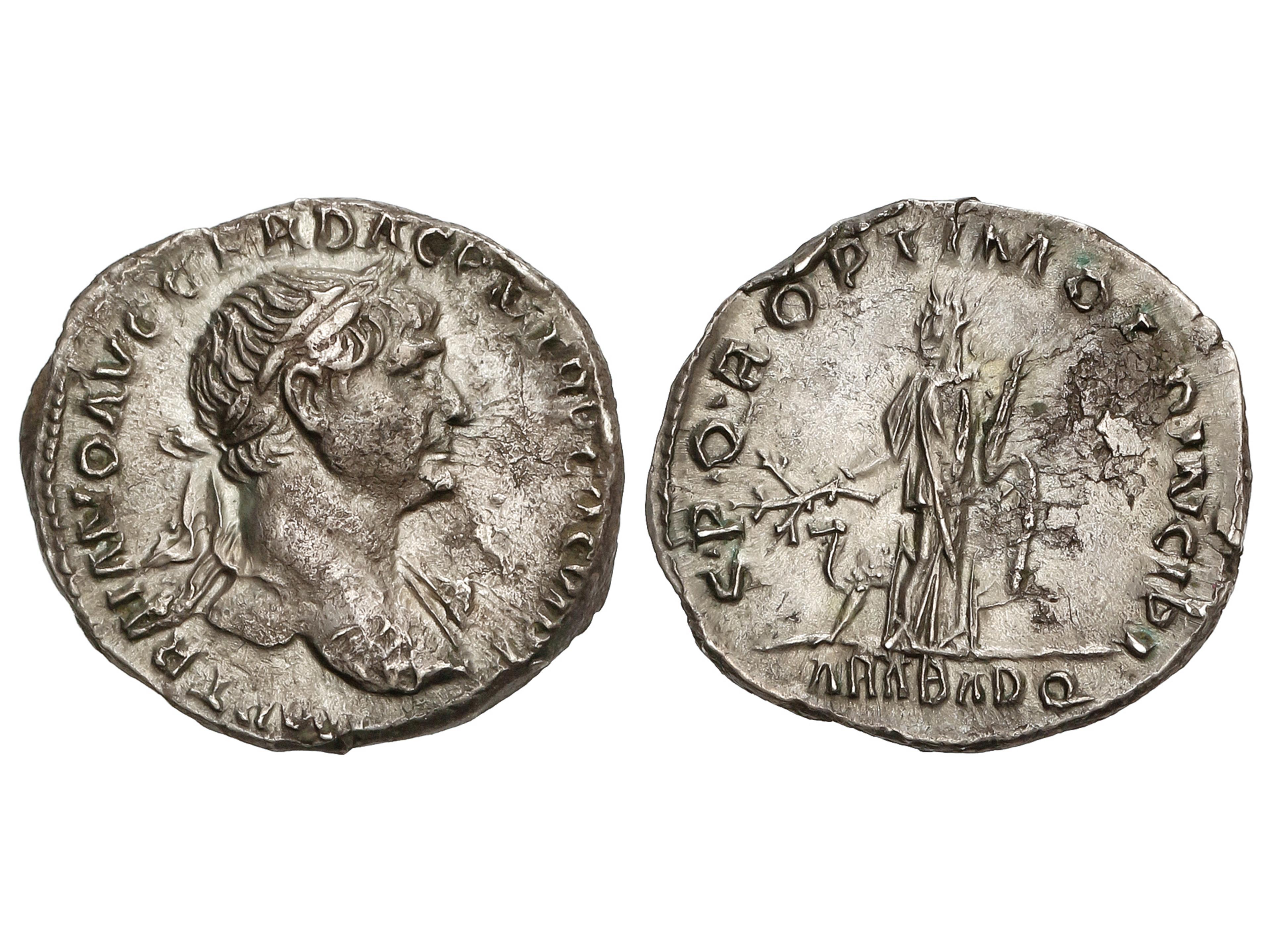 Denario. 103-112 d.C. TRAJANO. Anv.: IMP. TRAIANO AVG. GER. DAC. P. M. TR. P. Cabeza laureada a derecha. Rev.: COS. V. P. P. S. P. Q. R. OPTIMO PRINC. Felicidad en pie a izquierda con caduceo y cornucopia. 3,42 grs.