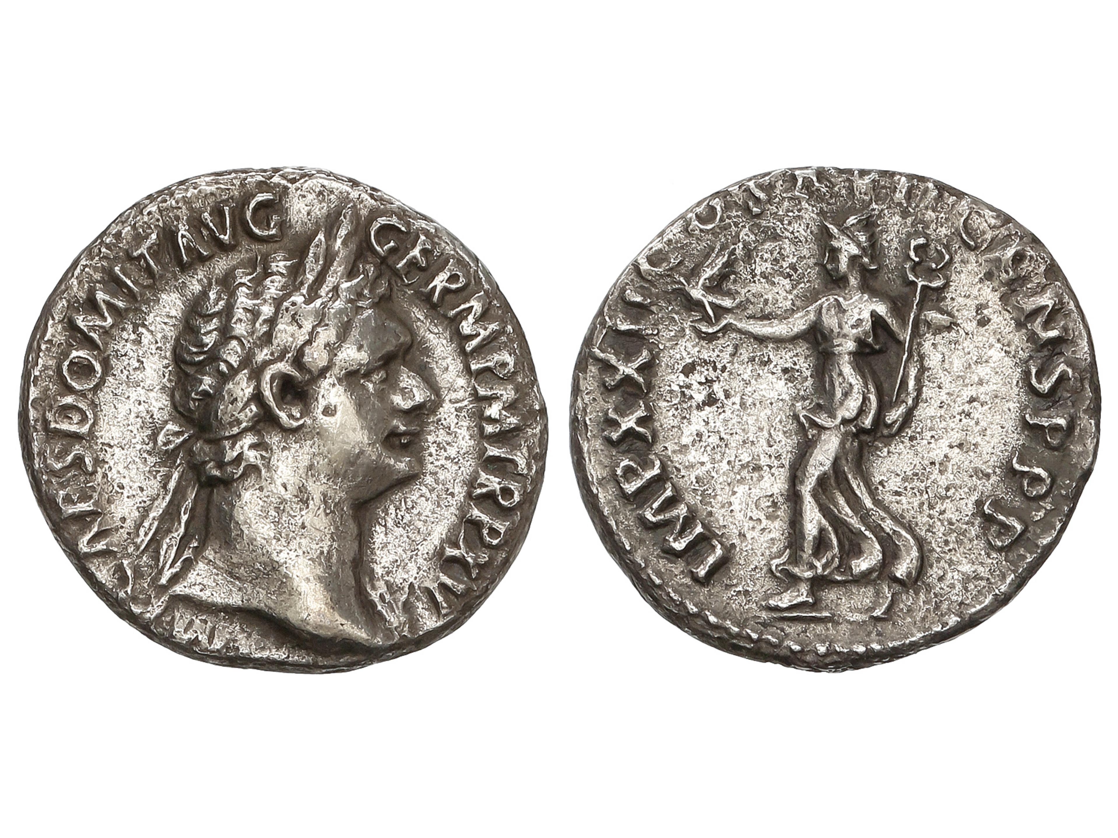 Denario. 96 d.C. DOMICIANO. Anv.: IMP. CAES. DOMIT. AVG GERM. P. M. TR. P. XV. Cabeza laureada a derecha. Rev.: IMP. XXII COS. XVII CENS. P. P. P. Maia avanzando a izquierda con una paloma y un caduceo. 2,90 grs. AR.