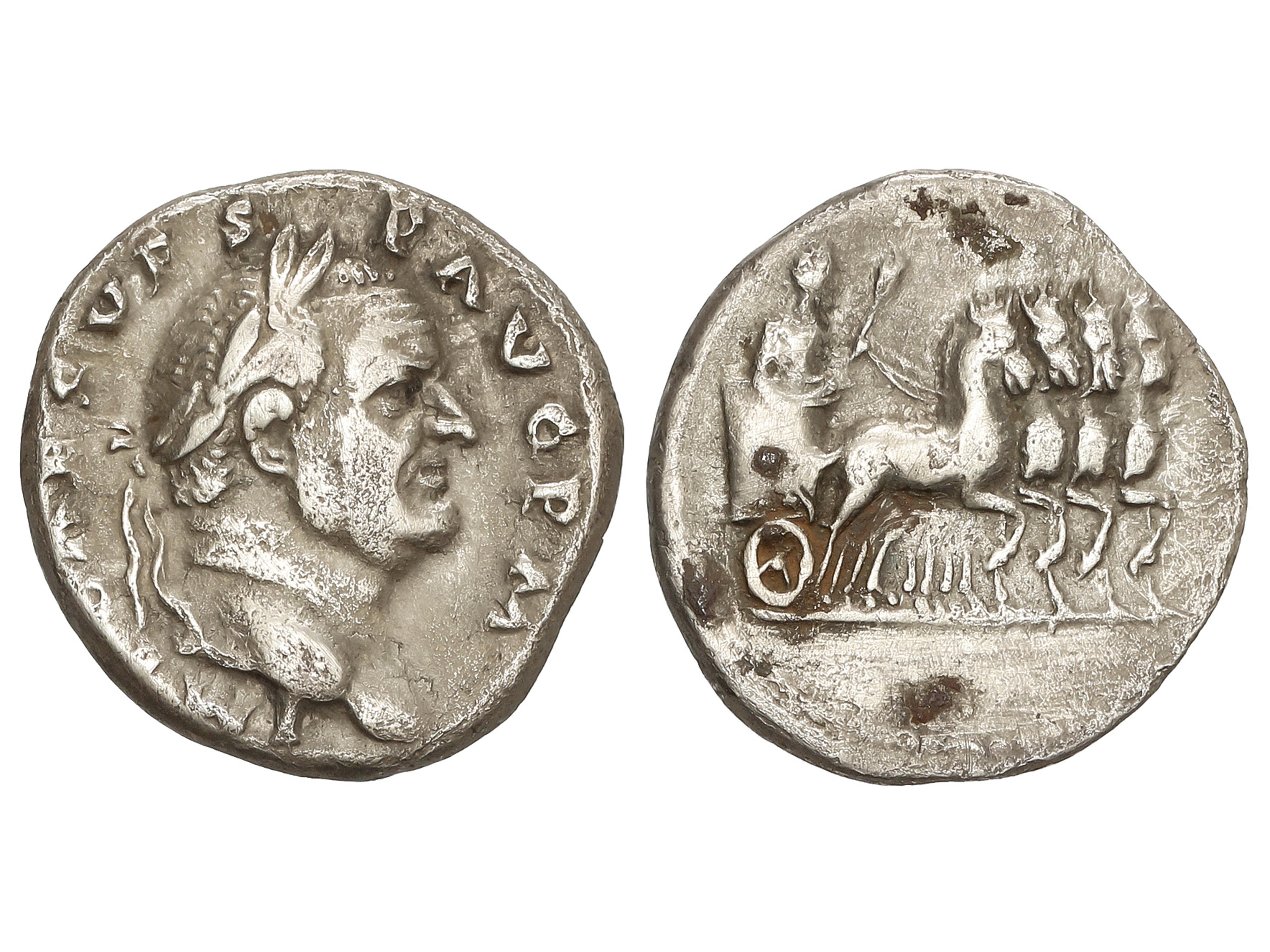 Denario. 72-73 d.C. VESPASIANO. Anv.: IMP CAES VESP AVG P M COS IIII. Cabeza laureada a derecha. Rev.: Vespasiano en cuadriga a derecha con palma y cetro. 3,28 grs. AR. C-643; RIC-1559. MBC. (Image1)