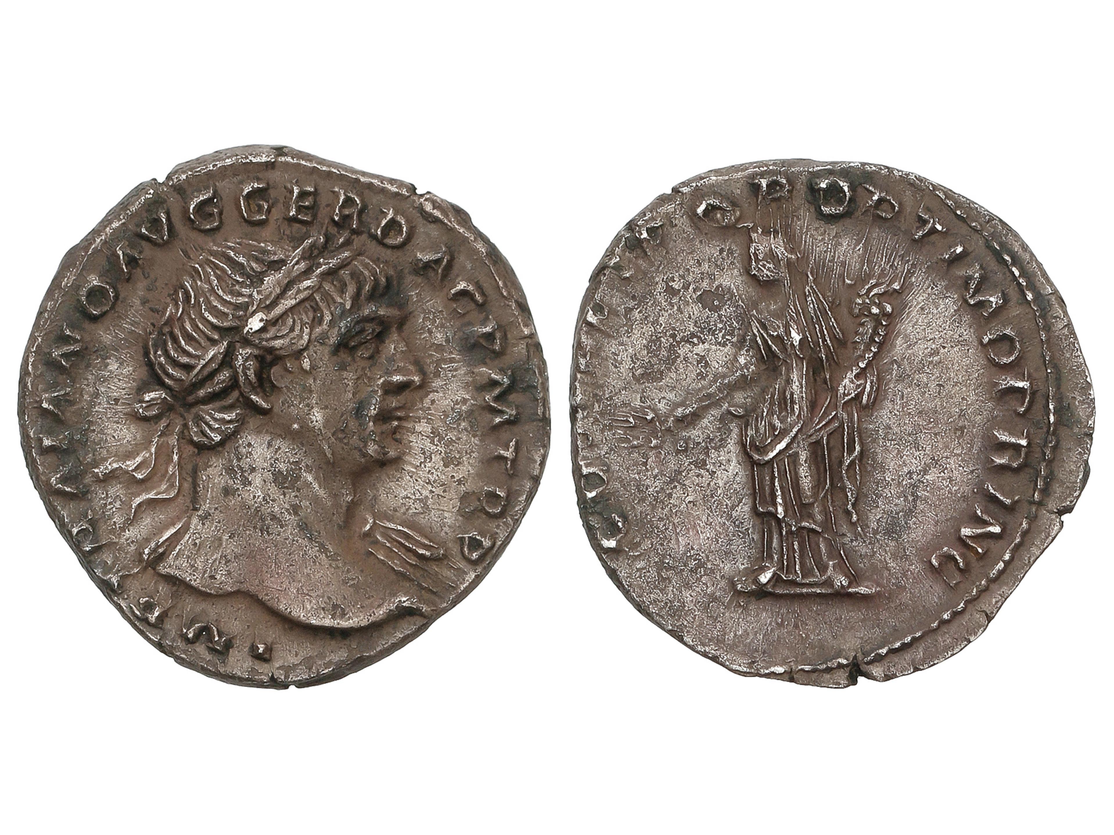 Denario. 103-112 d.C. TRAJANO. Anv.: IMP. TRAIANO AVG. GER. DAC. P. M. TR. P. Cabeza laureada a derecha. Rev.: COS. V. P. P. S. P. Q. R. OPTIMO PRINC. Felicidad en pie a izquierda con caduceo y cornucopia. 3,42 grs.