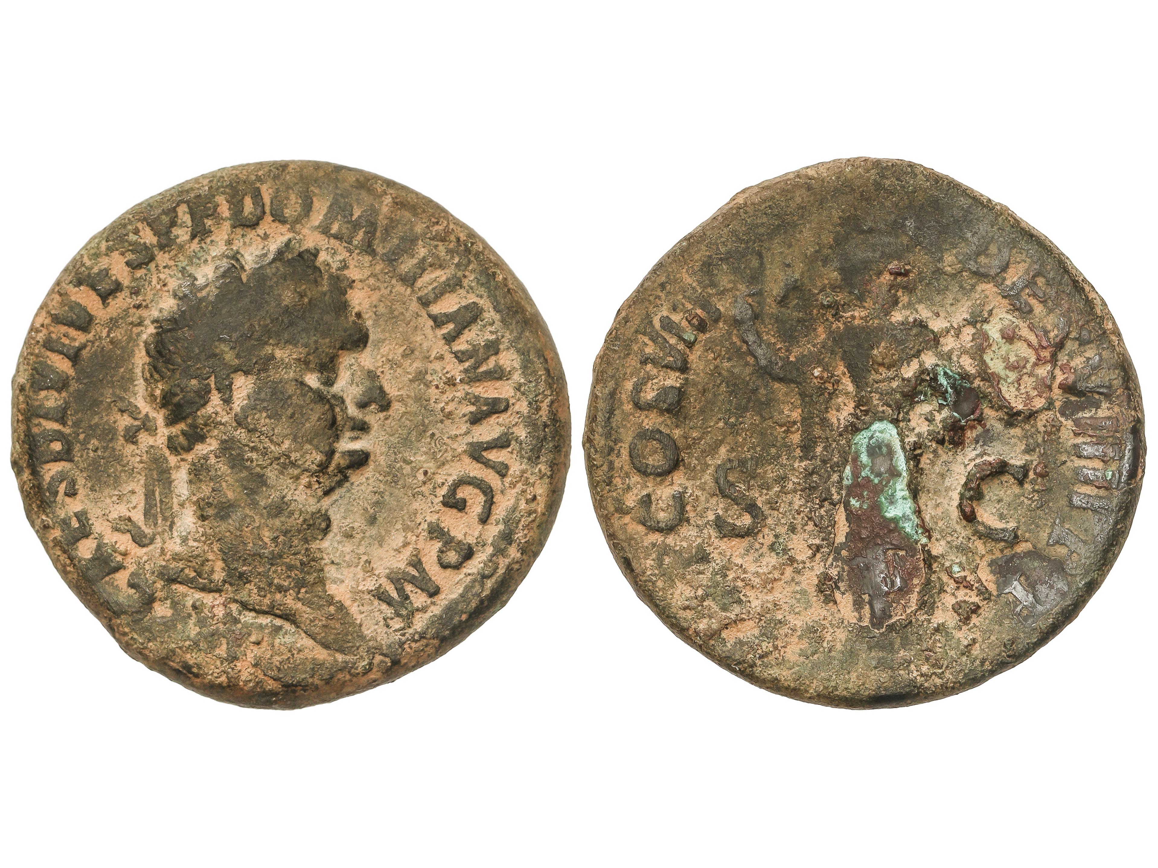 Sestercio. 82 d.C. DOMICIANO. Anv.: IMP. CAES. DIVI. VESP. F. DOMITIAN. AVG. P. M. Cabeza laureada a derecha. Rev.: TR. P. COS. VIII DES. VIIII. P. P. S. C. Palas en pie a izquierda con lanza. 21,52 grs. AE.