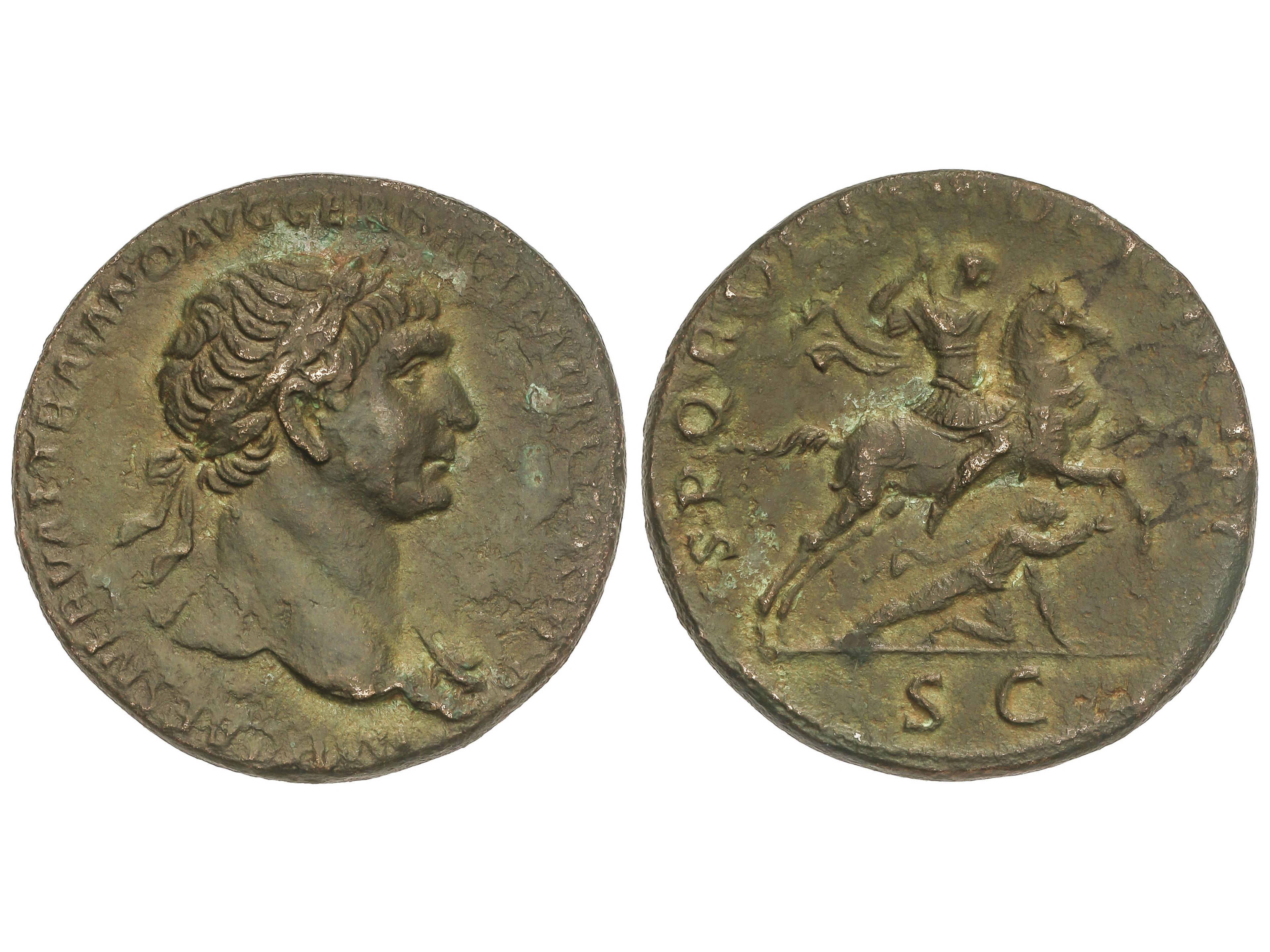 Sestercio. 104-110 d.C. TRAJANO. Anv.: IMP. CAES. NERVAE TRAIANO AVG. GER. DAC. P. M. TR. P. COS. V P. P. Busto laureado a derecha. Rev.: S. P. Q. R. OPTIMO PRINCIPI S. C. Trajano a galope a derecha con lanza y