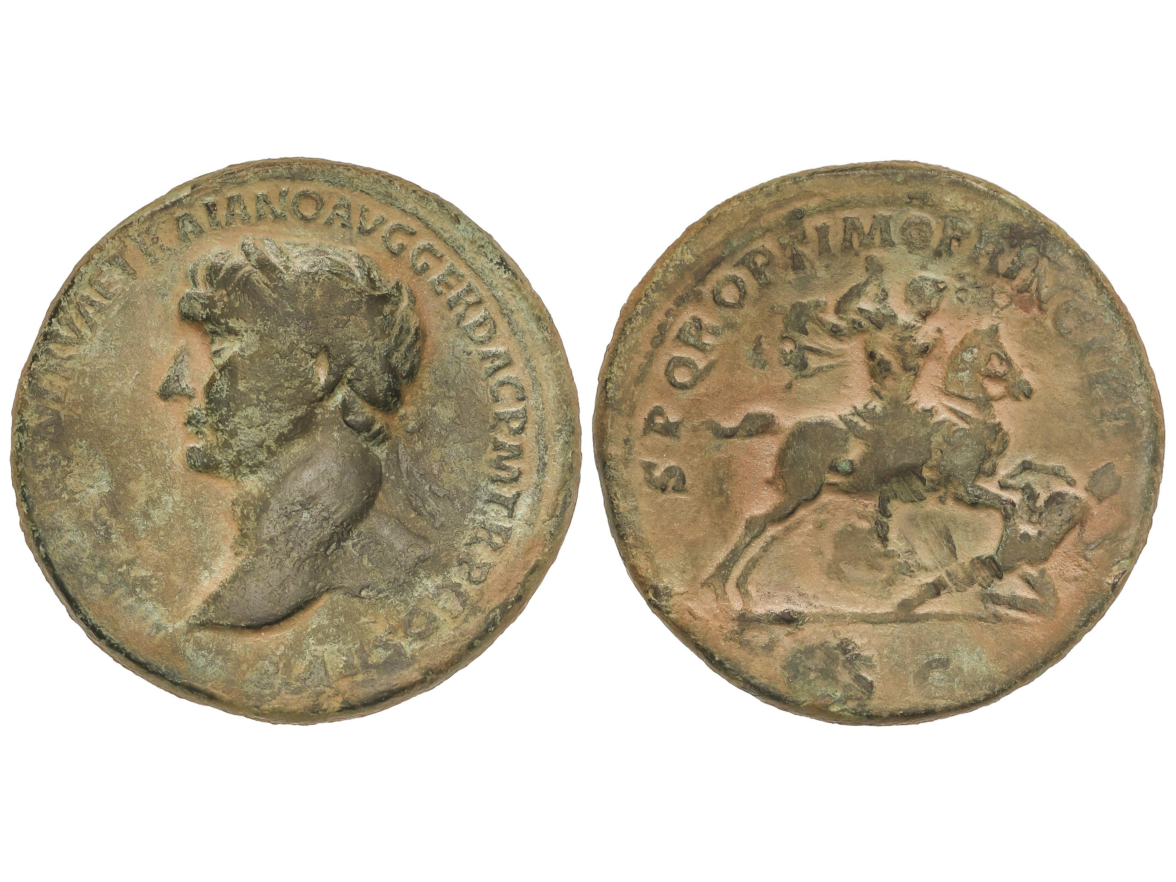 Sestercio. 104-110 d.C. TRAJANO. Anv.: IMP. CAES. NERVAE TRAIANO AVG. GER. DAC. P. M. TR. P. COS. V P. P. Busto laureado a derecha. Rev.: S. P. Q. R. OPTIMO PRINCIPI S. C. Trajano a galope a derecha con lanza y