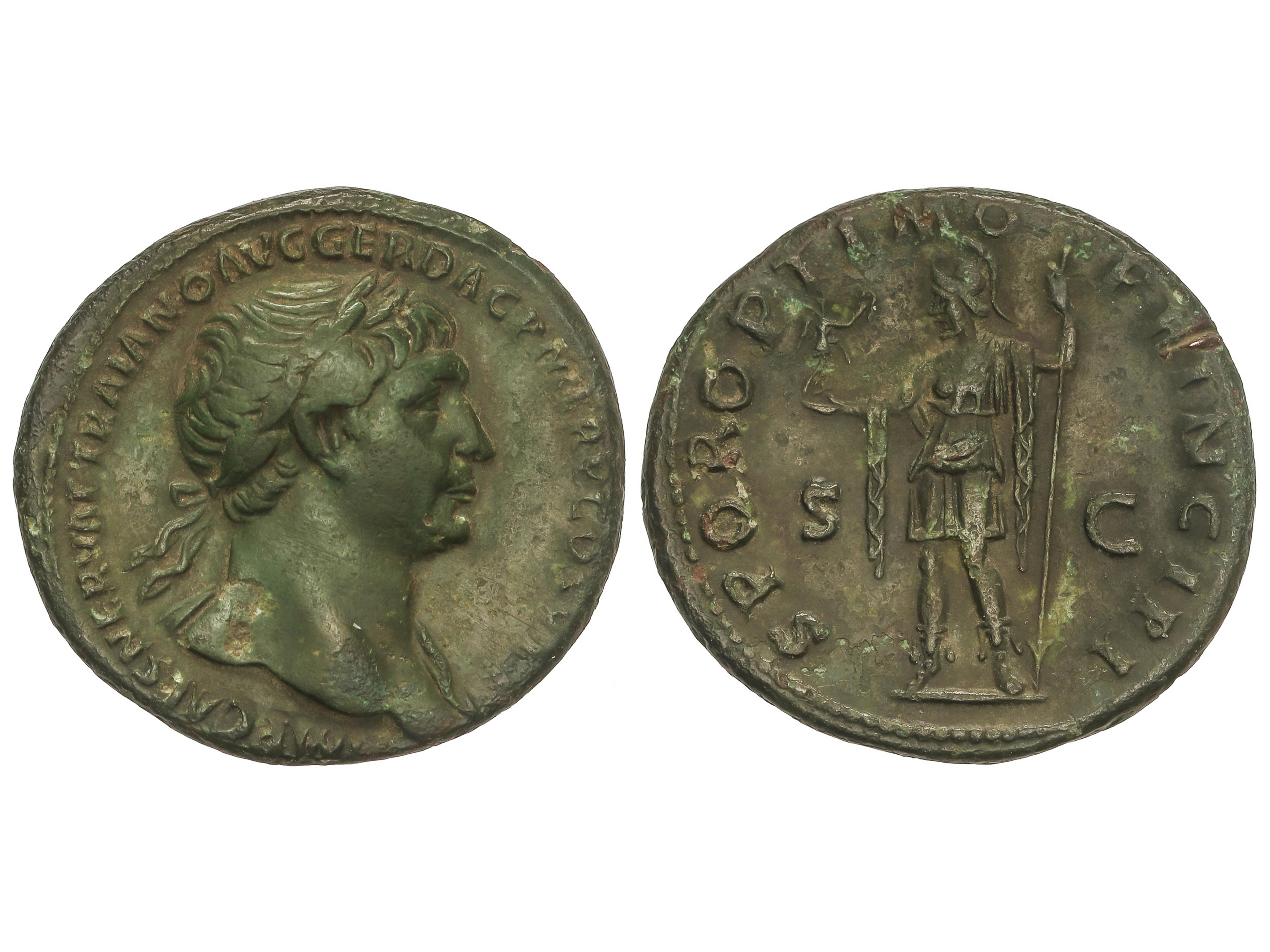 Sestercio. 104-110 d.C. TRAJANO. Anv.: IMP. CAES. NERVAE TRAIANO AVG. GER. DAC. P. M. TR. P. COS. V P. P. Busto laureado a derecha. Rev.: S. P. Q. R. OPTIMO PRINCIPI S. C. Trajano a galope a derecha con lanza y