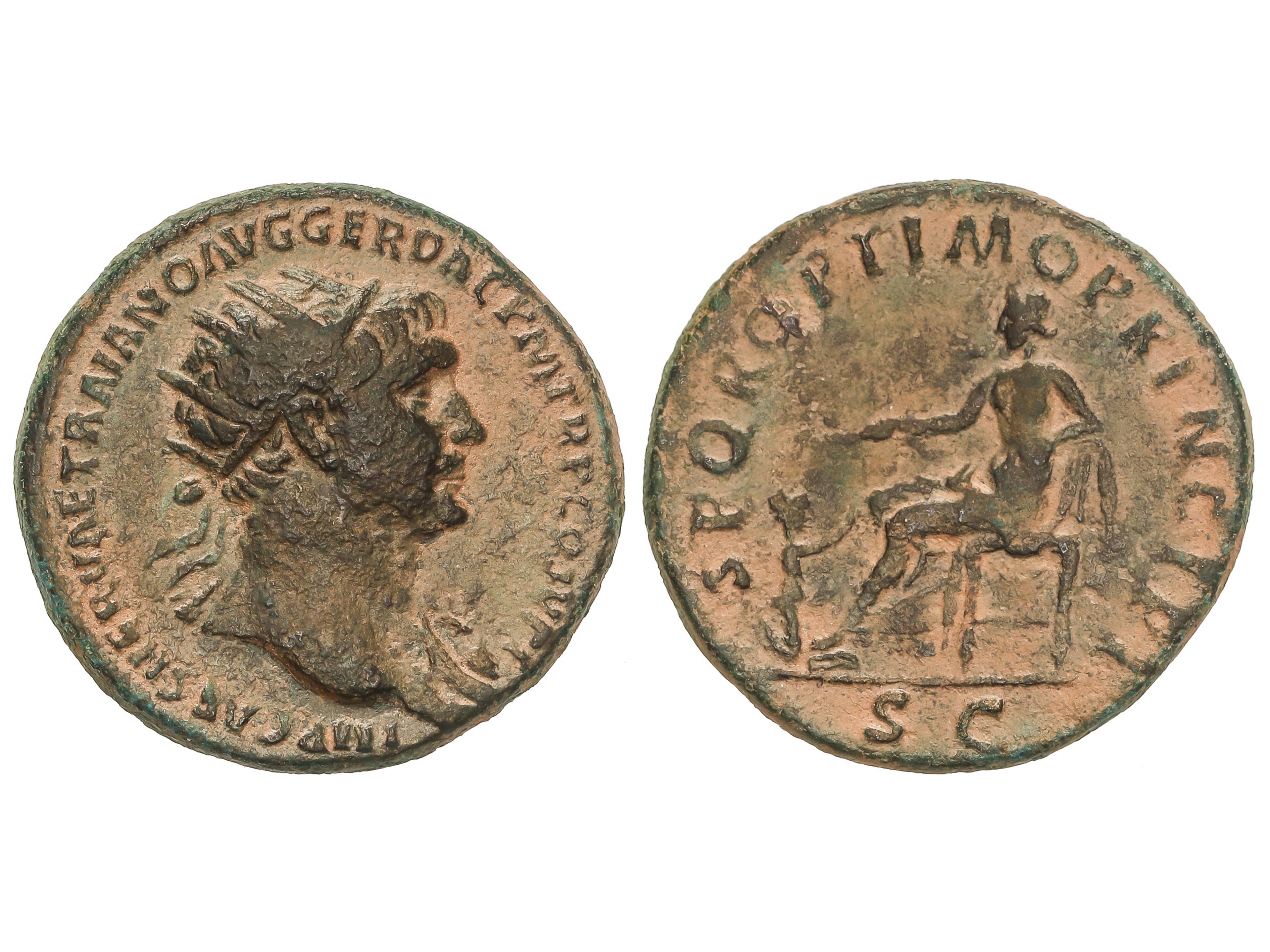 Dupondio. 103-111 d.C. TRAJANO. Anv.: IMP. CAES. NERVAE TRAIANO AVG. GER. DAC. P. M. TR. P. COS. V P. P. Busto radiado a derecha. Rev.: S. P. Q. R. OPTIMO PRINCIPI S. C. Salud sentada a izquierda alimentando a