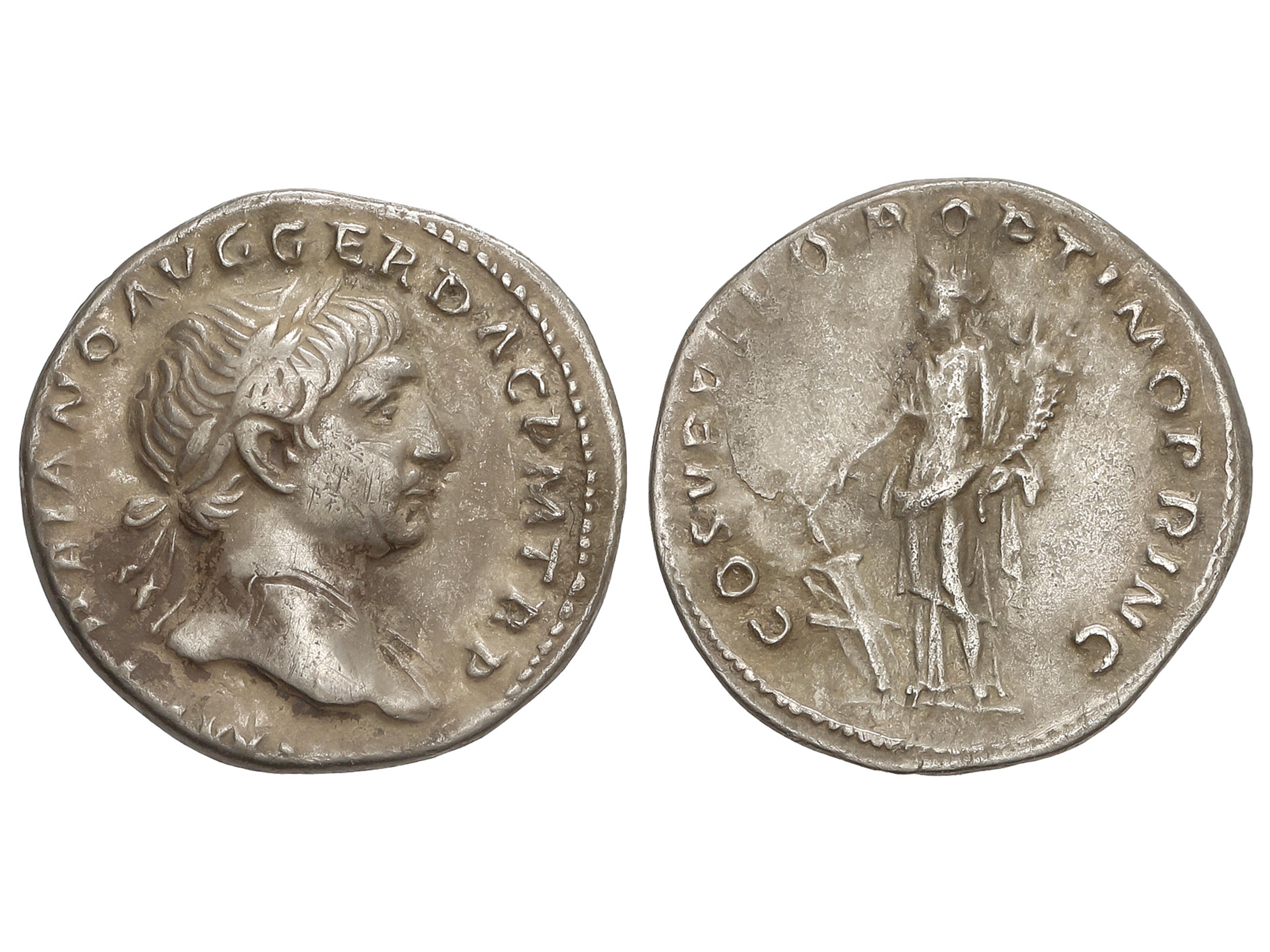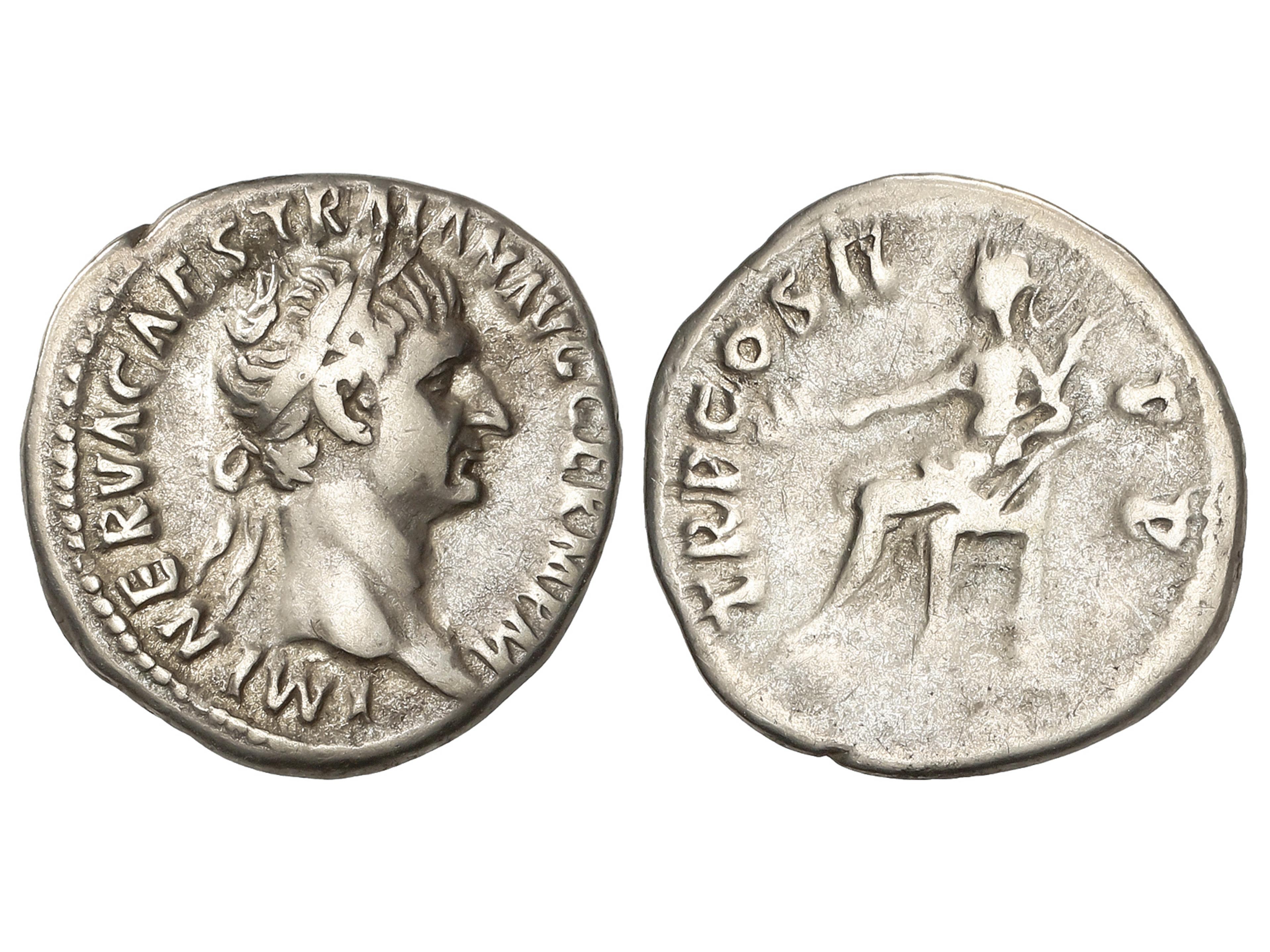 Denario. 98 d.C. TRAJANO. Anv.: IMP. NERVA CAES. TRAIAN. AVG. GERM. P. M. Cabeza laureada a derecha. Rev.: TR. POT. COS. II – P. P. Concordia sentada sosteniendo una cornucopia y realizando un sacrificio con una