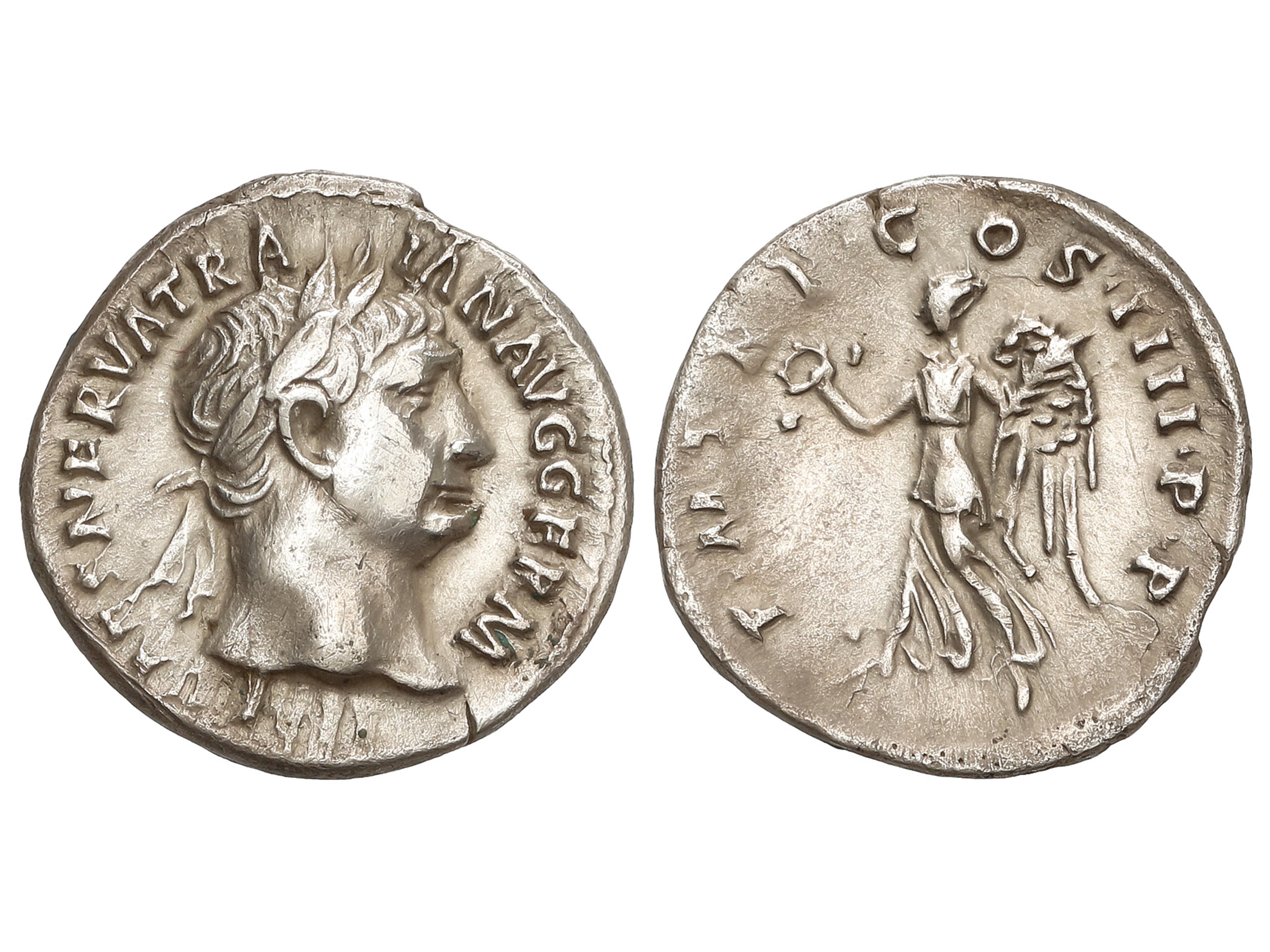 Denario. 114-117 d.C. TRAJANO. Anv.: IMP. CAES. NER. TRAIAN. OPTIM. AVG. GER. DAC. PARTHICO. Busto laureado y drapeado de Trajano a derecha. Rev.: P. M. TR. P. COS. VI P. P. S.P.Q.R. La Valentía con casco en pie,