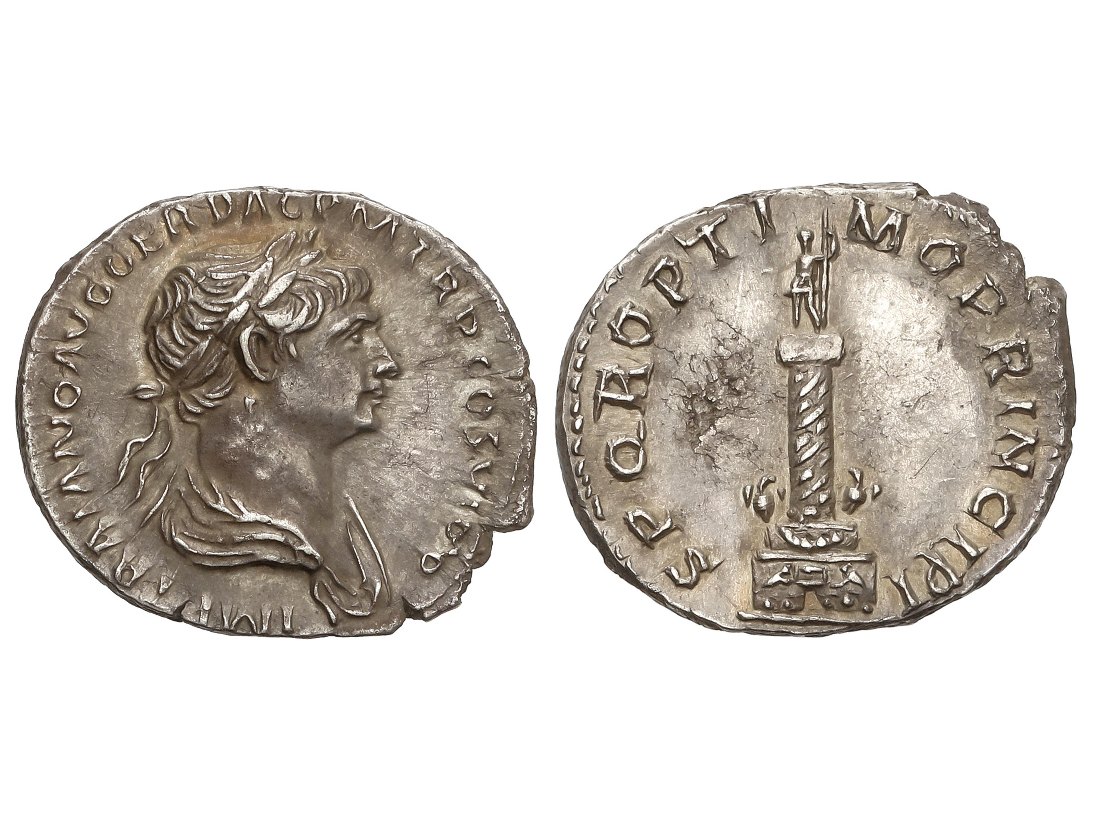 Denario. 113-114 d.C. TRAJANO. Anv.: IMP. TRAIANO AVG. GER. DAC. P. M. TR. P. COS VI P. P. Busto laureado a derecha. Rev.: S.P. Q. R.OPTIMO PRINCIPI. Columna Trajana, encima estatua del emperador. 3,20 grs. AR. C-558;