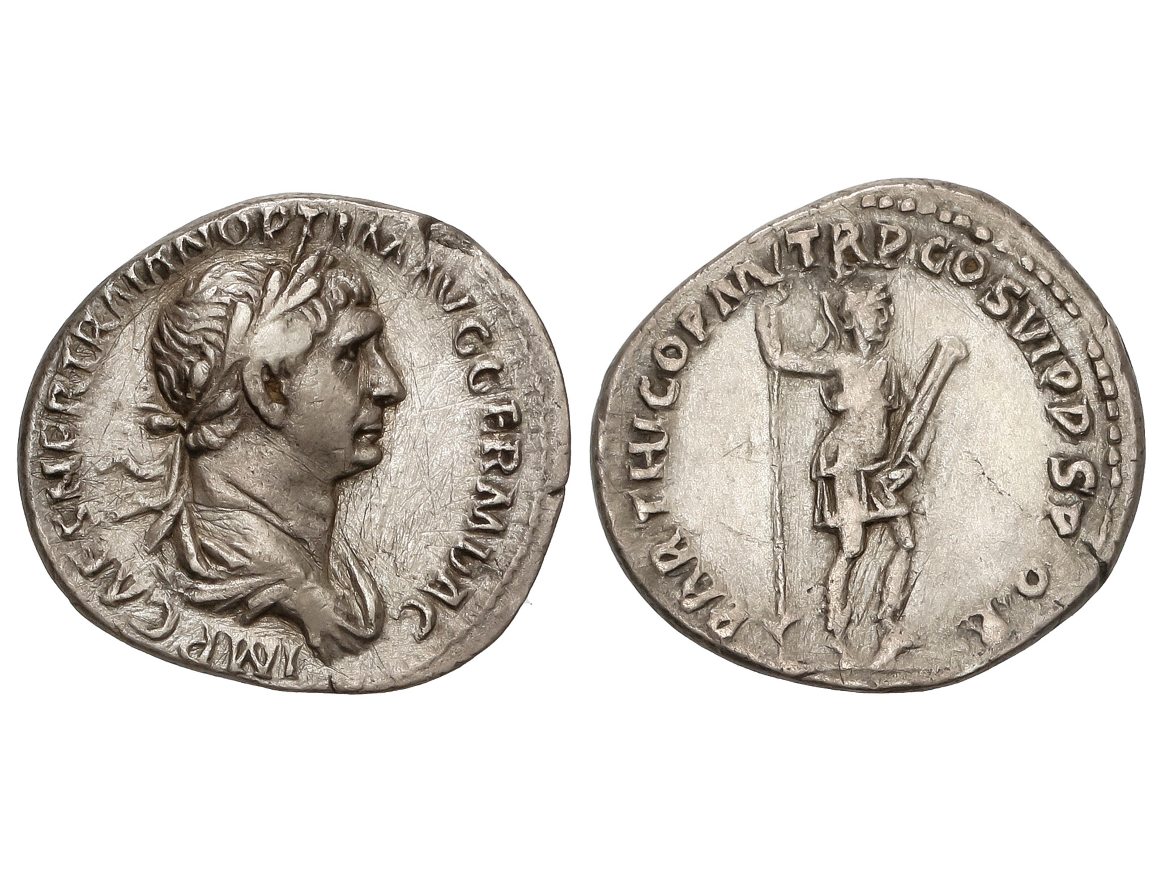 Denario. 114-117 d.C. TRAJANO. Anv.: IMP. CAES. NER. TRAIAN. OPTIM. AVG. GER. DAC. PARTHICO. Busto laureado y drapeado de Trajano a derecha. Rev.: P. M. TR. P. COS. VI P. P. S.P.Q.R. La Valentía con casco en pie,