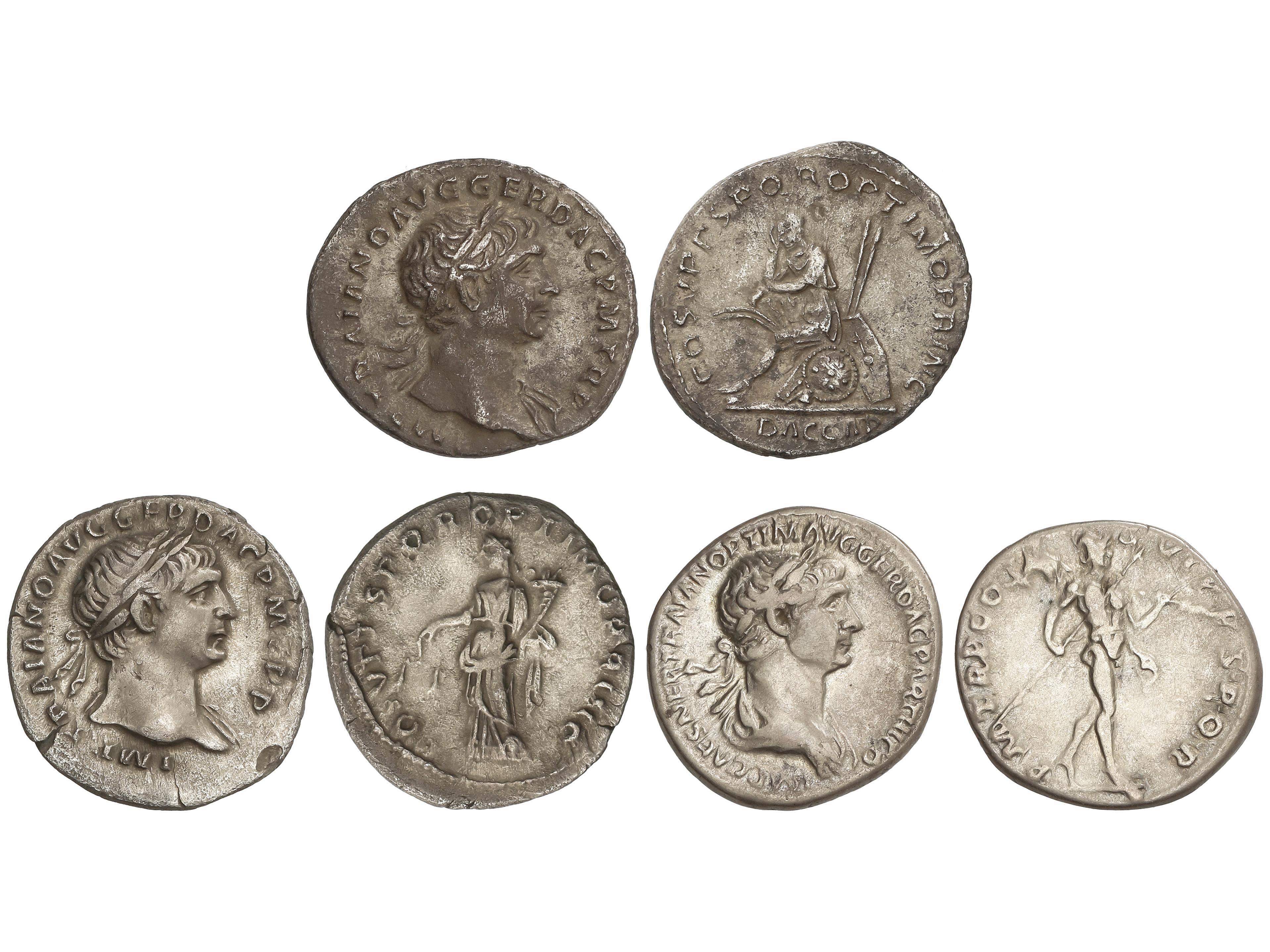 Lote 3 monedas Denario. TRAJANO. AR. COS. V. P. P. S. P. Q. R. OPTIMO PRINC. Equidad a izquierda con balanza y cornucopia C-85, P. M. TR. P. COS. VI P. P. S. P. Q. R. Marte en marcha a derecha con lanza y trofeo C-270 y DAC.