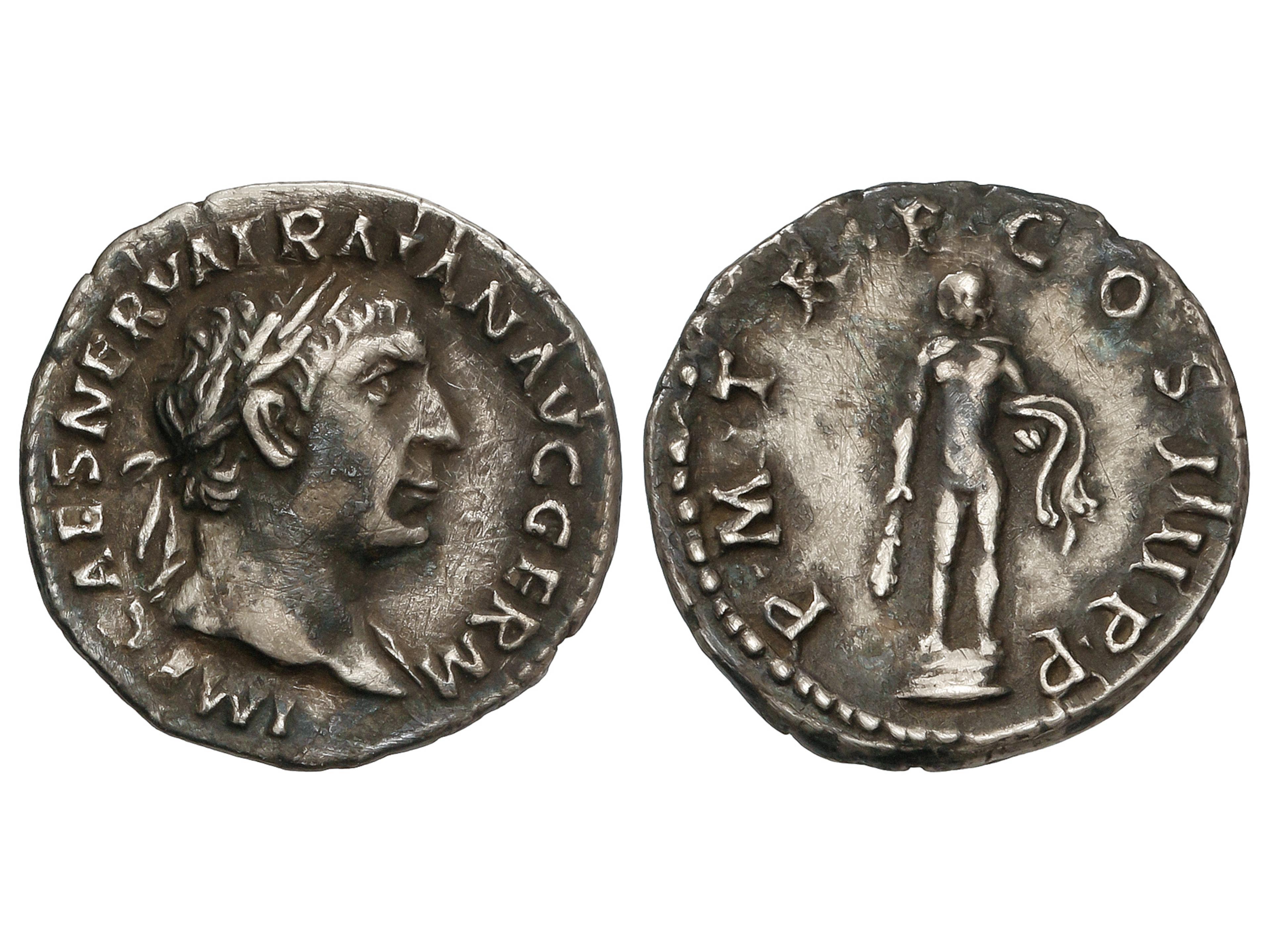 Denario. 98-117 d.C. TRAJANO. Anv.: IMP. CAES. NERVA TRAIAN. AVG. GERM. Cabeza laureada a derecha. Rev.: P. M. TR. P. COS. IIII P. P. Hércules en pie de frente sobre pedestal bajo, con la maza y la piel de león. 2,83