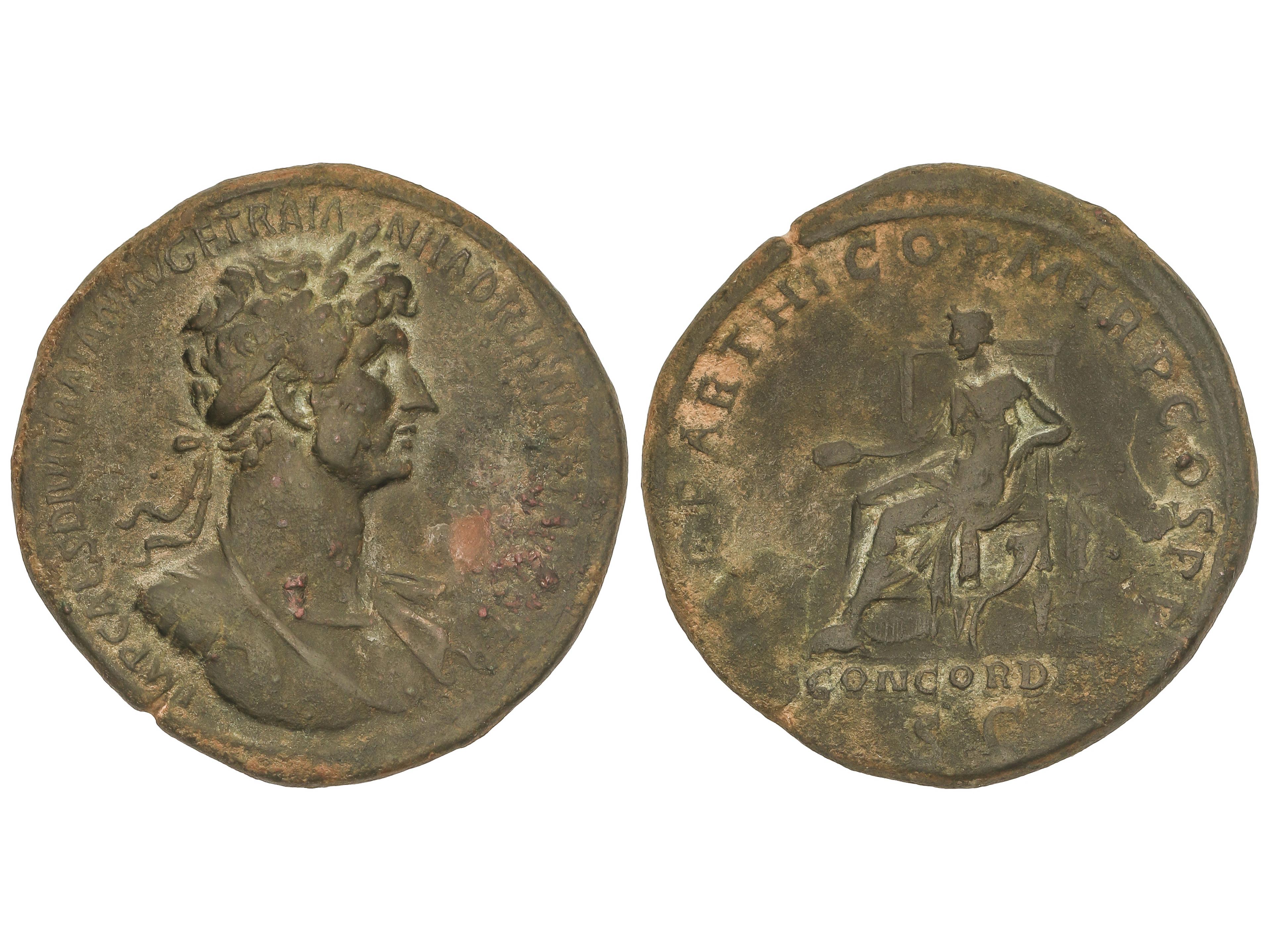 Sestercio. 117-138 d.C. ADRIANO. Anv.: IMP. CAES. DIVI. TRAIAN AVG. F. TRAIAN HADRIAN OPT. AVG. GER. Busto laureado a derecha. Rev.: DAC. PARTHICO P. M. TR. P. COS P. P. / CONCORDIA / S C. Concordia sentada a