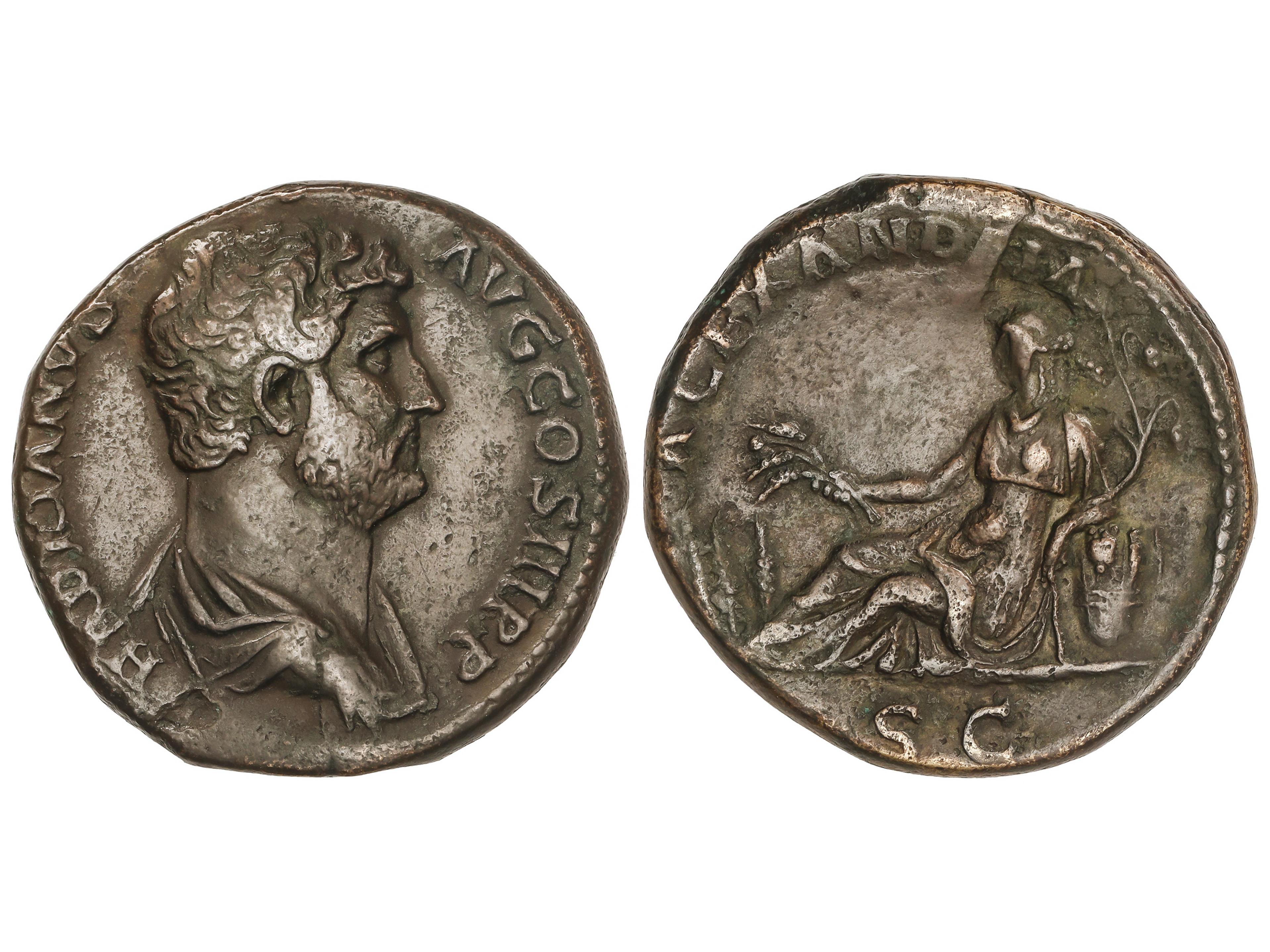 Sestercio. 134-138 d.C. ADRIANO. Anv.: HADRIANVS AVG. COS. III. P. P. Busto laureado a derecha. Rev.: ALEXANDRIA S. C. Alejandría reclinada a izquierda, cortando tres espigas y rama de vid, con el brazo apoyado en un