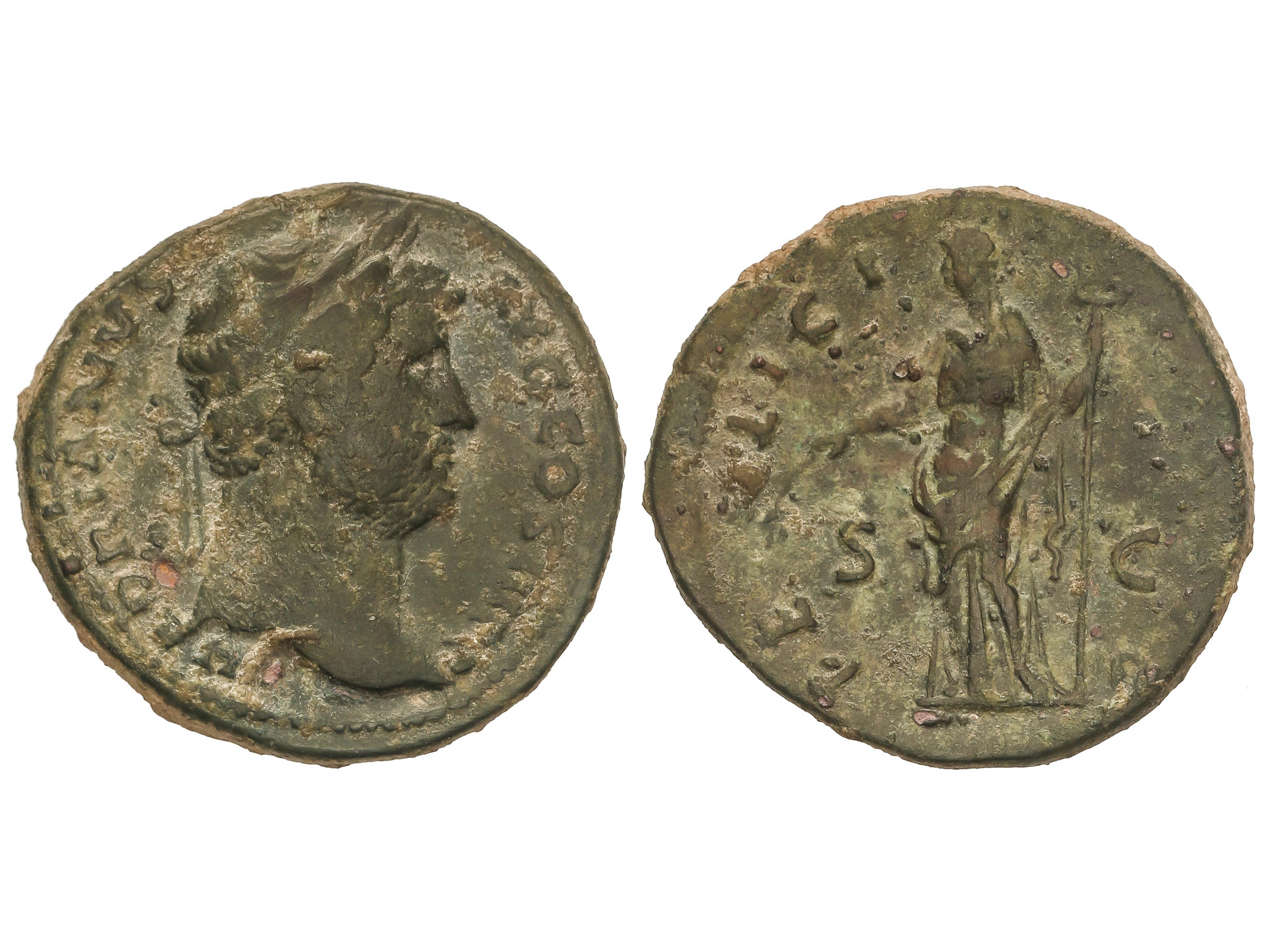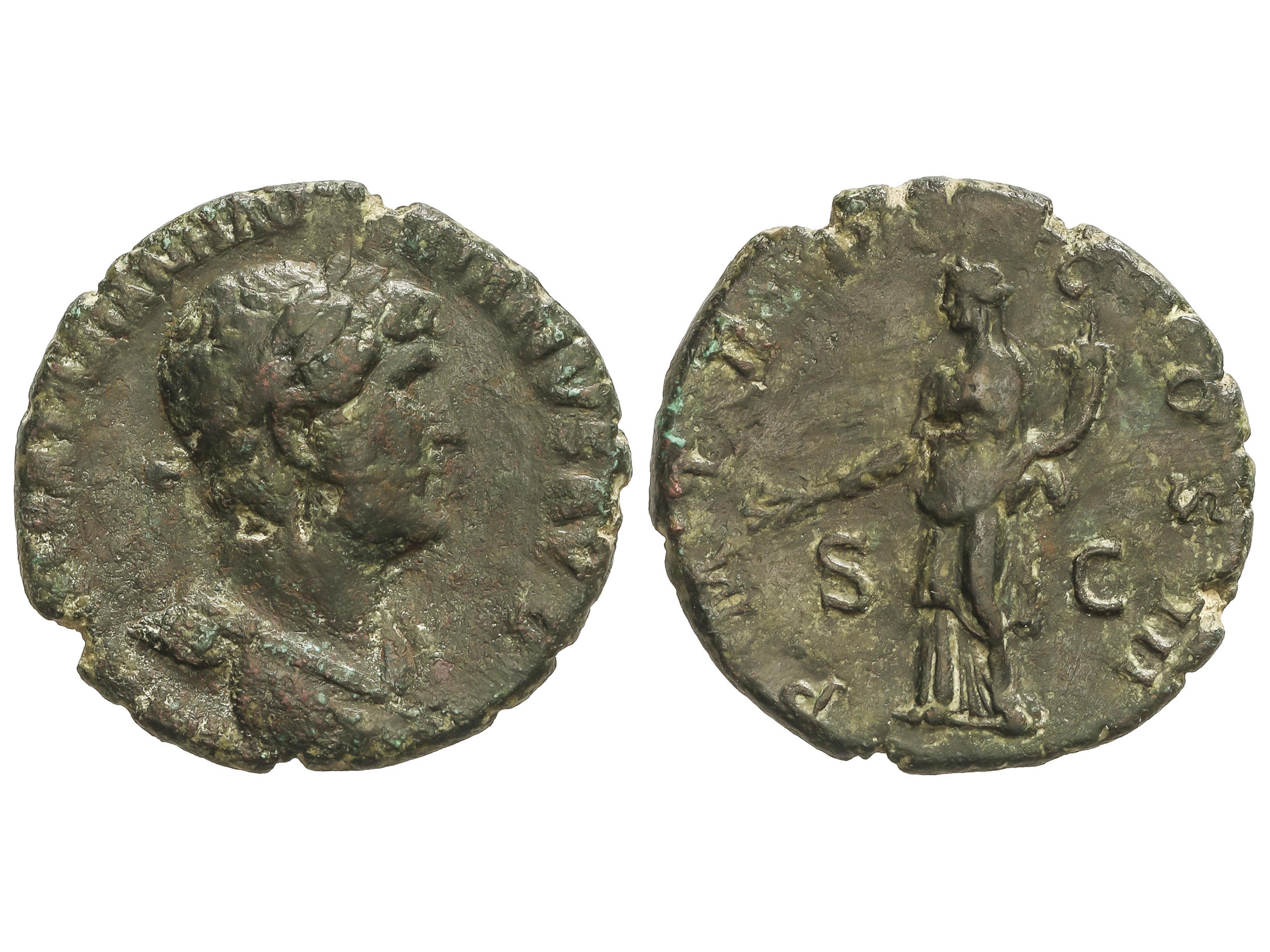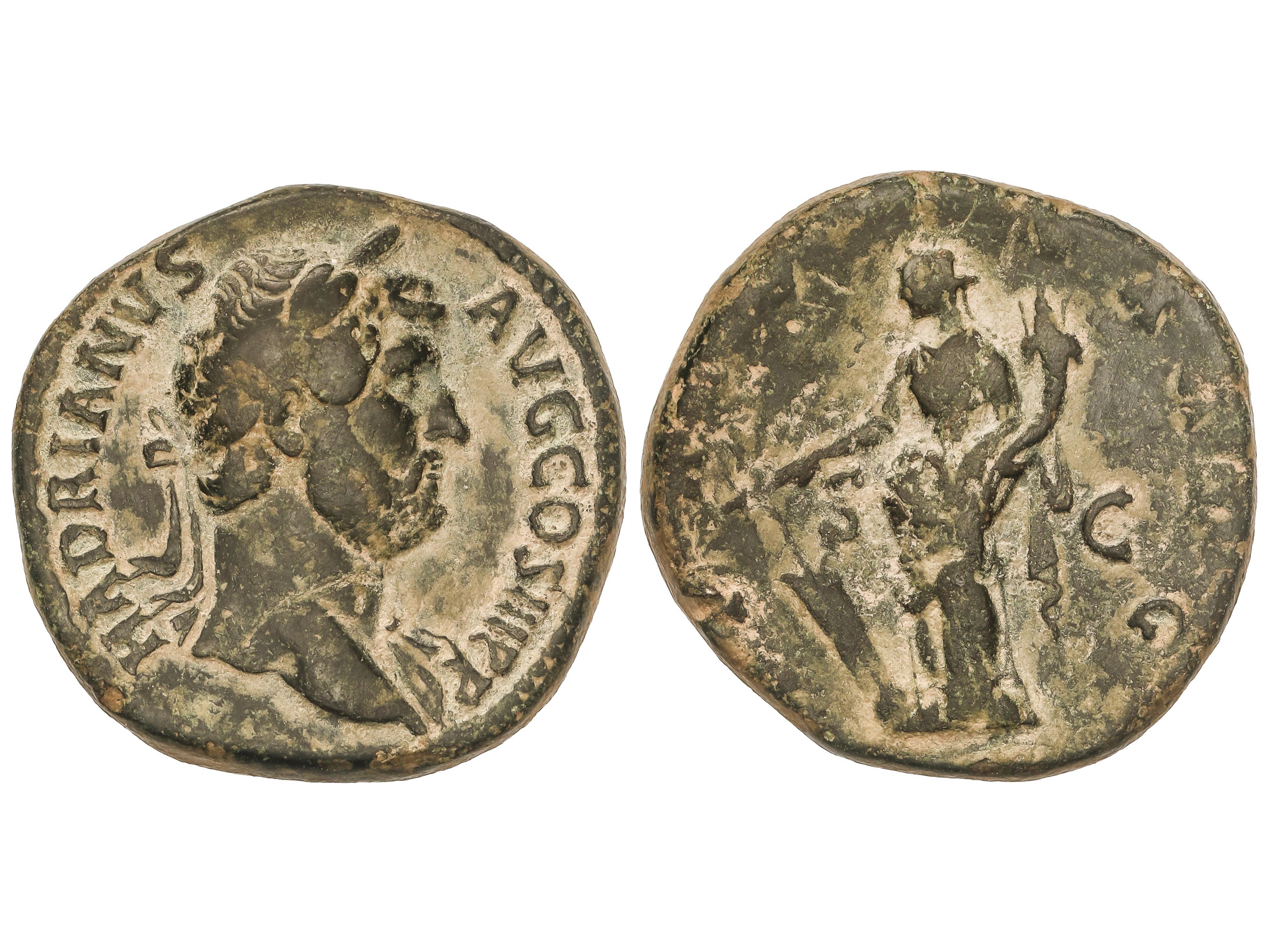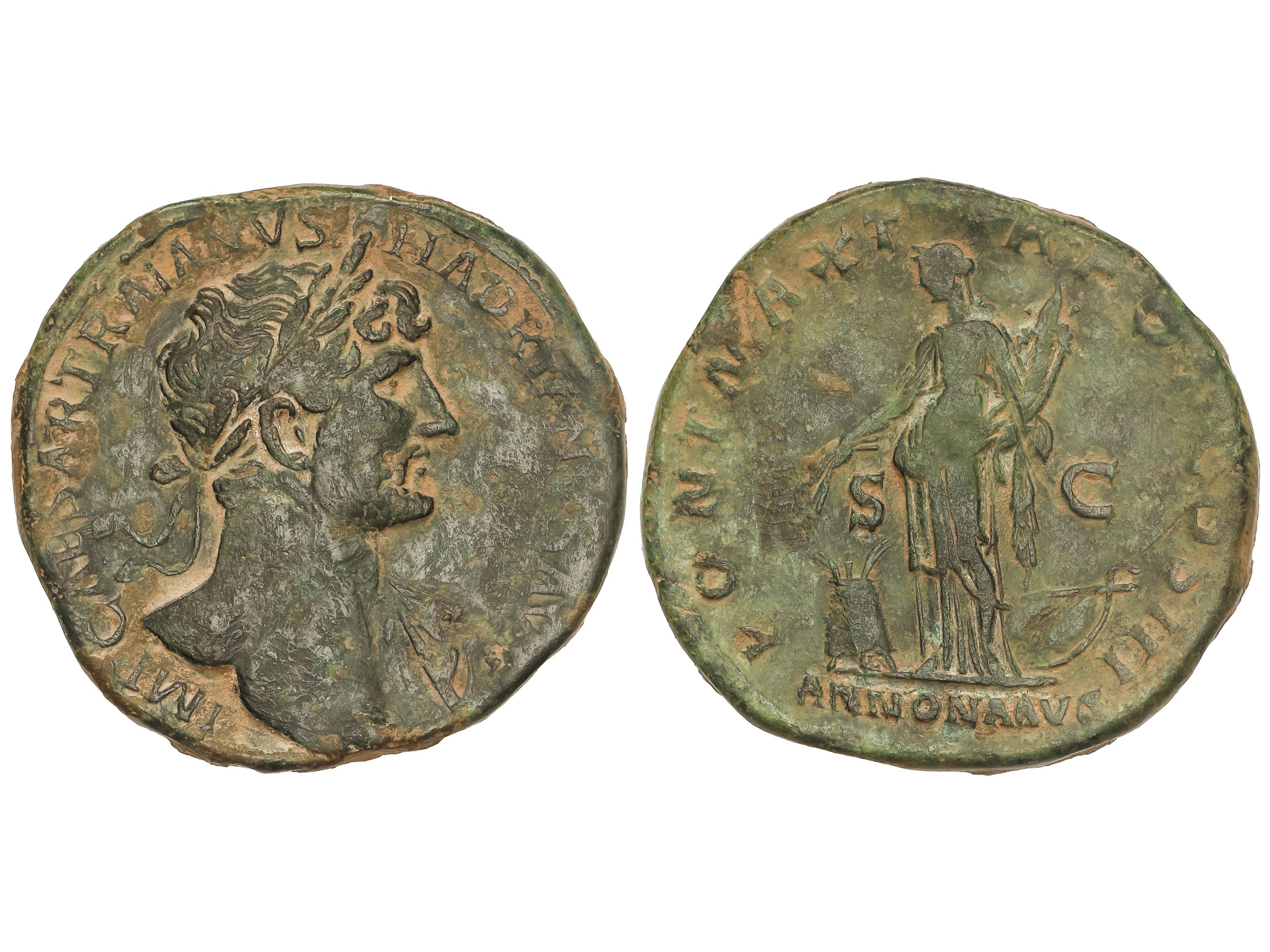 Sestercio. 118 d.C. ADRIANO. Anv.: IMP. CAESAR TRAIANVS HADRIANVS AVG. Busto laureado a derecha con hombro izquierdo drapeado. Rev.: PONT. MAX. TR. POT. COS. III. En exergo ANNONA AVG. Abundancia en pie a izquierda