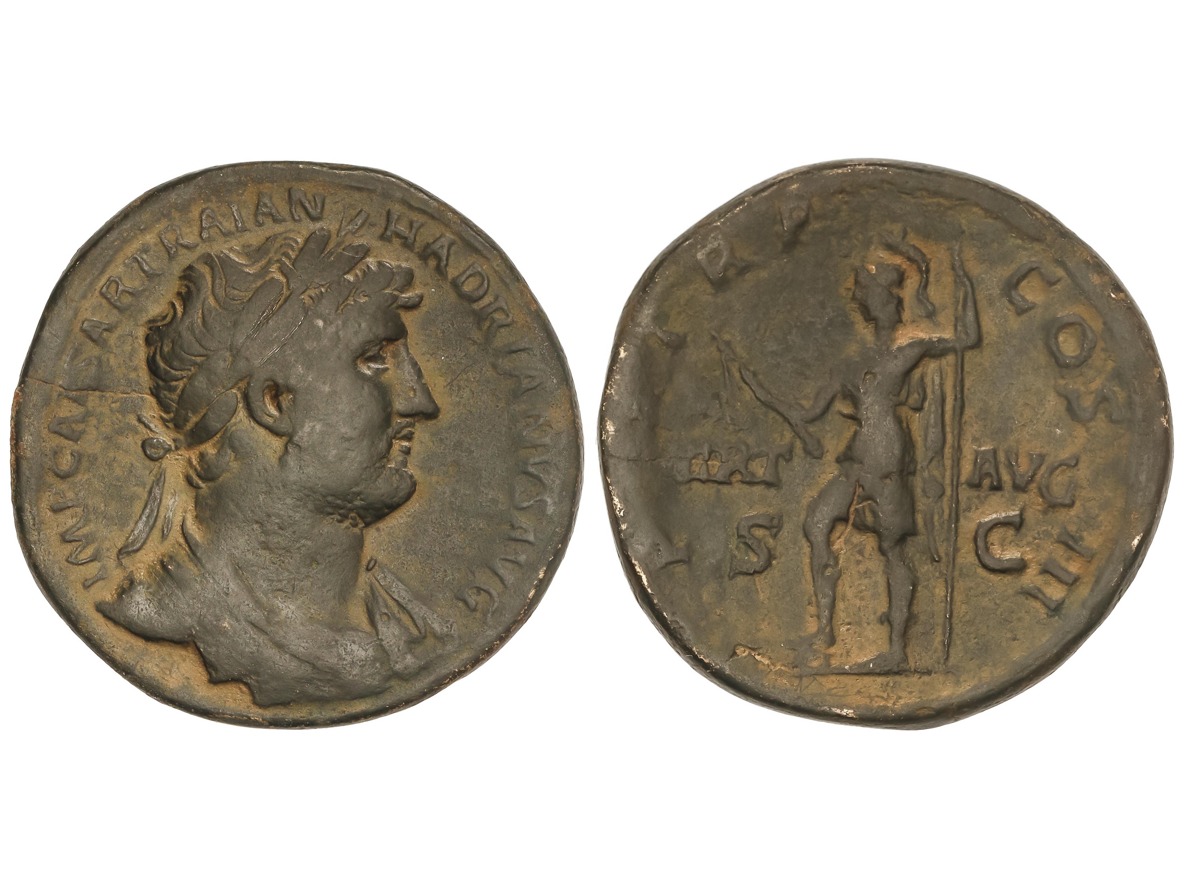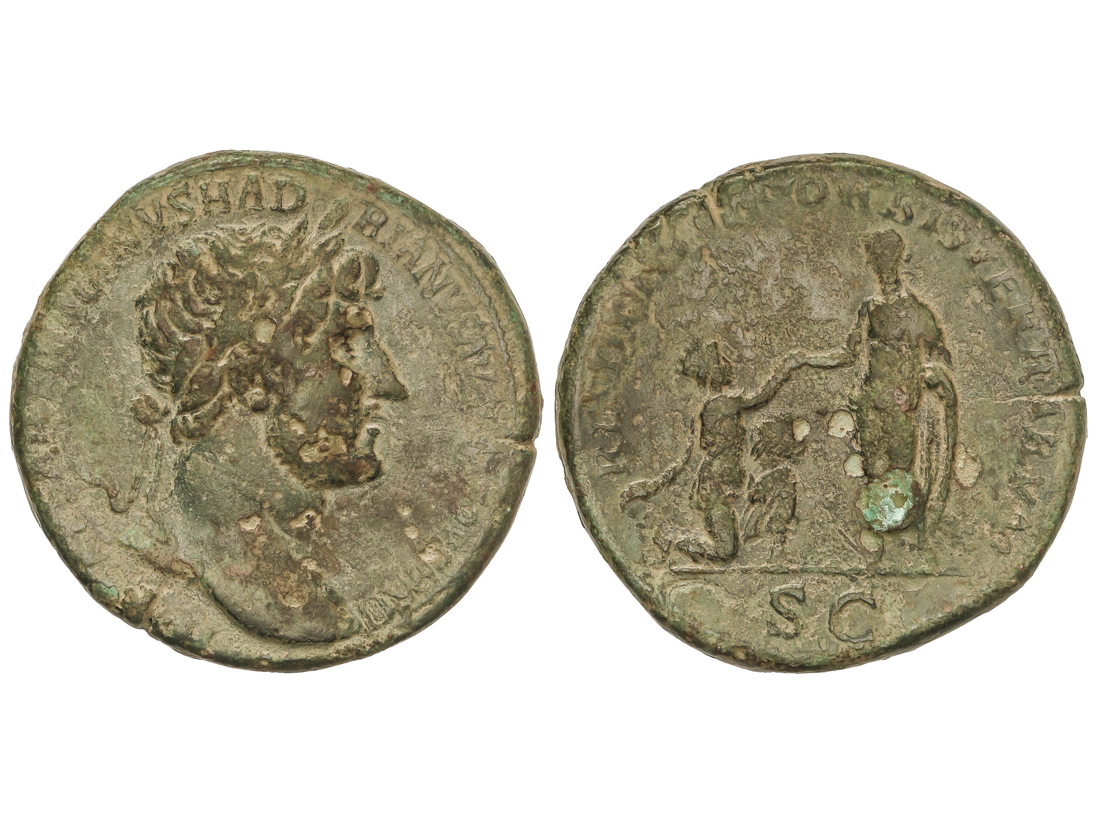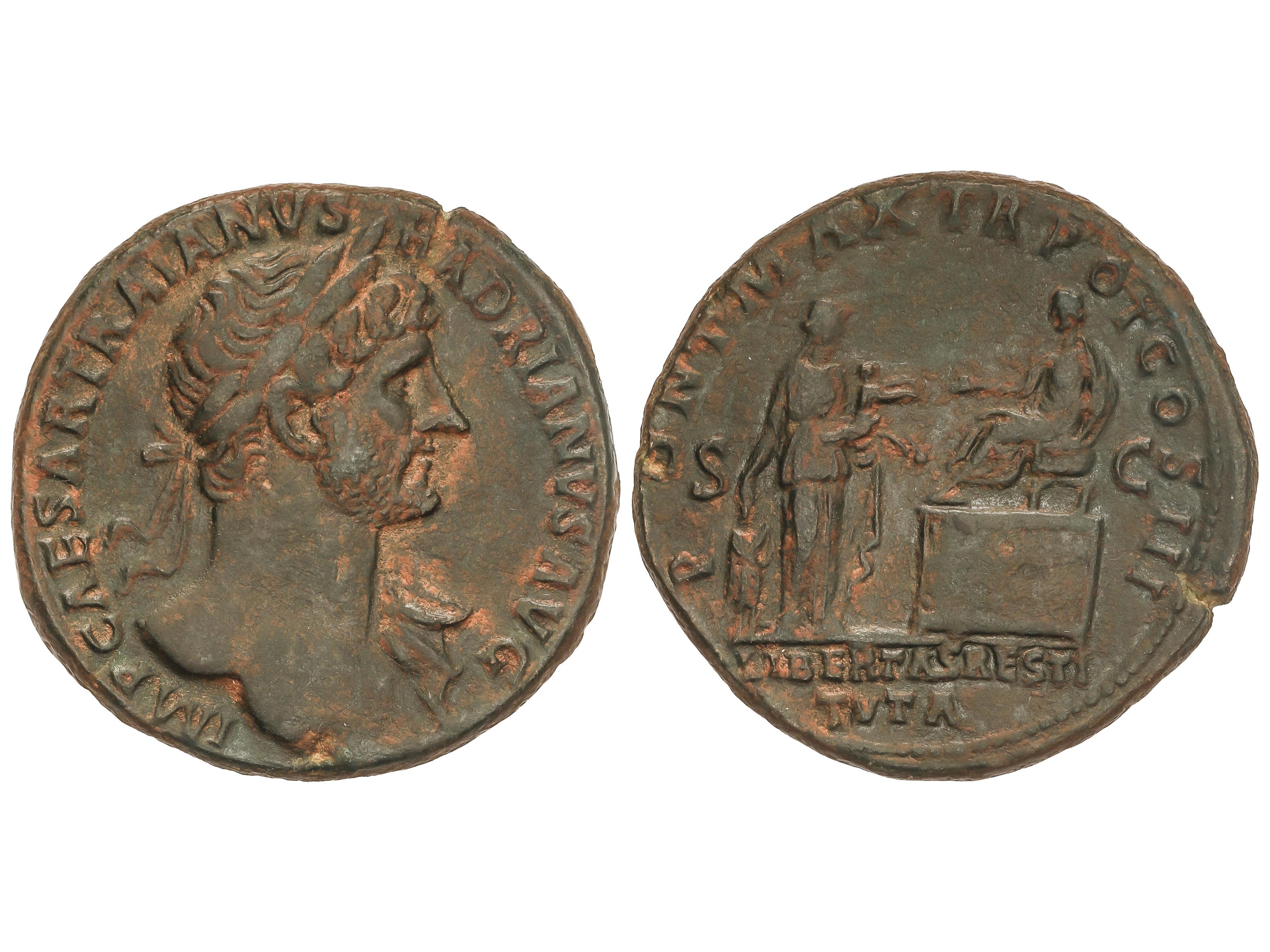 Sestercio. 119-121 d.C. ADRIANO. Anv.: IMP. CAESAR TRAIANVS HADRIANVS AVG. Busto laureado a derecha. Rev.: PONT. MAX. TR. POT. COS. III. LIBERTAS RESTITVTA S. C. Adriano sentado a izquierda alargando la mano a una