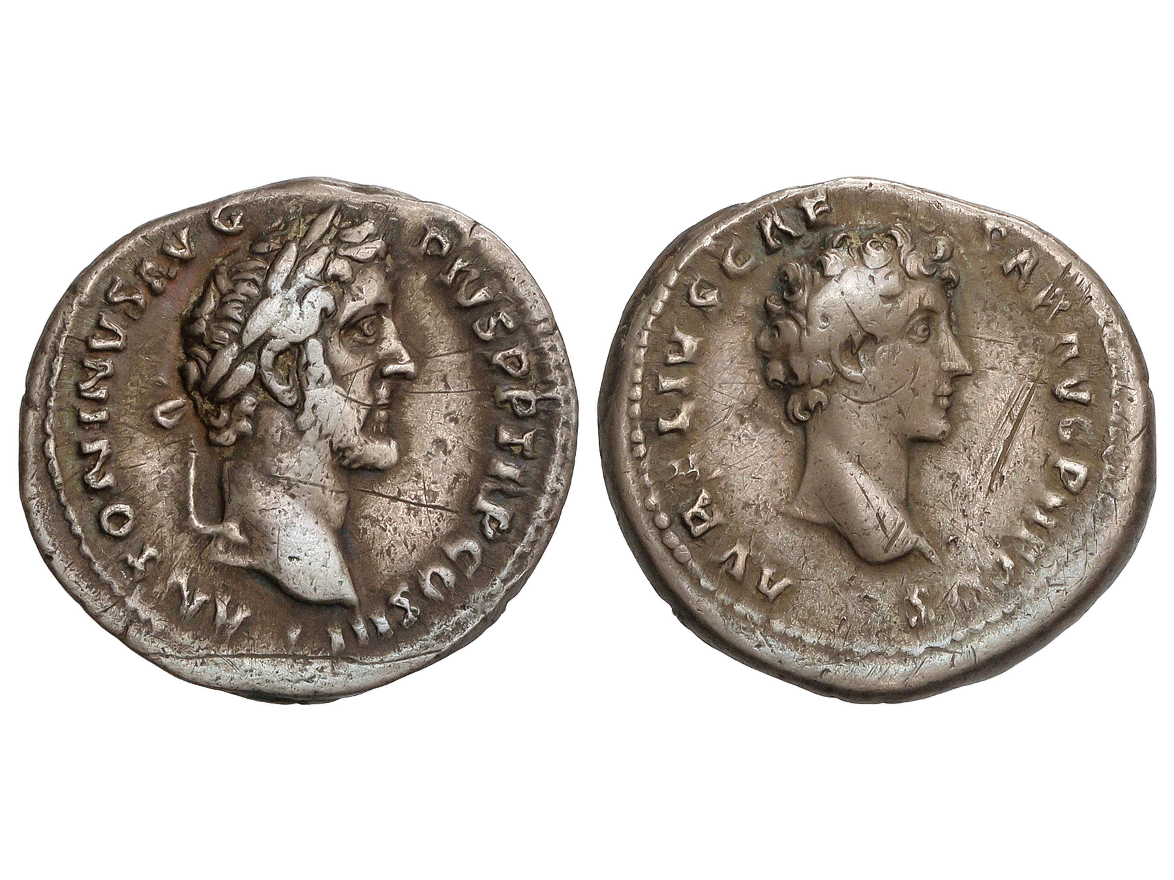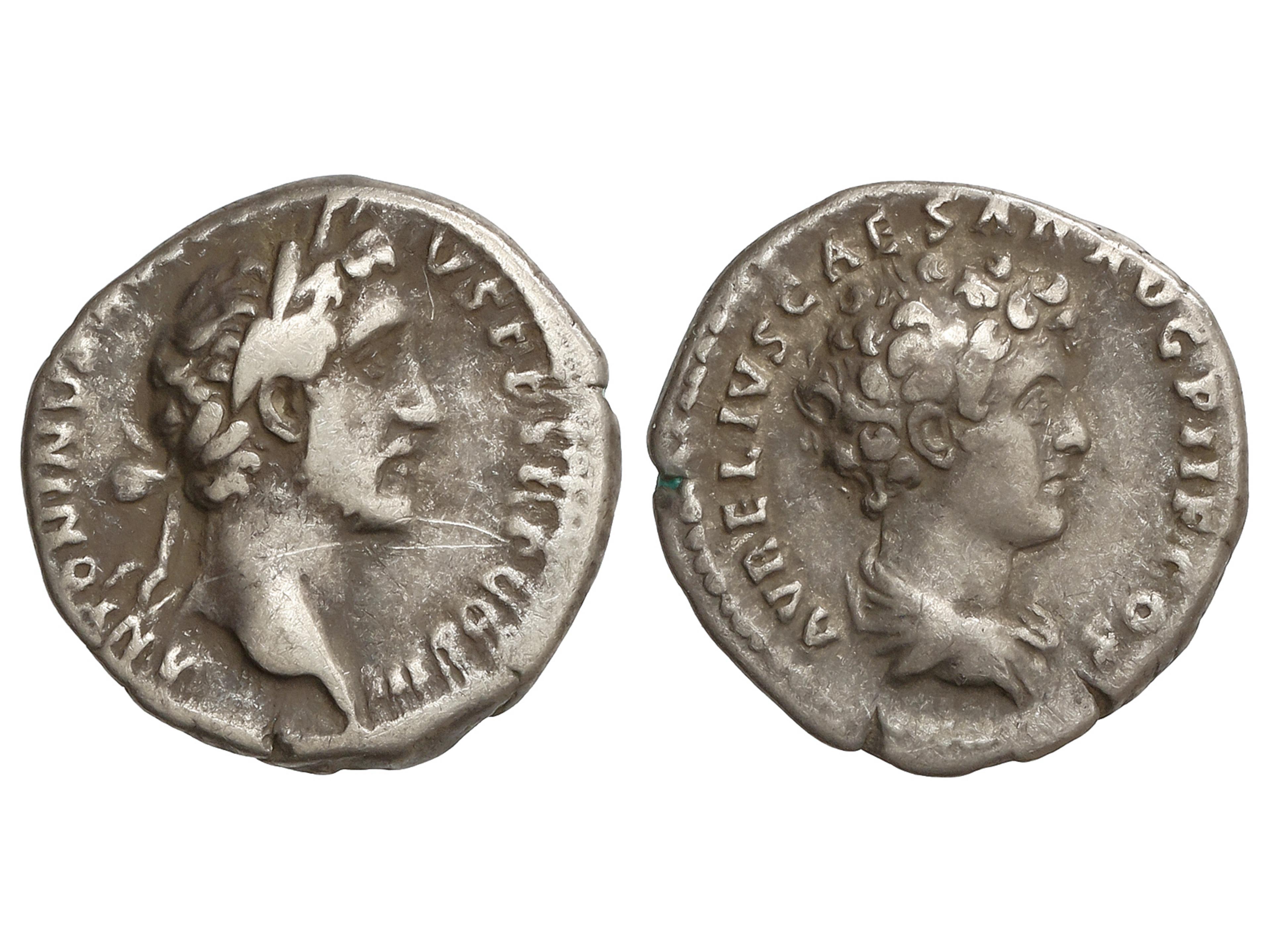 Denario. 140 d.C. ANTONINO PÍO y MARCO AURELIO. Anv.: ANTONINVS AVG.PIVS P. P. TR. P. COS. III. Cabeza de Antonino Pío a derecha. Rev.: AVRELIVS CAESAR AVG. PII F. COS. Cabeza de Marco Aurelio a derecha. 2,93 grs. AR.
