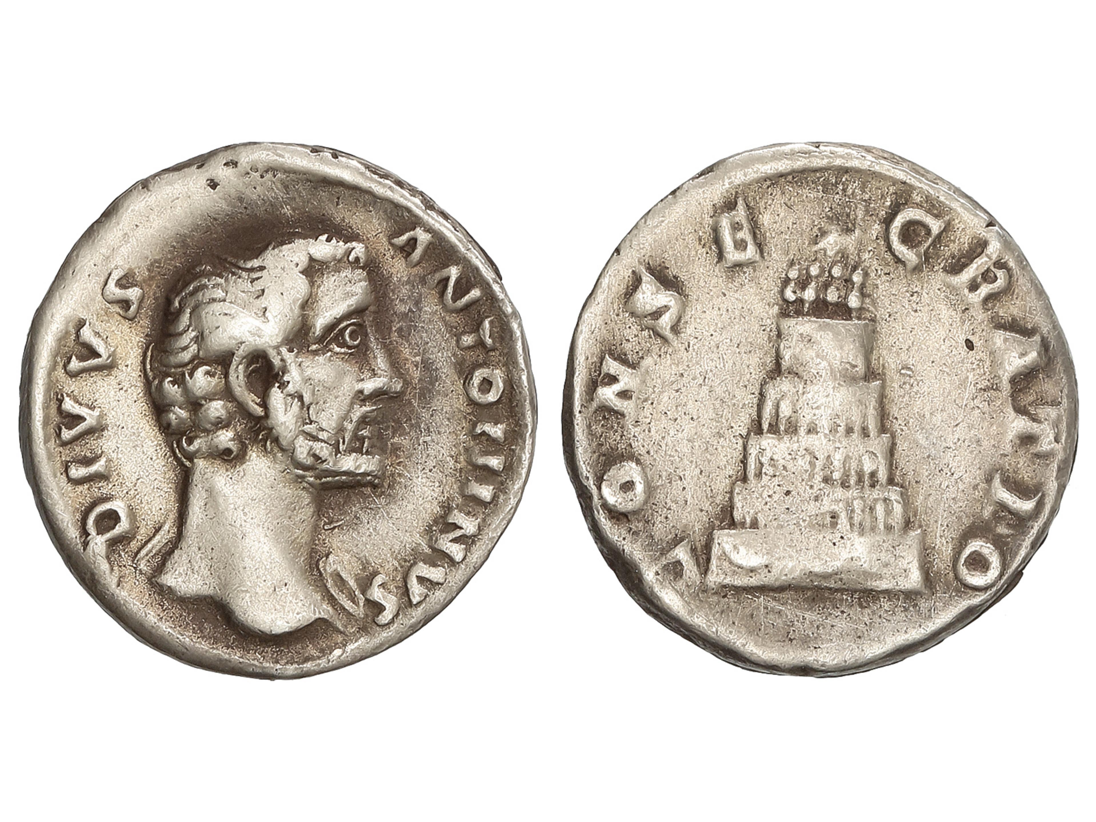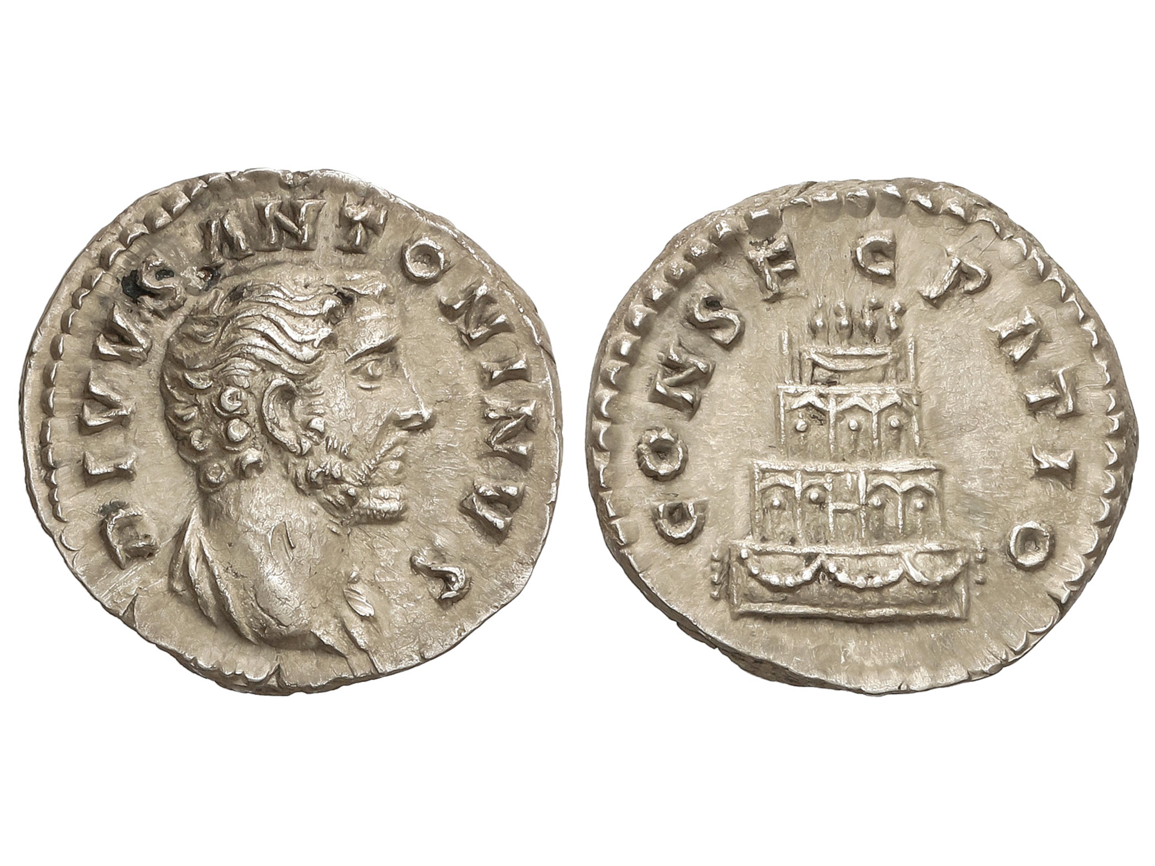 Denario. 161-180 d.C. ANTONINO PÍO. Anv.: DIVVS ANTONINVS. Cabeza descubierta de Antonino a derecha. Rev.: CONSECRATIO. Pira funeraria rematada por Antonino en cuadriga. 3,08 grs. AR. C-164; RIC-M436; BMC-M57.
