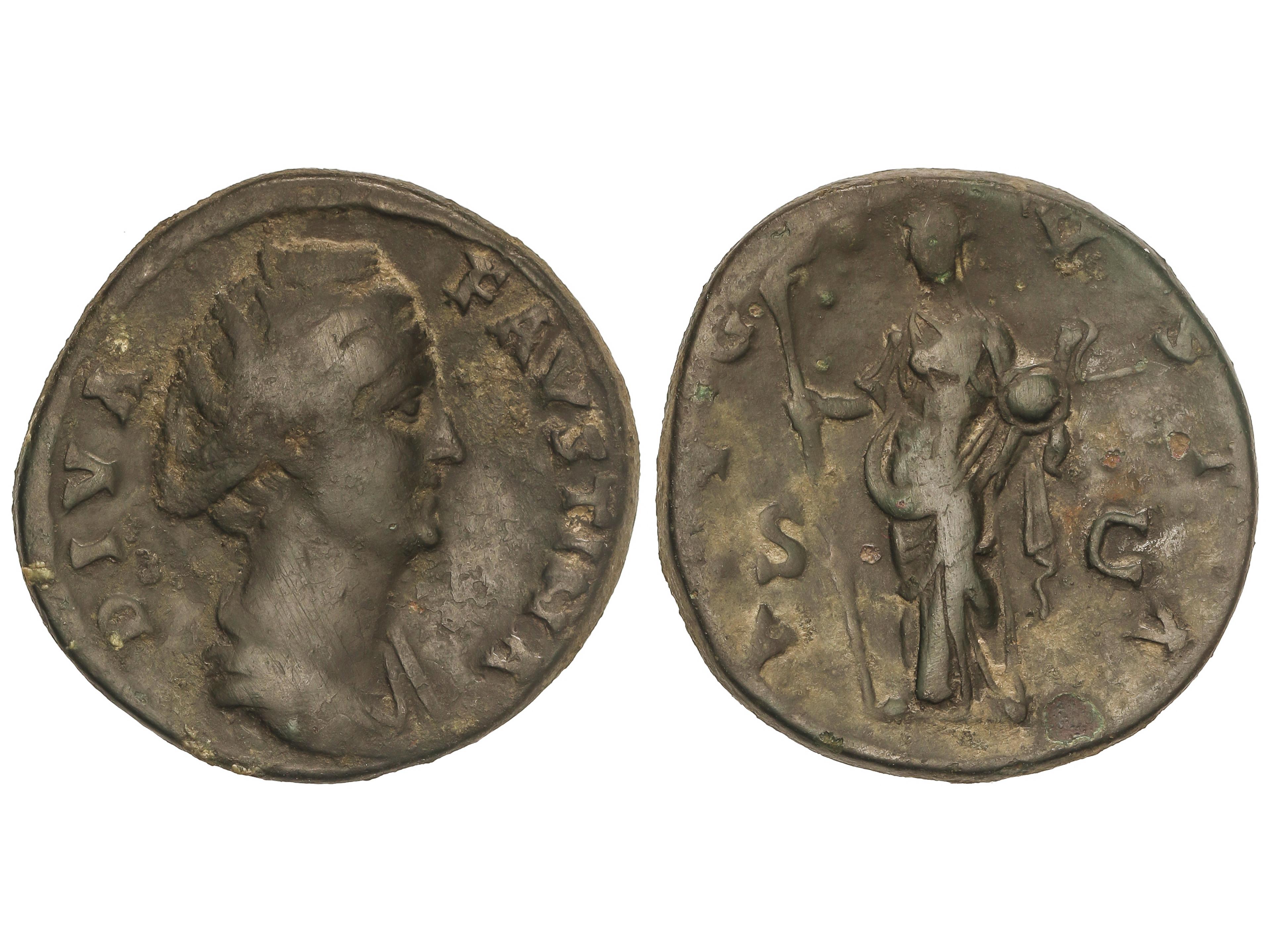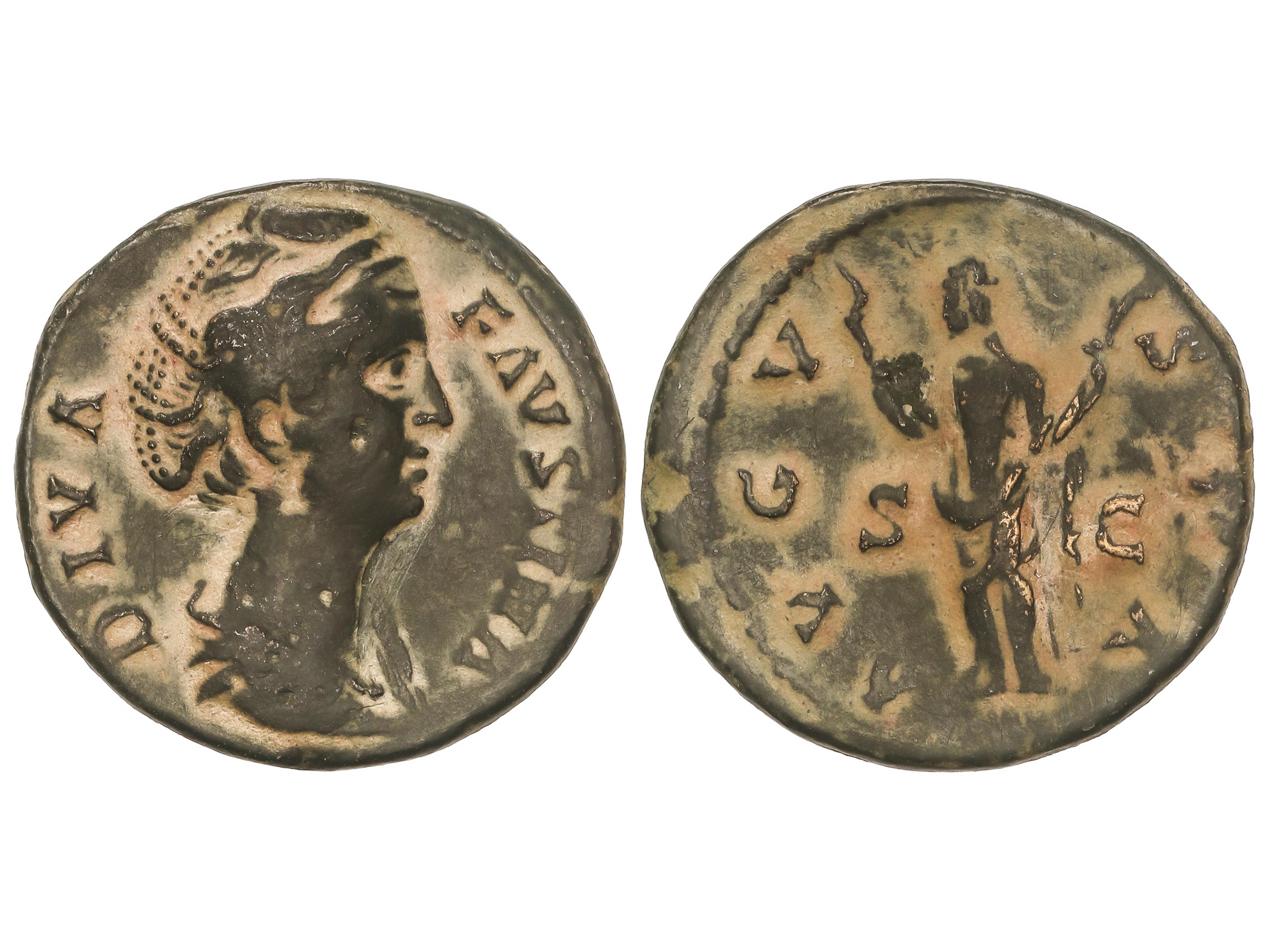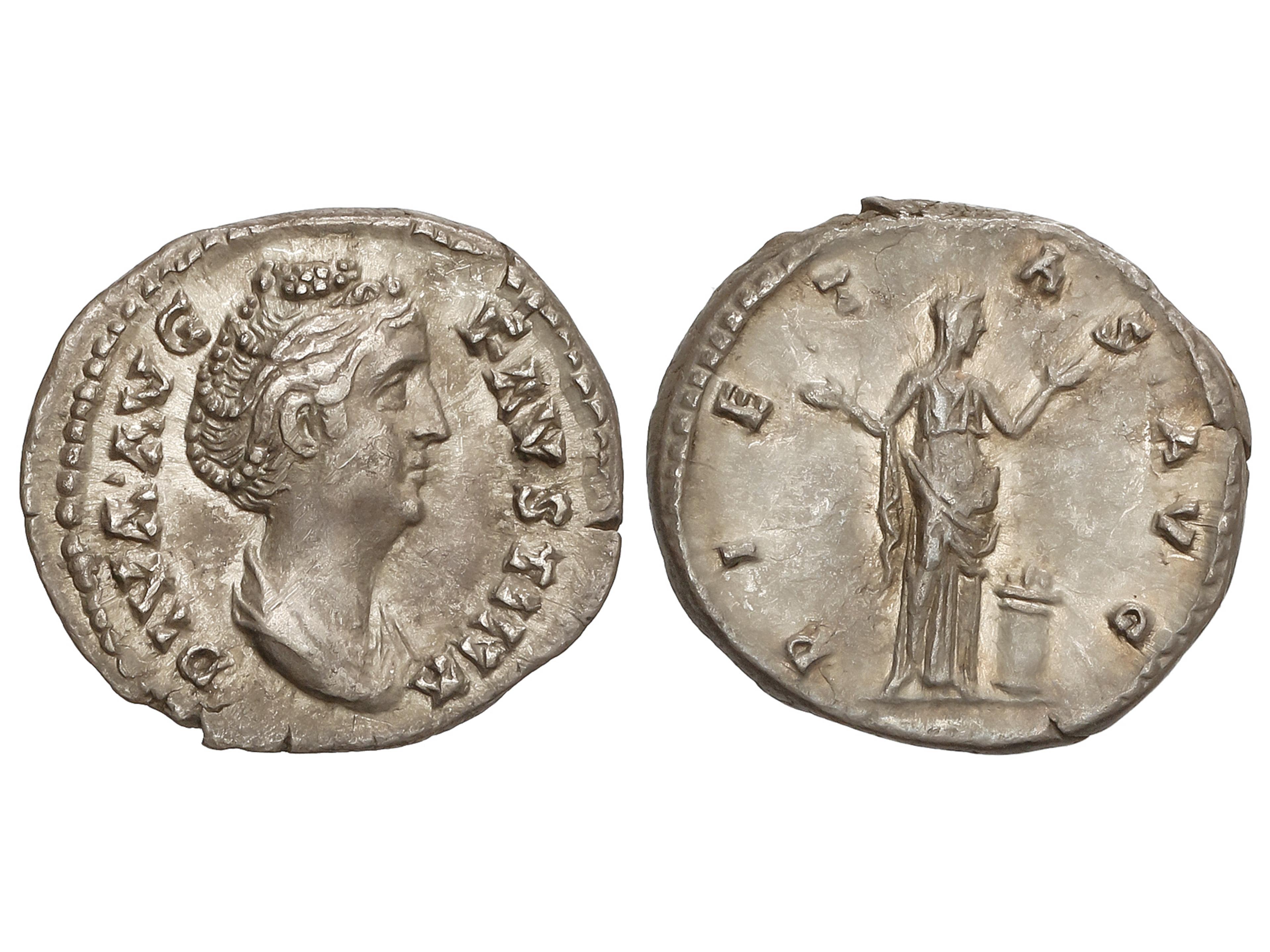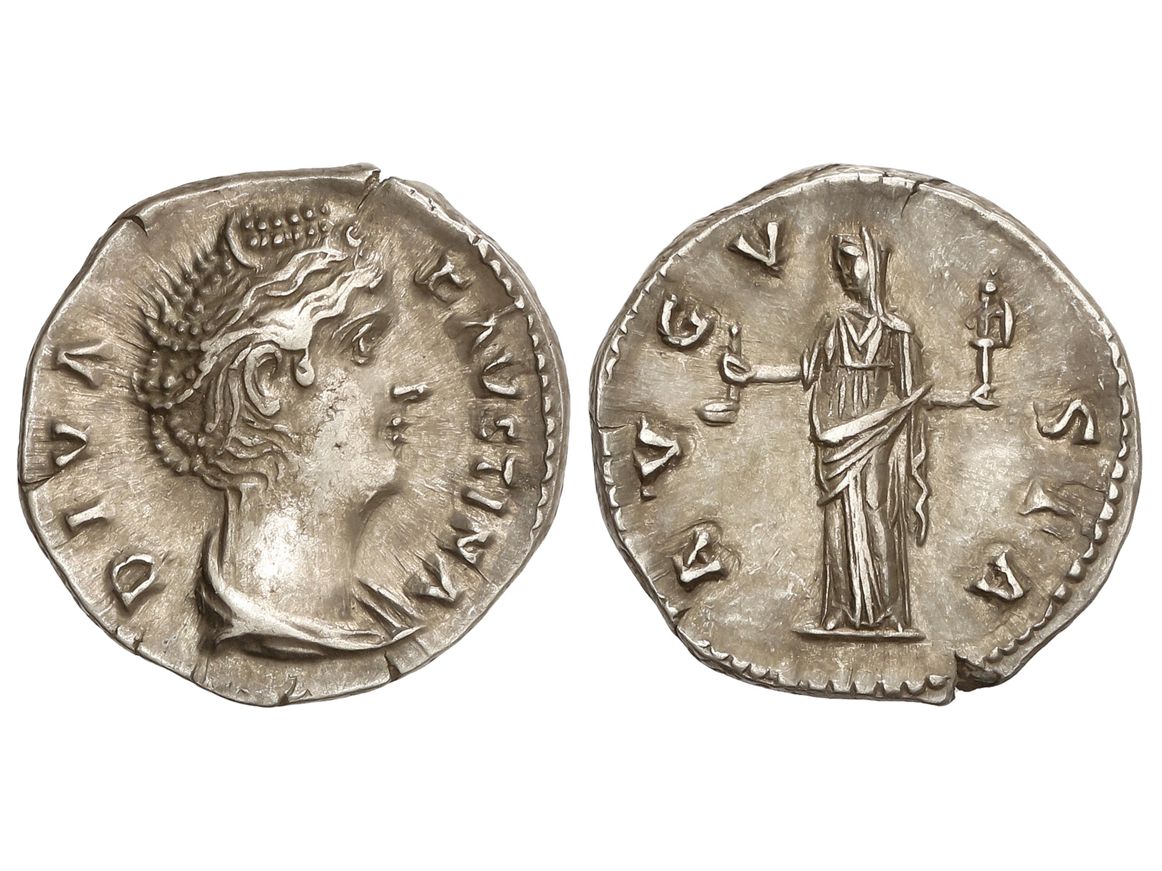 Denario. 141 d.C. FAUSTINA MADRE. Anv.: DIVA FAVSTINA. Busto drapeado de Faustina a derecha. Rev.: AVGVSTA. Vesta en pie a izquierda con velo, portando símpulo y paladio. 3,42 grs. AR. C-108; RIC-A368 (Antonino Pío);