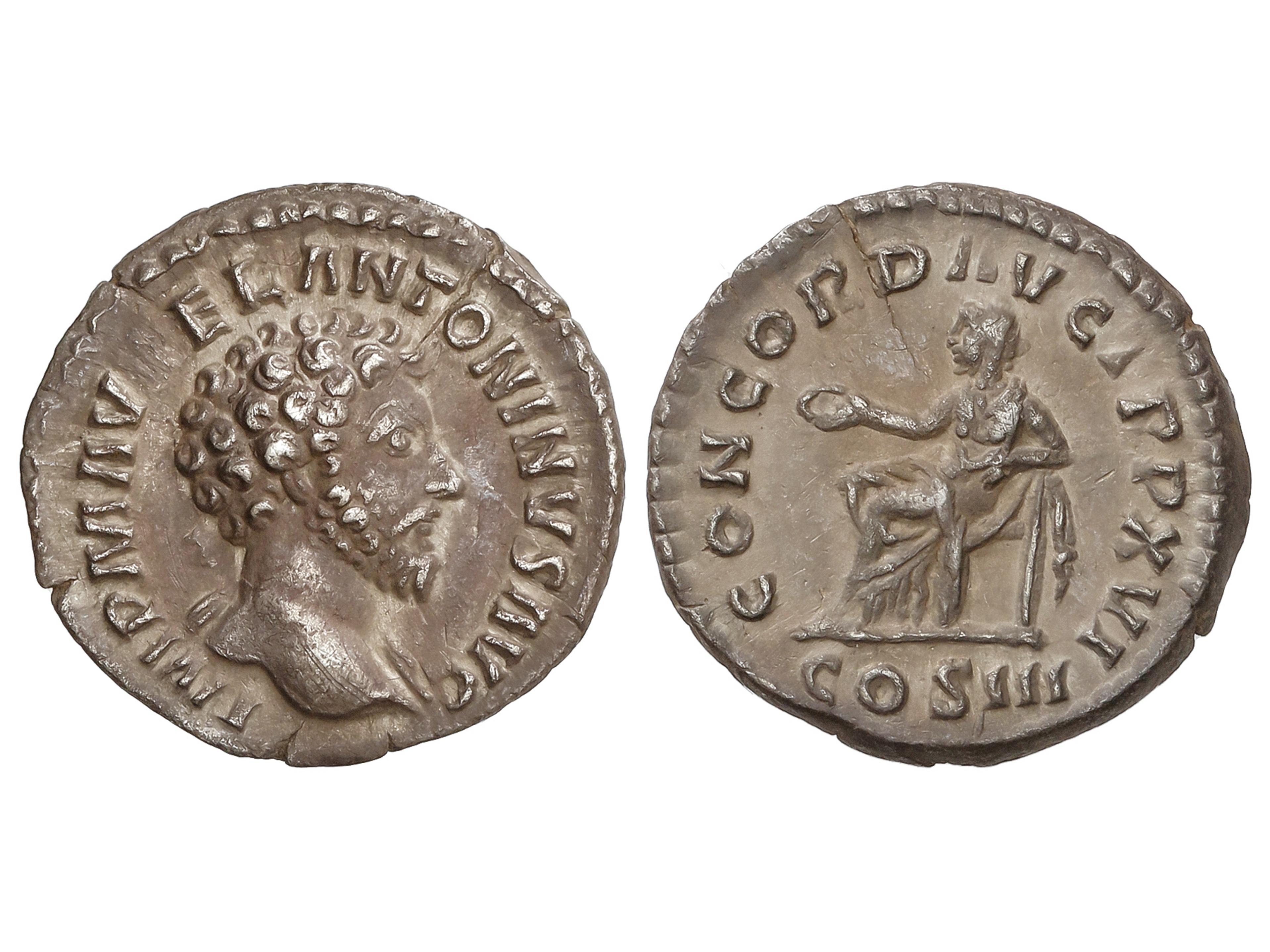 Denario. 162-164 d.C. MARCO AURELIO. Anv.: IMP. M. AVREL. ANTONINVS AVG. Busto a derecha. Rev.: CONCORD. AVG. TR. P. XVI COS. III. Concordia sentada a izquierda con pátera. 2,67 grs. AR. Pátina. C-35; RIC-35.