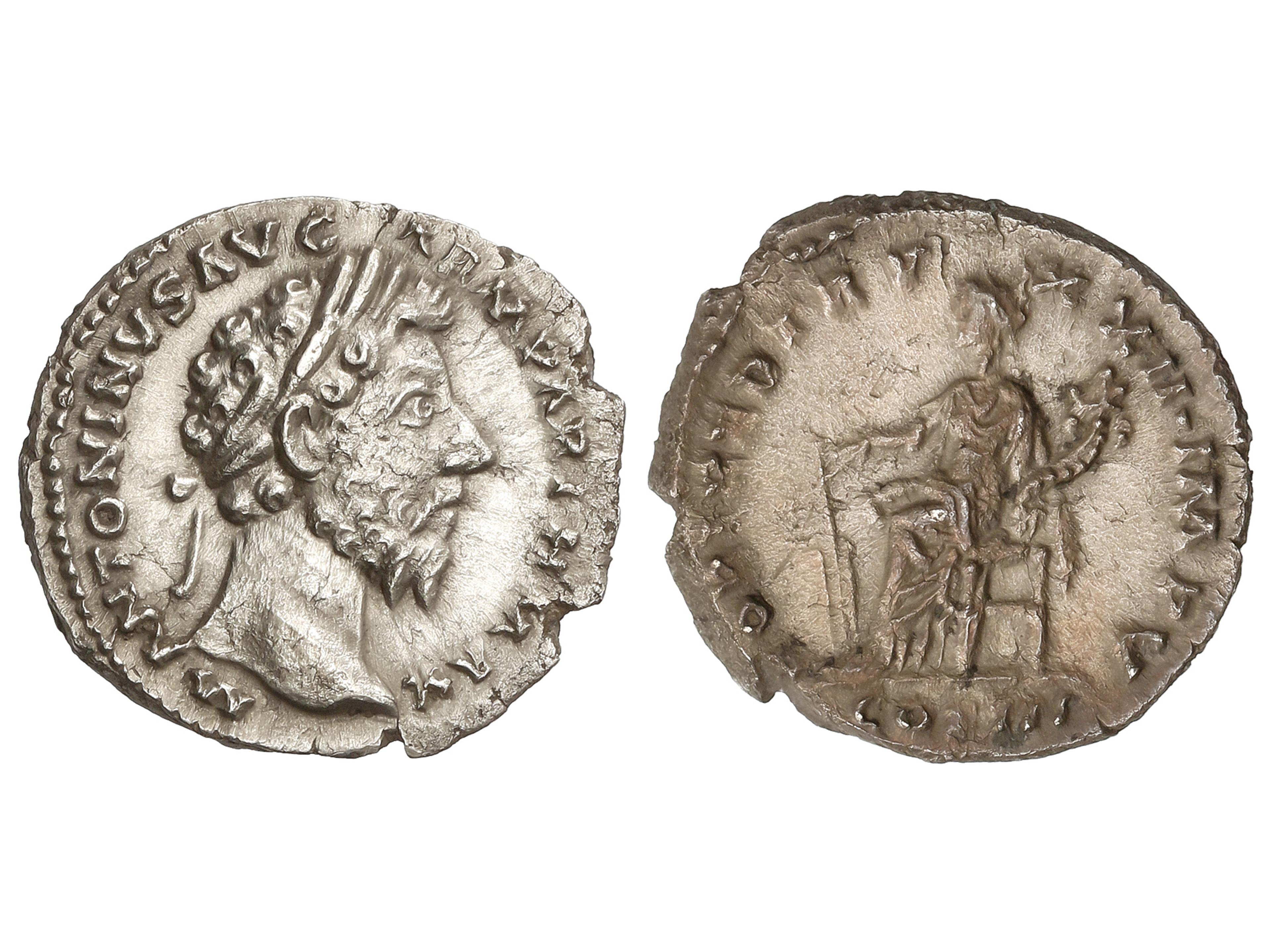 Denario. 168 d.C. MARCO AURELIO. Anv.: M. ANTONINVS AVG. ARM. PARTH. MAX. Cabeza laureada a derecha. Rev.: FORT. RED. TR. P. XXII IMP. V COS. III. Fortuna sentada a izquierda, con timón y cornucopia. 3,46 grs. AR.