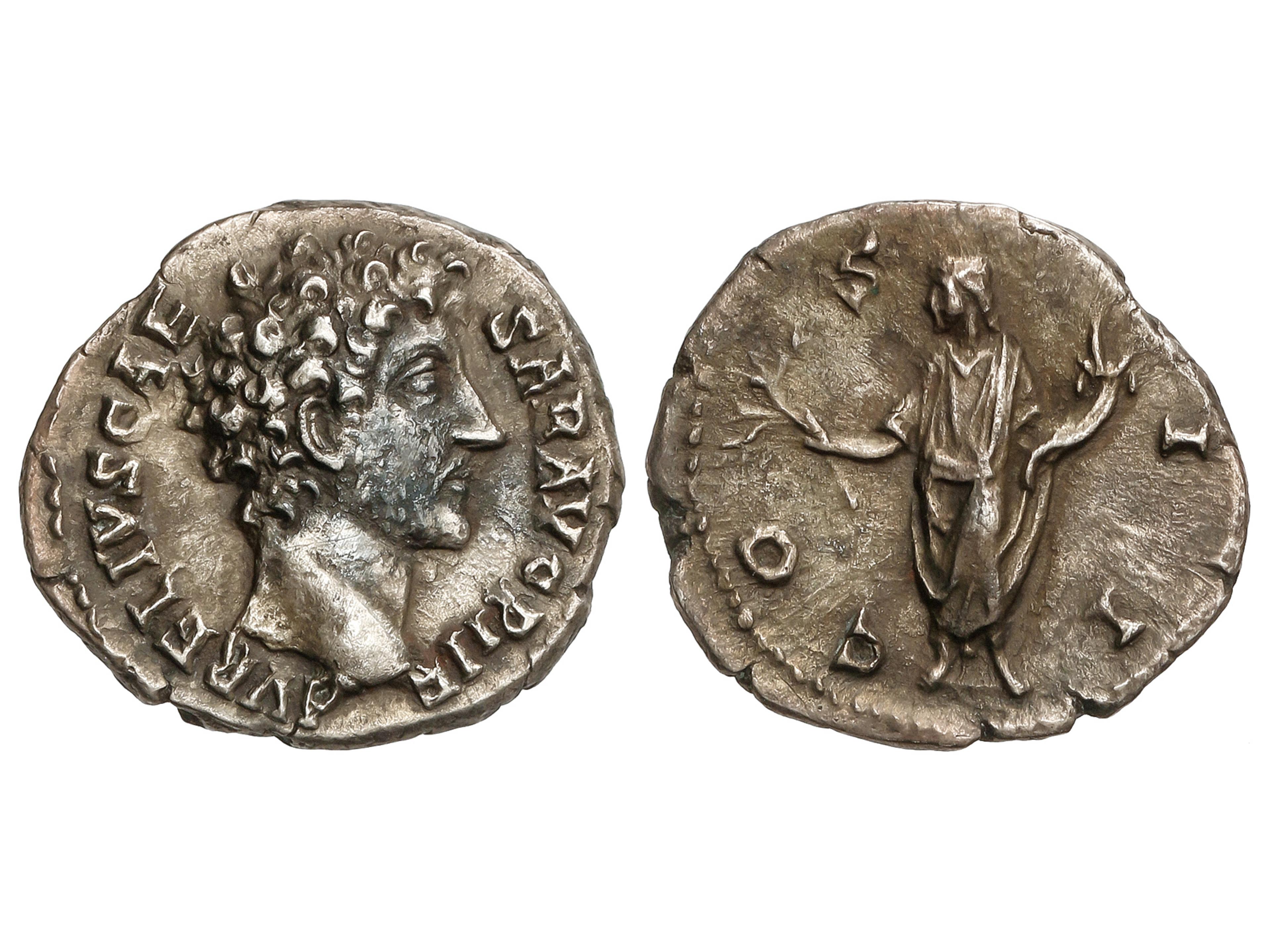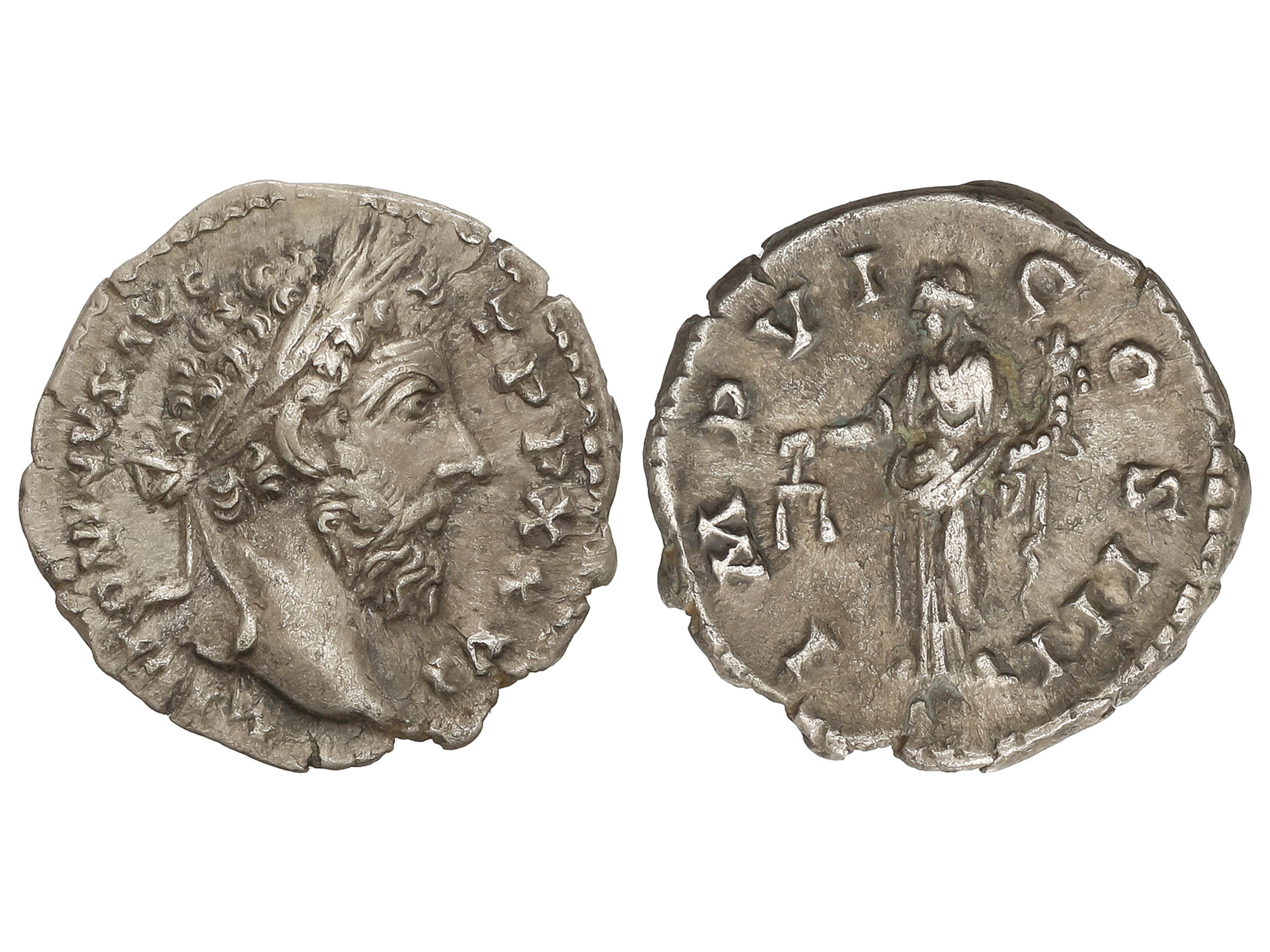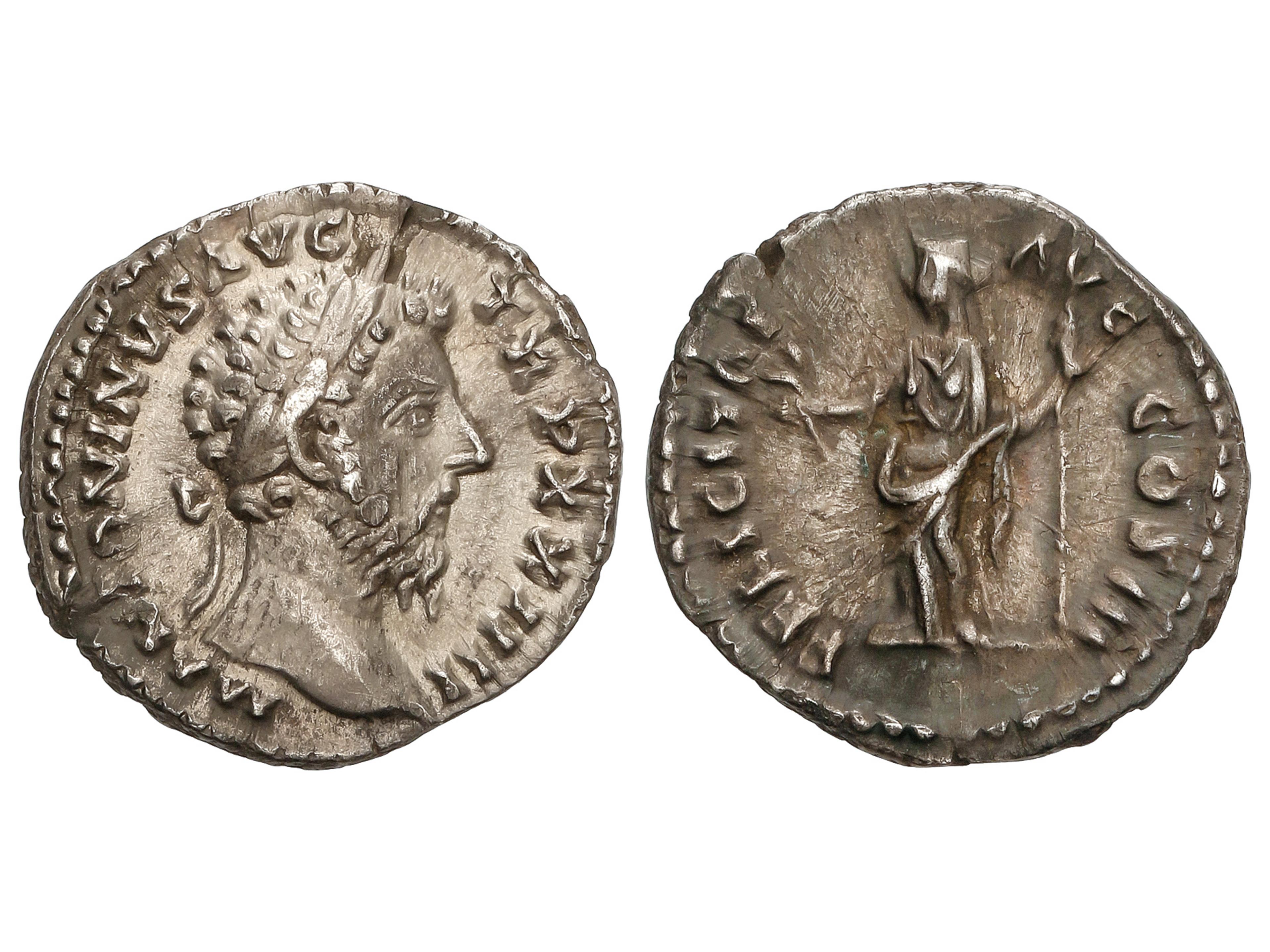 Denario. 171-172 d.C. MARCO AURELIO. Anv.: M. ANTONINVS AVG. TR. P. XXVI. Cabeza laureada a derecha. Rev.: IMP. VI COS. III. Equidad en pie, cabeza a izquierda, con balanza y cornucopia. 3,06 grs. AR. Pátina. C-257.