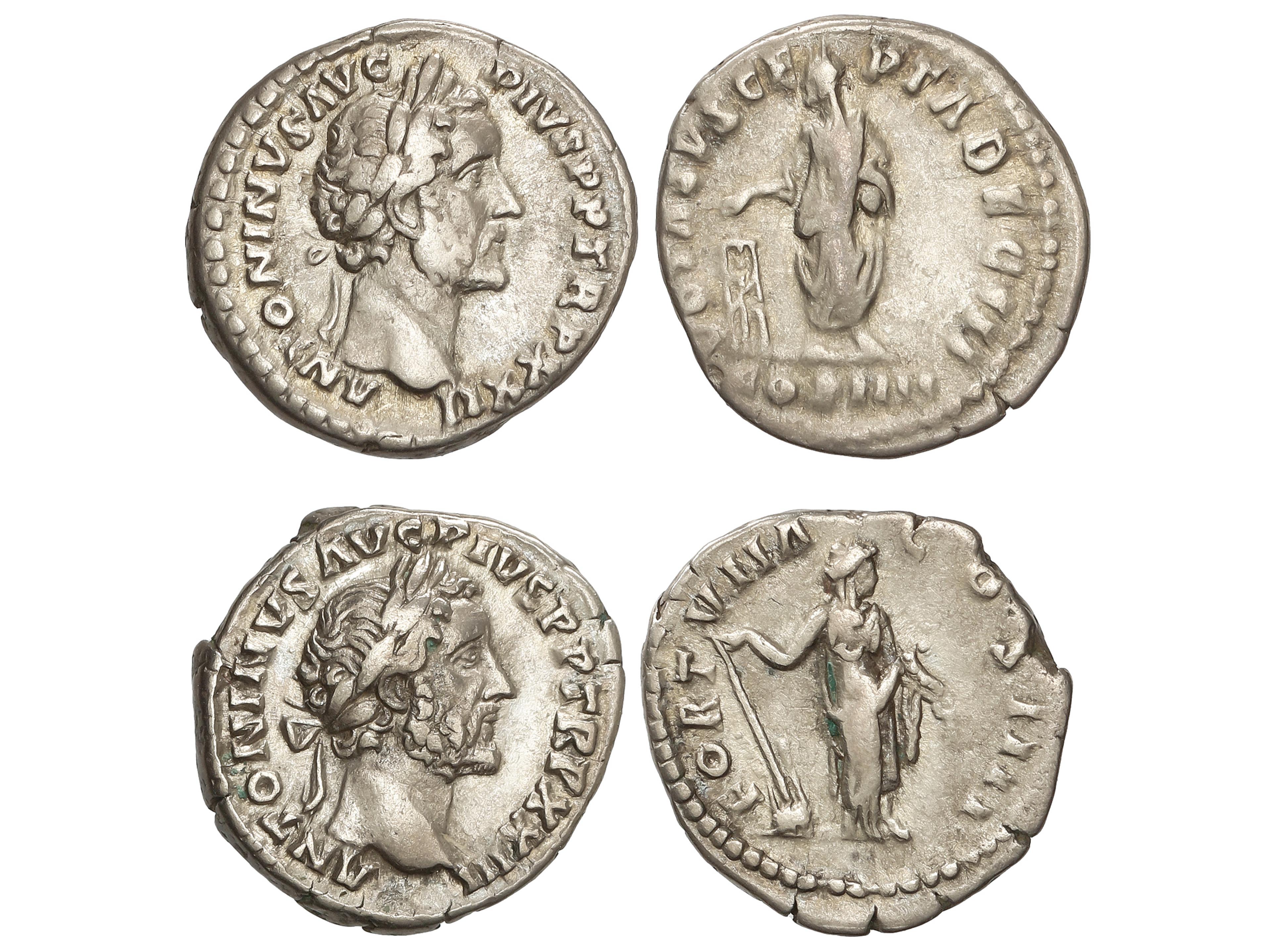 Lote 2 monedas Denario. 159-160 d.C. ANTONINO PÍO. AR. VOTA SVSCEPTA DEC. III COS. IIII C-1126a y FORTVNA COS. IIII C-383. A EXAMINAR. MBC. (Image1)