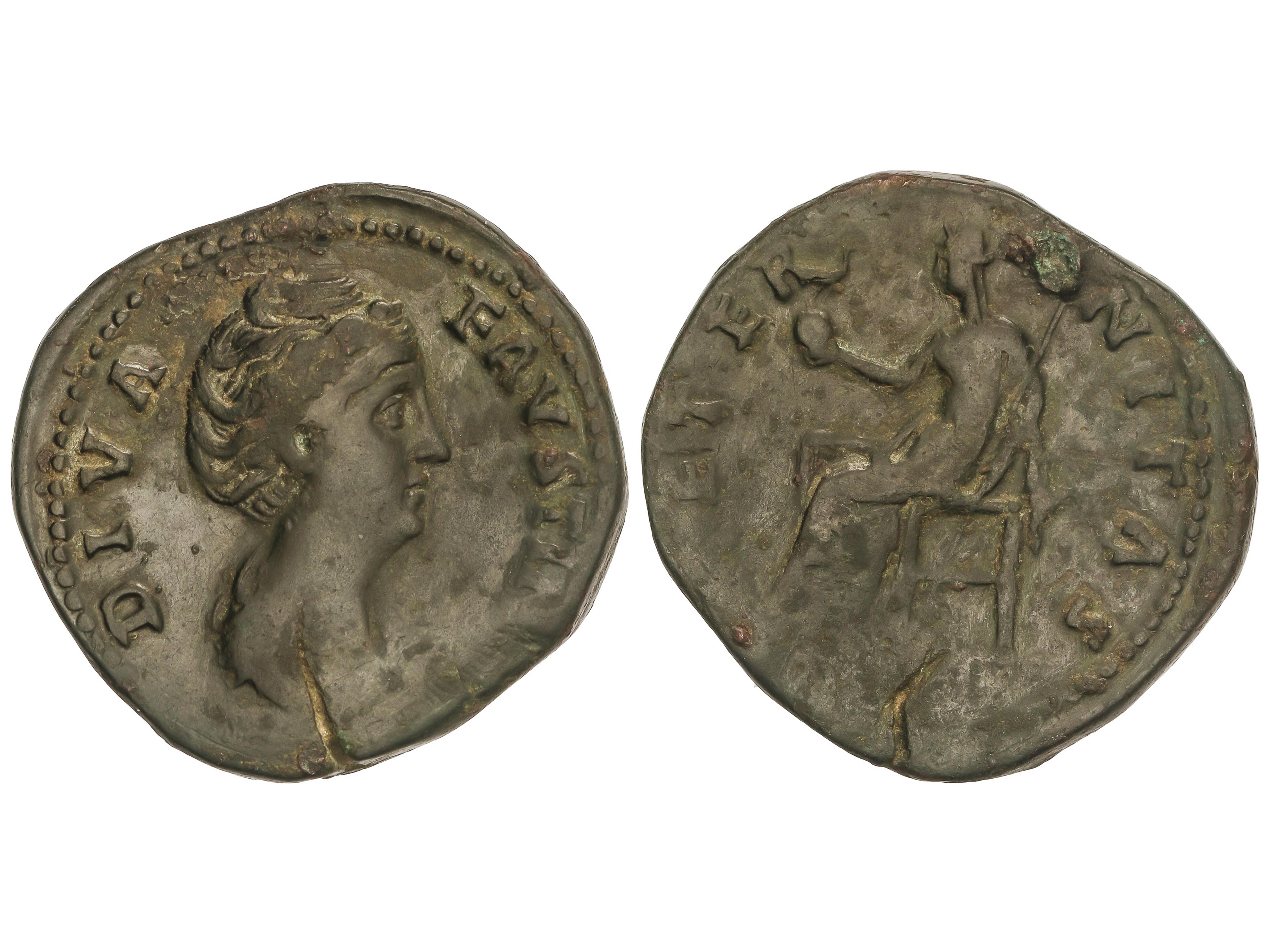 Sestercio. 141 d.C. FAUSTINA MADRE. Anv.: DIVA FAVSTINA. Busto a derecha. Rev.: AETERNITAS. S. C. Eternidad sentada a izquierda sosteniendo Fénix. 28,11 grs. AE. C-20; RIC-1103A; BMC-1482. MBC-. (Image1)