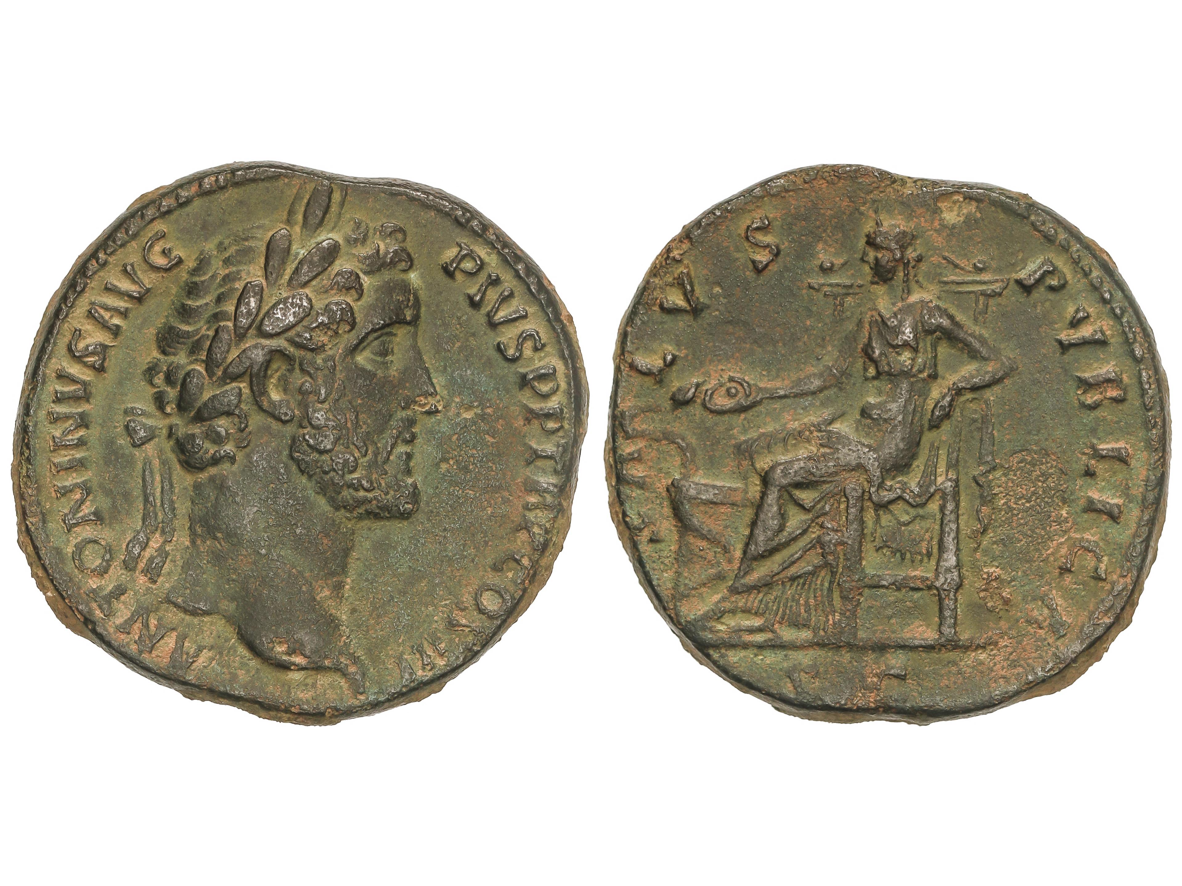 Sestercio. 141-143 d.C. ANTONINO PÍO. Anv.: ANTONINVS AVG PIVS P P TR P COS III. Cabeza laureada a derecha. Rev.: SALVS PVBLICA. Salus sentada a izquierda con patera sobre altar con serpiente, en exergo: SC. 23,66