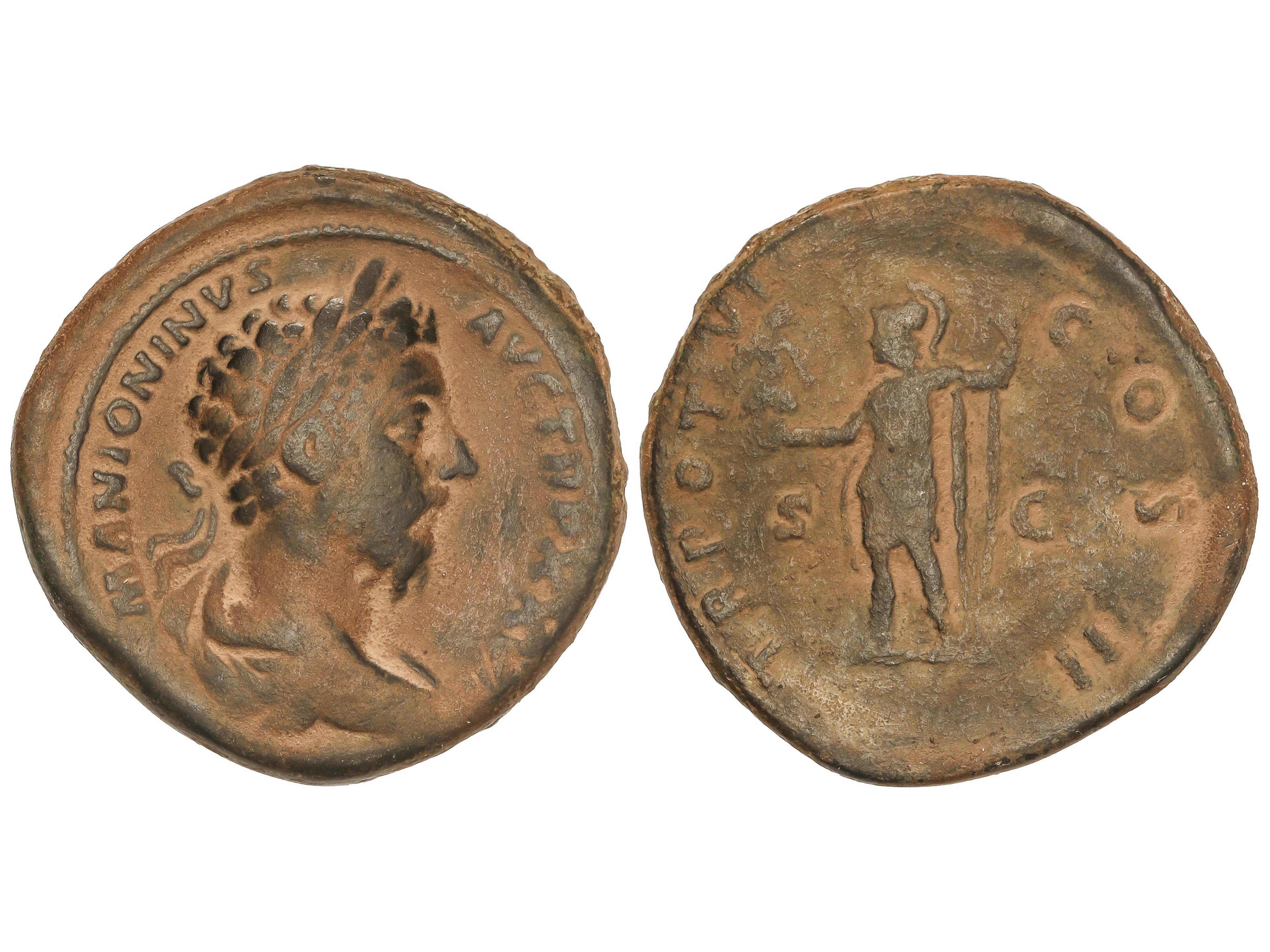 Sestercio. 161-180 d.C. MARCO AURELIO. Anv.: M. ANTONINVS AVG. TR. P. XXVIII. Busto laureado a derecha. Rev.: TR. POT COS VI. COS II. SC. Minerva a izquierda sosteniendo victoria. 27,06 grs. AE. (Algo limpiada).