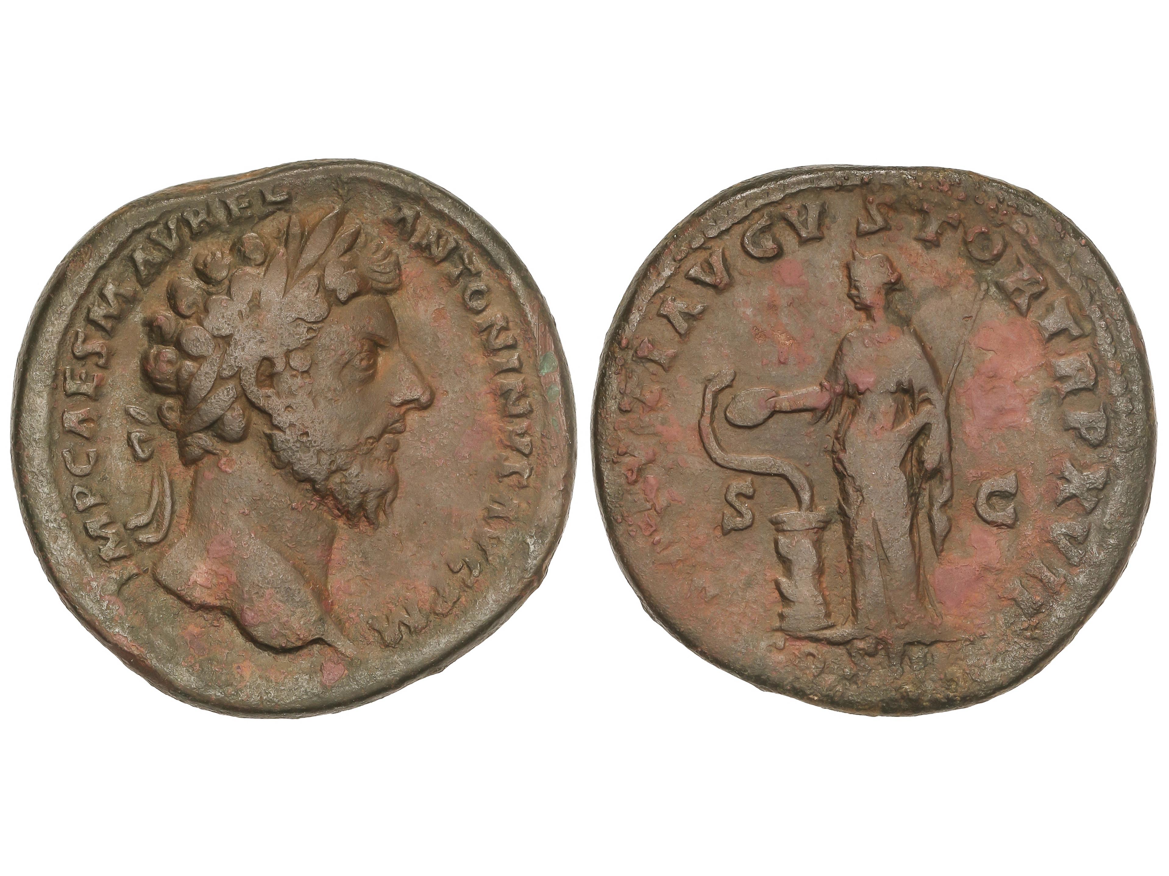 Sestercio. 163 d.C. MARCO AURELIO. Anv.: IMP. CAES. M. AVREL. ANTONINVS AVG. P. M. Cabeza laureada a derecha. Rev.: SALVTI AVGVSTOR TR. P. XVII COS. III S. C. Salud en pie a izquierda dando de comer a una serpiente,