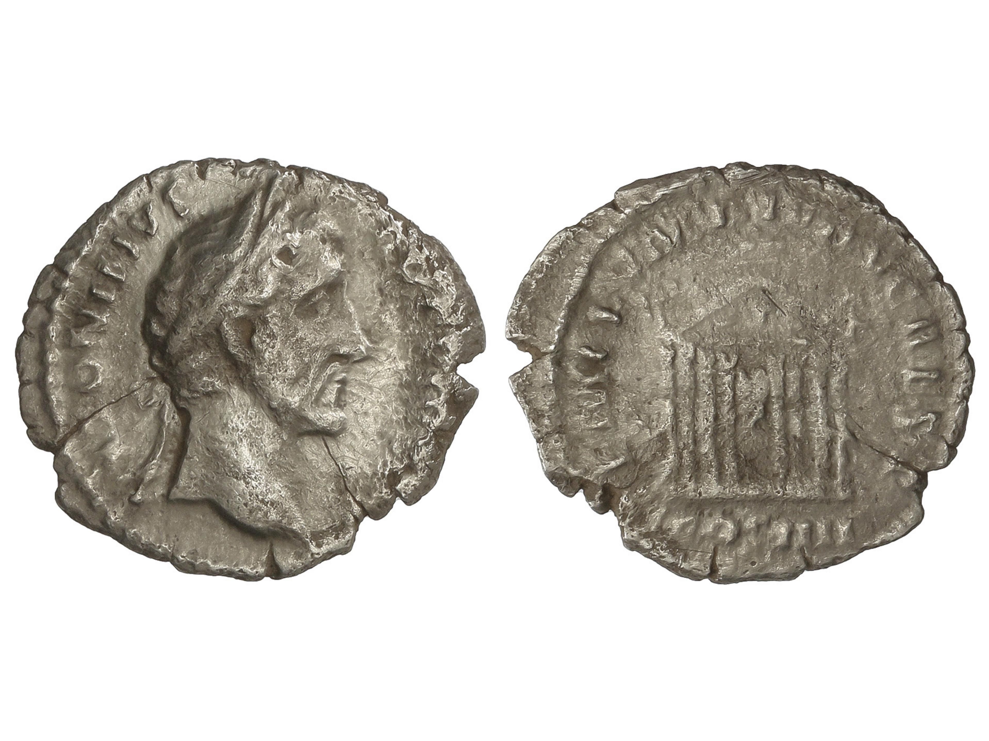 Denario. 158-159 d.C. ANTONINO PÍO. Anv.: ANTONINVS AVG. PIVS P. P. TR. P. XXII. Cabeza laureada a derecha. Rev.: TEMPLVM DIV. AVG. REST. COS. IIII. Templo octástilo con las figuras sentadas de Augusto y Livia. 2,29