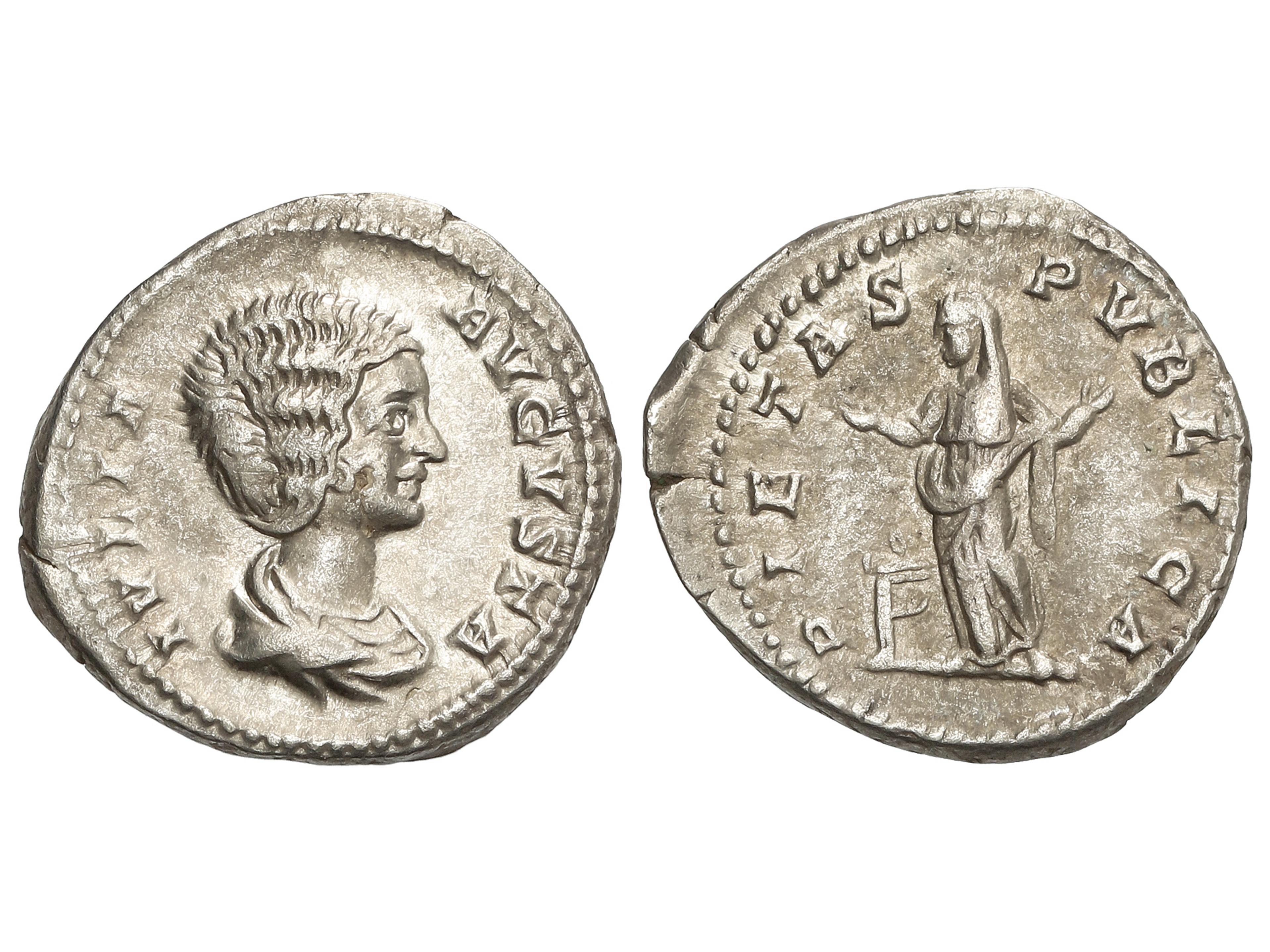 Denario. 196-211 d.C. JULIA DOMNA. Anv.: IVLIA AVGVSTA. Busto drapeado a derecha. Rev.: PIETAS PVBLICA. Piedad en pie, delante altar. 3,56 grs. AR. C-156; RIC-574. EBC-/MBC+. (Image1)