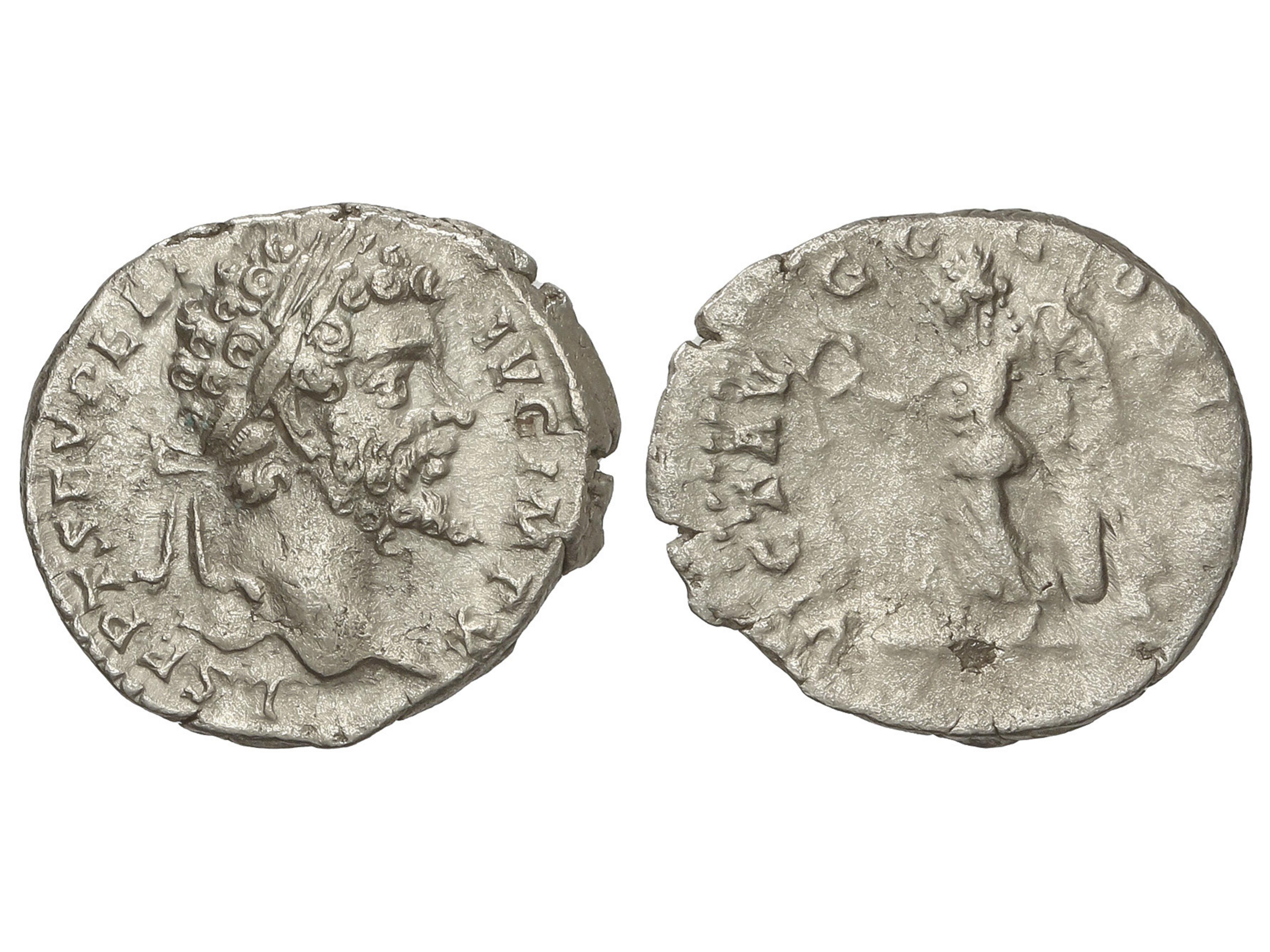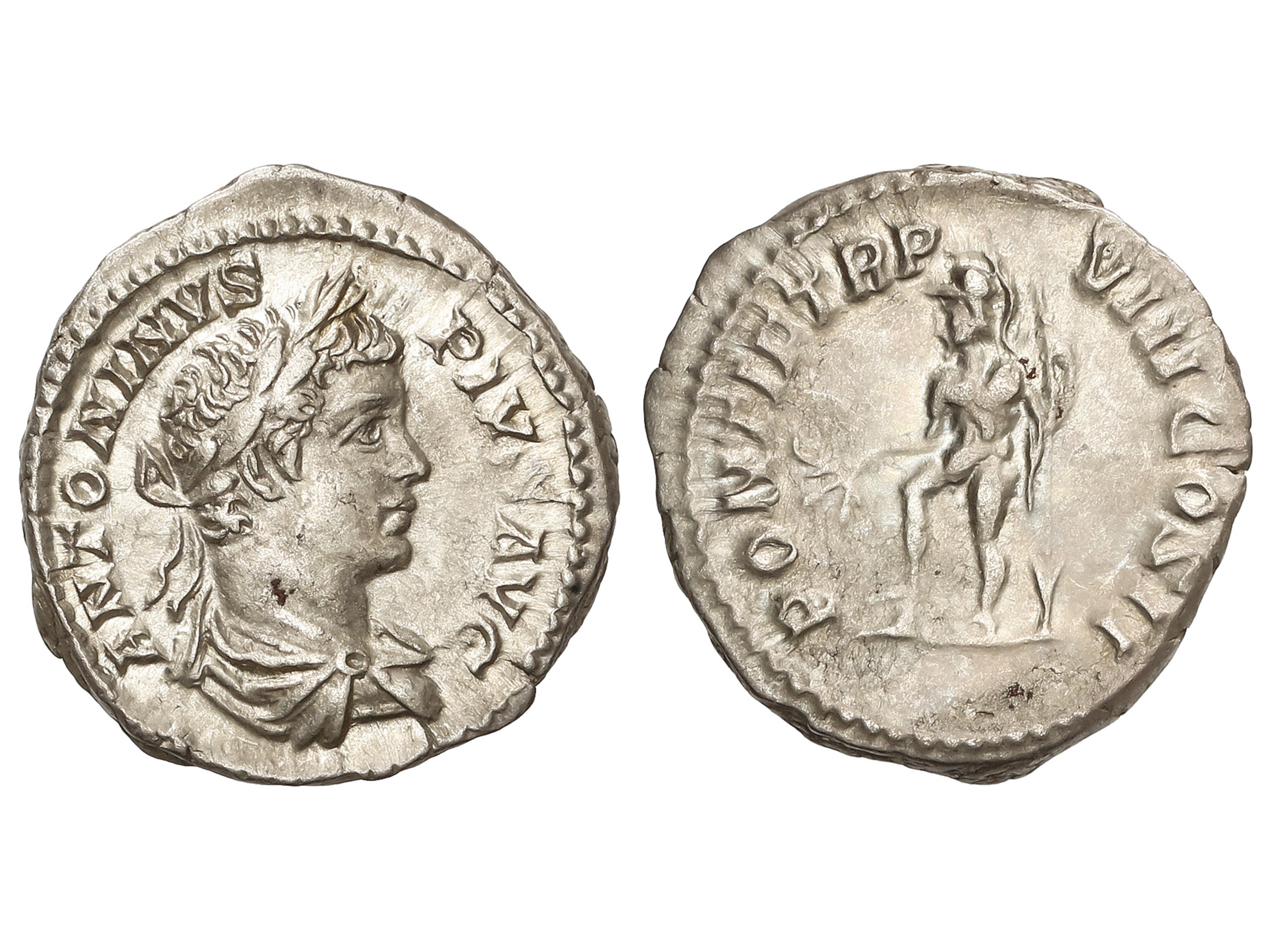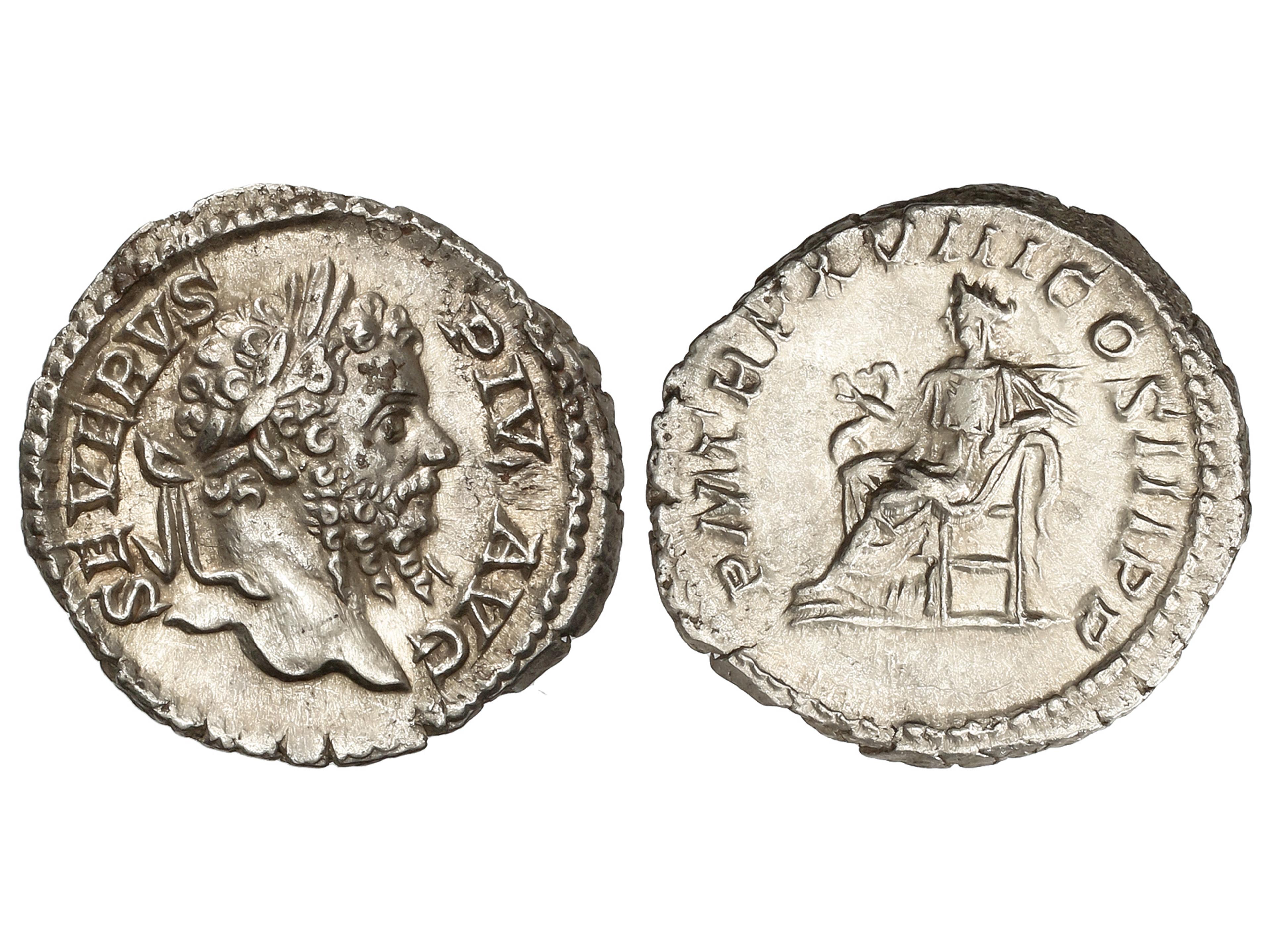 Denario. 210 d.C. SEPTIMIO SEVERO. Anv.: SEVERVS PIVS AVG. Cabeza laureada a derecha. Rev.: P. M. TR. P. XVIII COS. III PP. Salud sentada a la izquierda, alimentando a una serpiente. 3,16 grs. AR. C-548; RIC-236.