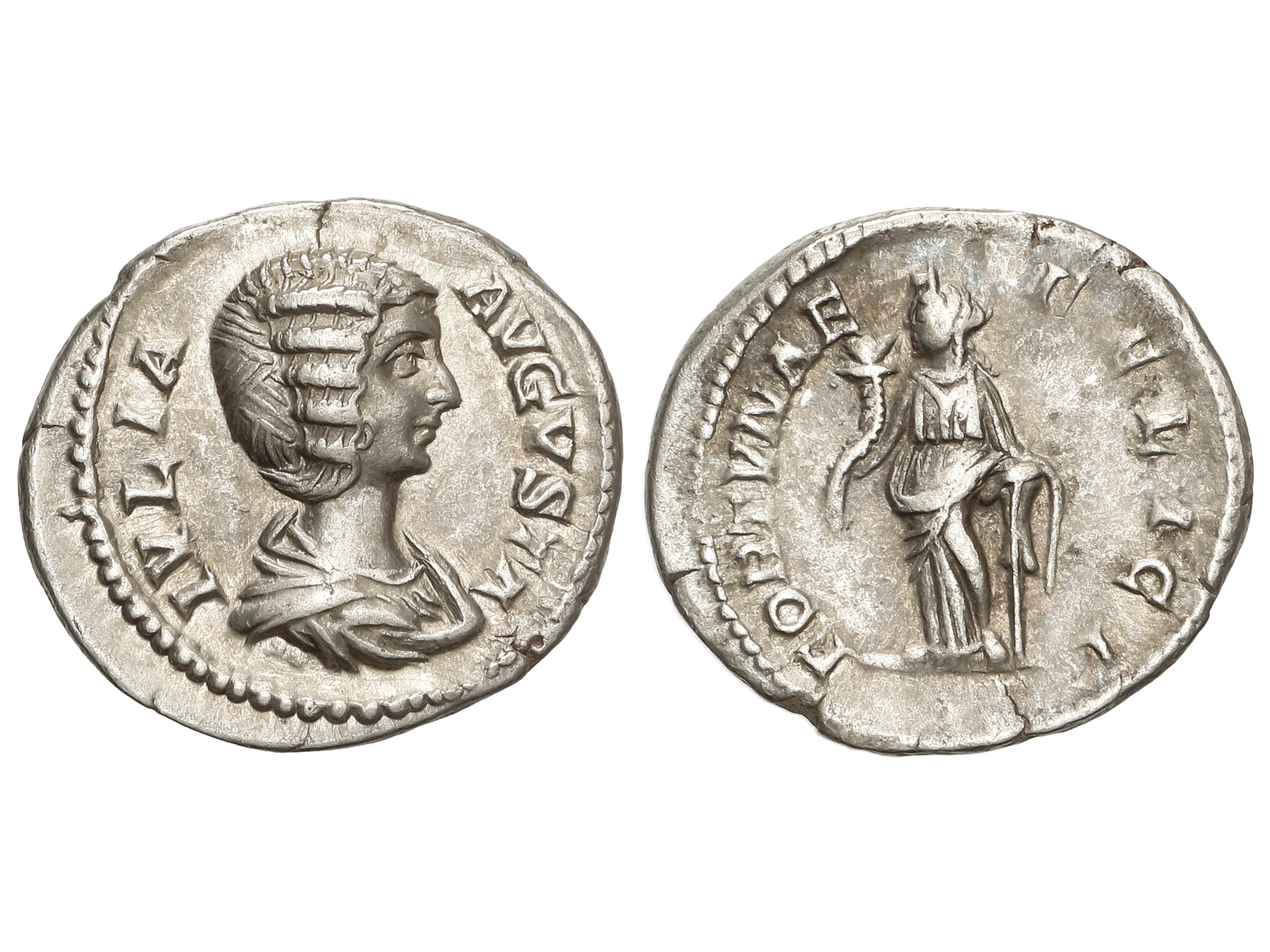 Denario. 196-211 d.C. JULIA DOMNA. Anv.: IVLIA AVGVSTA. Busto drapeado a derecha. Rev.: FORTUNAE FELICI. Fortuna en pie con cornucopia. 3,40 grs. AR. C-55; RIC-552 (Septimio Severo); BMC-24 (Septimio Severo).