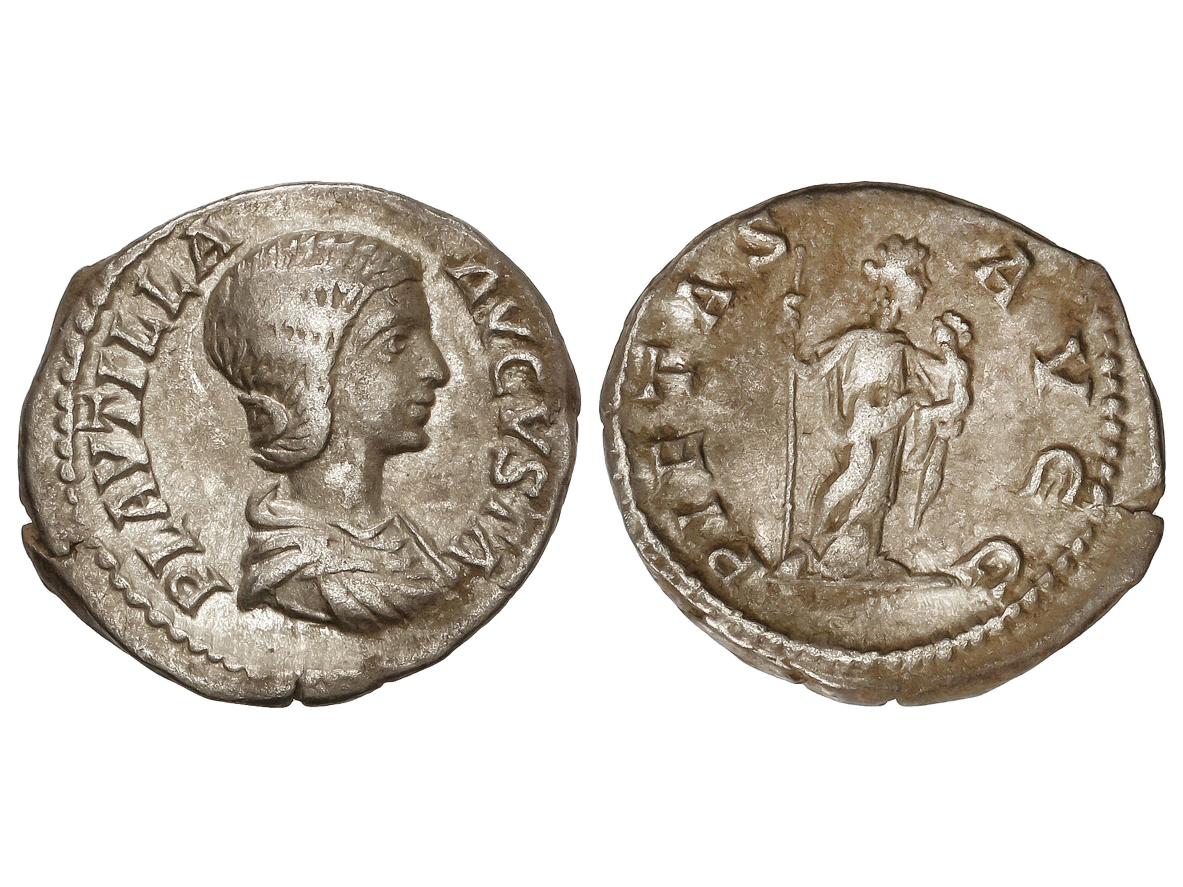 Denario. 212 d.C. PLAUTILLA. Anv.: PLAVTILLAE AVGVSTAE. Busto a derecha. Rev.: CONCORDIAE AETERNAE. Caracalla y Plautilla en pie frente a frente. 3,61 grs. AR. C-10; RIC-361. MBC+. (Image1)