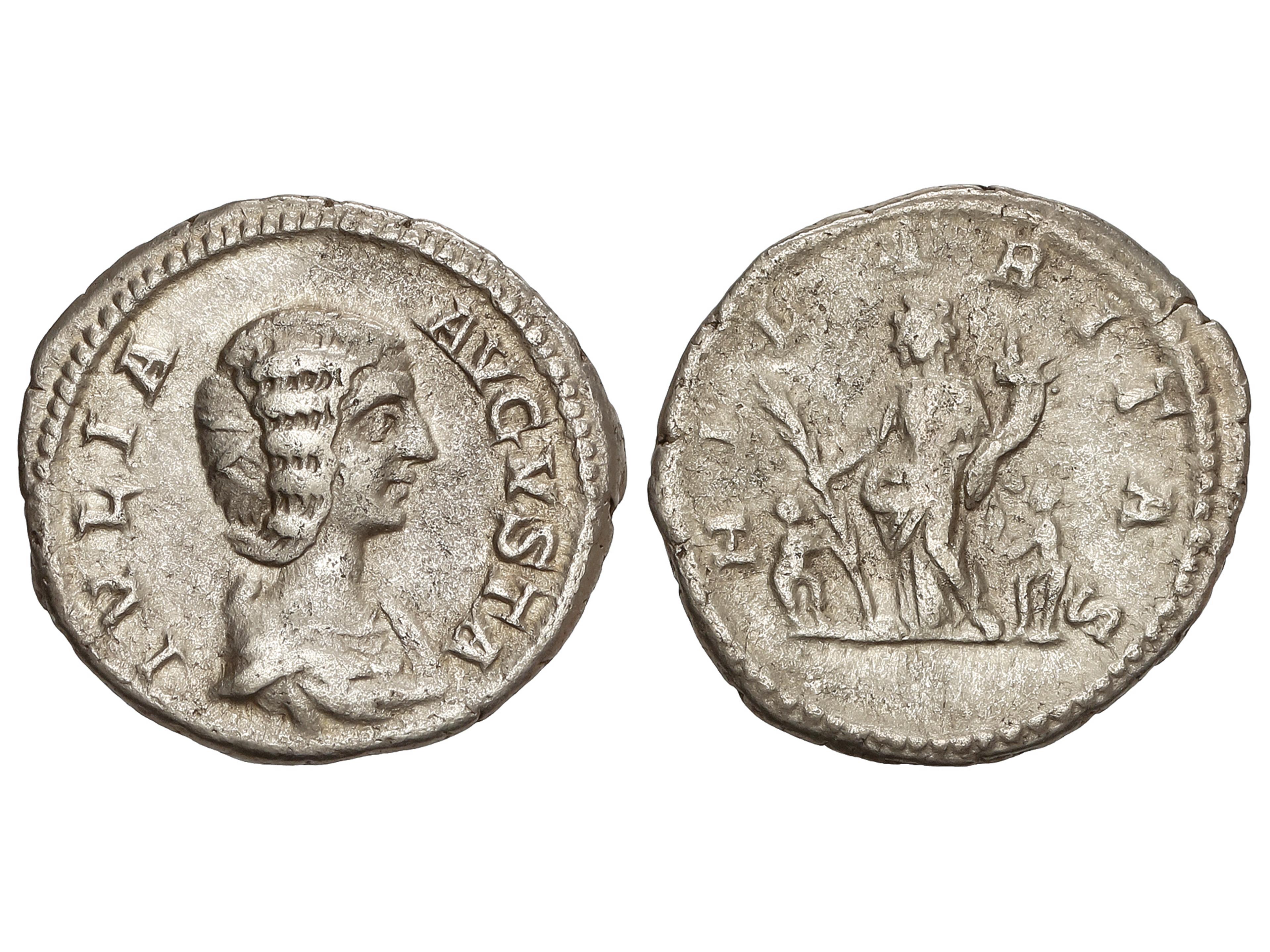 Denario. 196-211 d.C. JULIA DOMNA. Anv.: IVLIA AVGVSTA. Busto drapeado a derecha. Rev.: HILARITAS. Hilaridad en pie entre dos niños, con palma y cornucopia. 3,22 grs. AR. C-79; RIC-557 (Septimio Severo); BMC-34