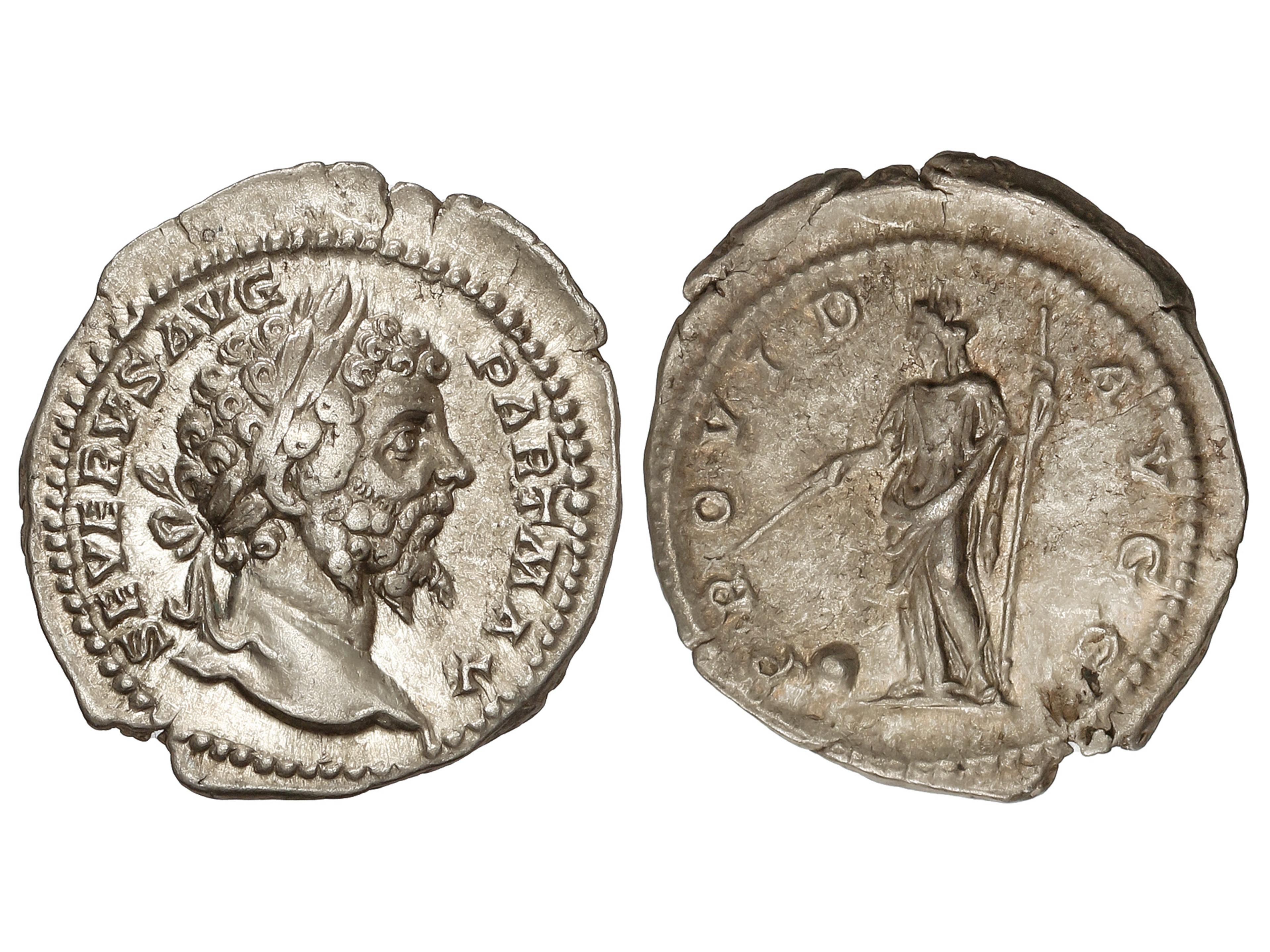 Denario. 201 d.C. SEPTIMIO SEVERO. Anv.: SEVERVS AVG. PART. MAX. Cabeza laureada a derecha. Rev.: PROVID. AVGG. Providencia en pie a izquierda con varita y cetro. 3,24 grs. AR. C-586; RIC-166; BMC-197-9.