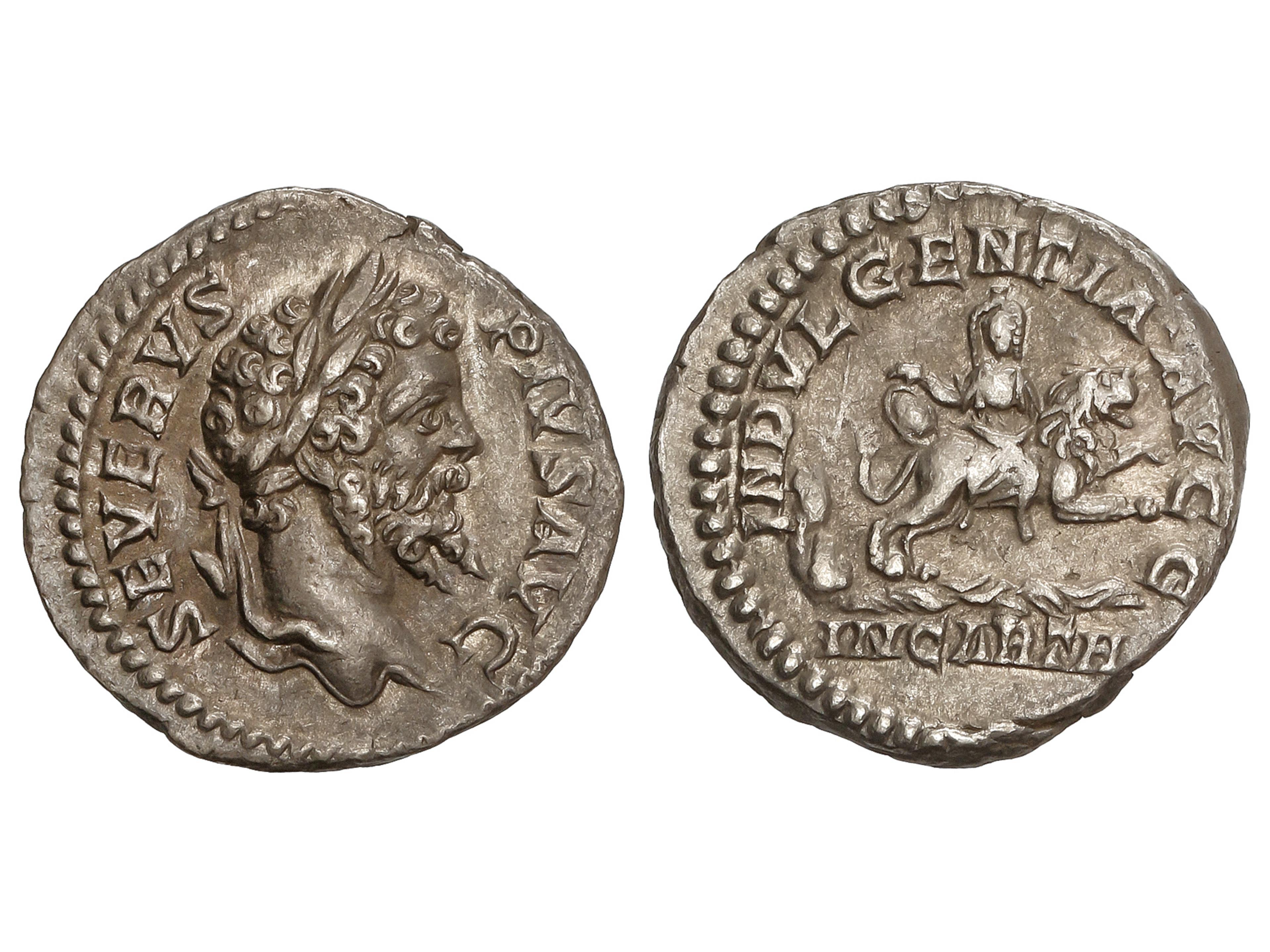 Denario. 202-210 d.C. SEPTIMIO SEVERO. Anv.: SEVERVS PIVS AVG. Cabeza laureada a derecha. Rev.: INDVLGENTIA AVGG. IN CARTH. Diosa Celeste a lomos de un león a derecha, portando haz de rayos y cetro. 3,20 grs. AR.
